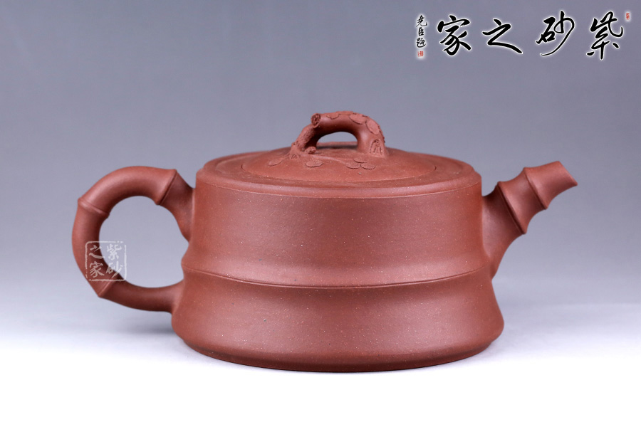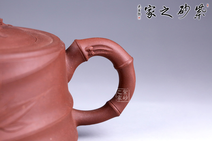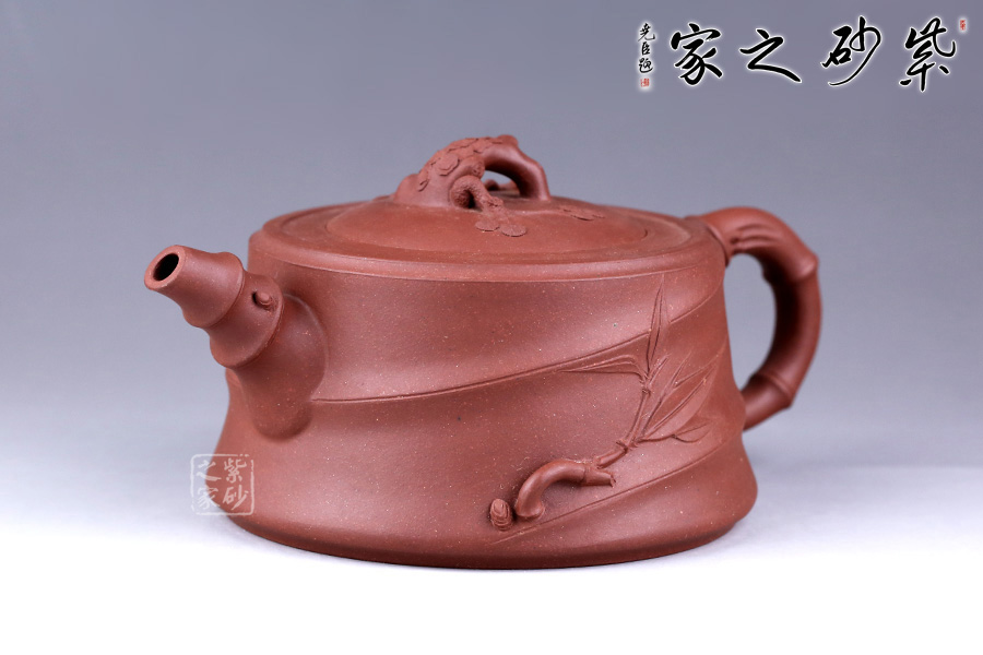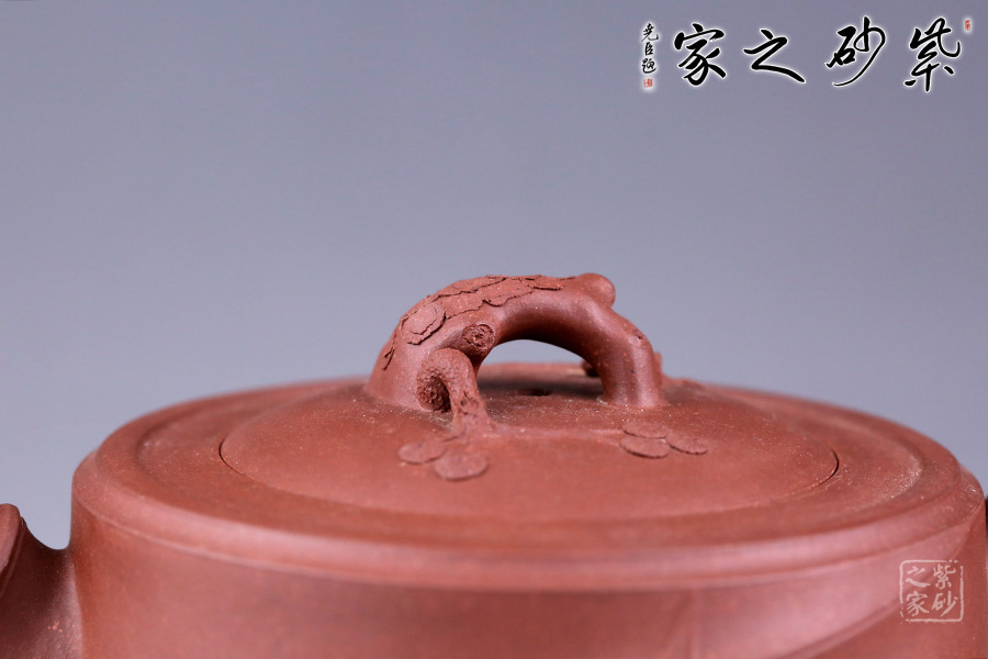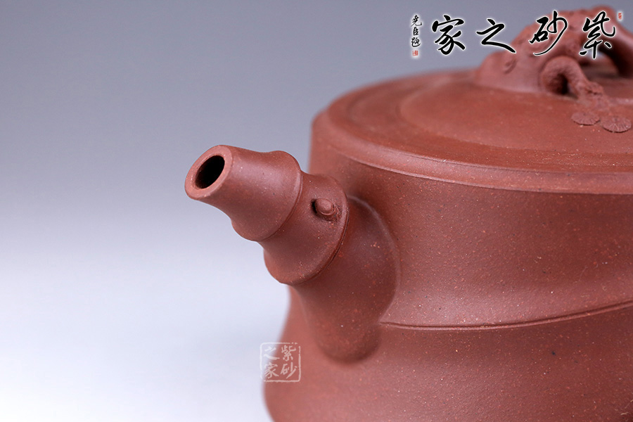 此壺器型端莊雅致,泥質(zhì)細膩,壺身以梅樁為造型,小枝自壺身胥出,甚是生動,形象自然。壺嘴、壺把竹節(jié)造型竹韻悠悠,清秀動人。壺蓋略微隆起,松樁造型的壺鈕搭接呈橋形。此壺極現(xiàn)生態(tài)之美,頗有大自然的氣息。