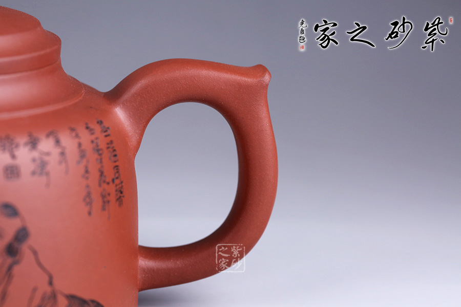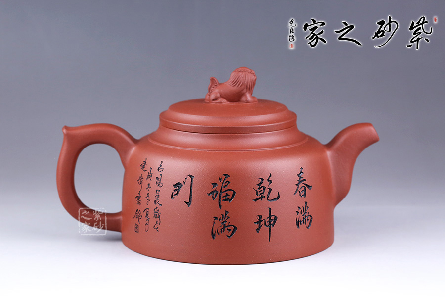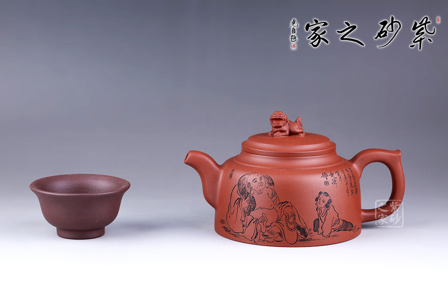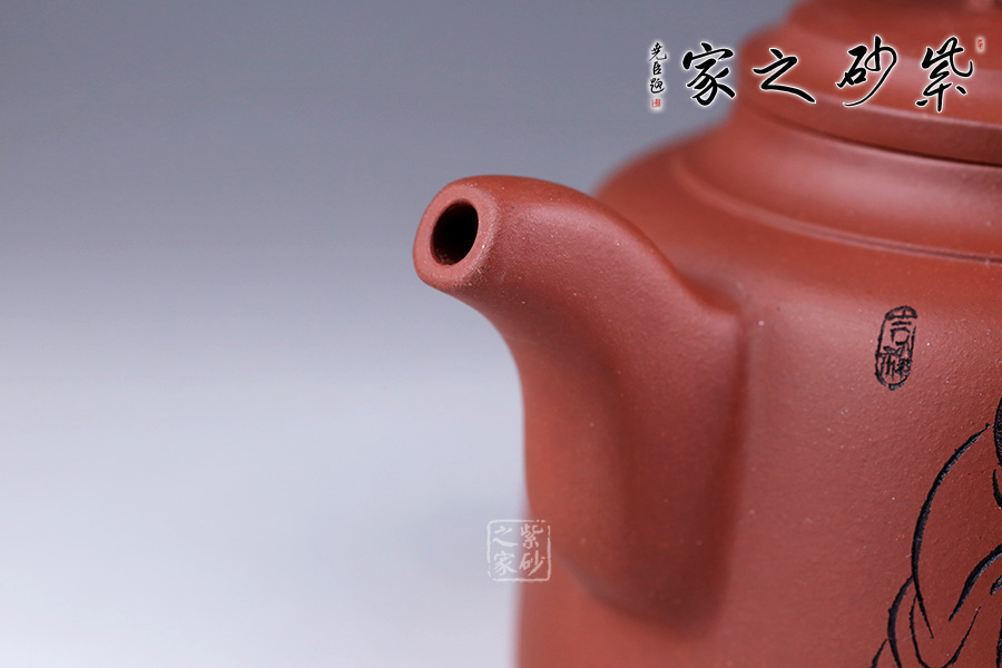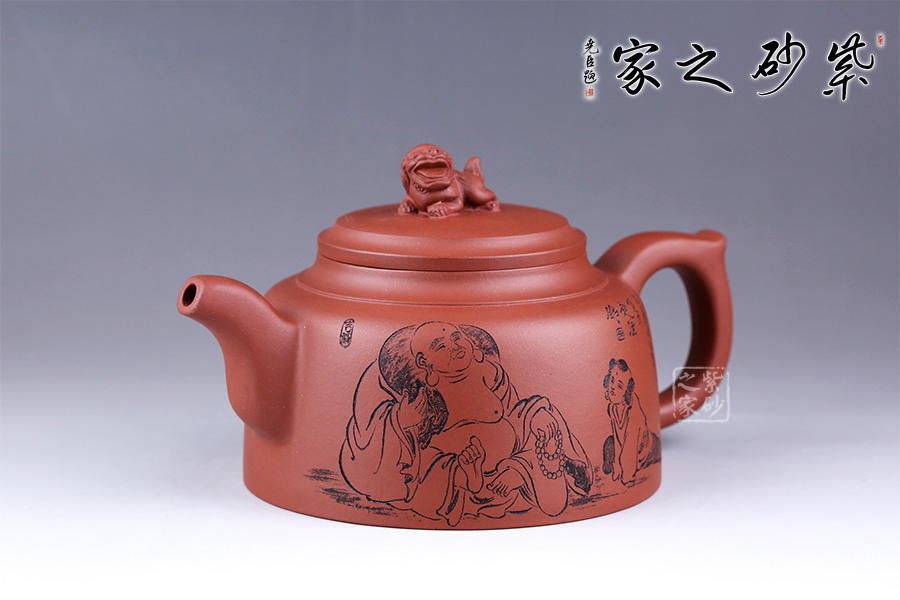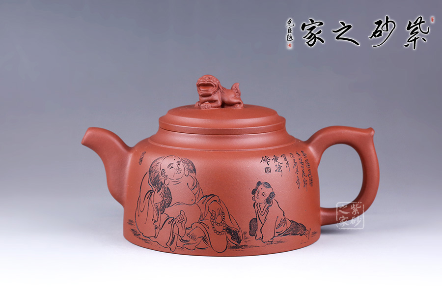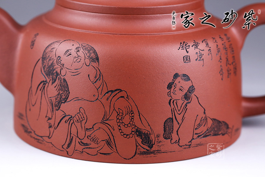 此壺穩(wěn)實(shí)敦厚,形制古樸,端莊穩(wěn)重。壺身上窄下寬更顯沉穩(wěn),壺面裝飾乃朱建偉老師親自篆刻,正面篆刻“喜福同樂”圖,笑佛與孩童歡言笑語,快樂自在之感油然而生,作者清晰的線條作出此畫,傳遞快樂的正能量;反面篆刻“春滿乾坤福滿門”,可謂天地萬物布滿春色,家家戶戶也洋溢著幸福的喜慶!