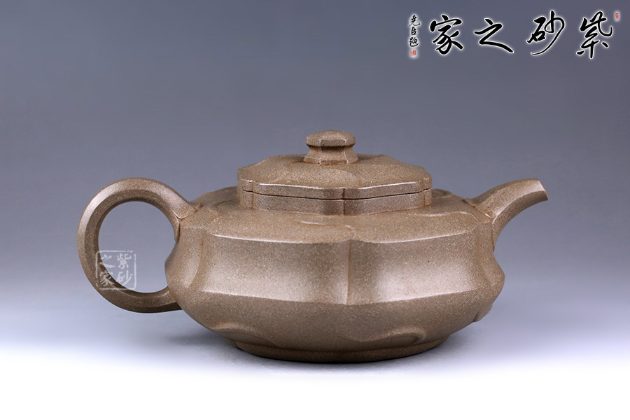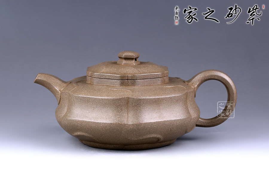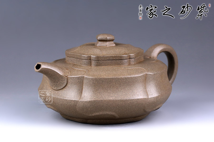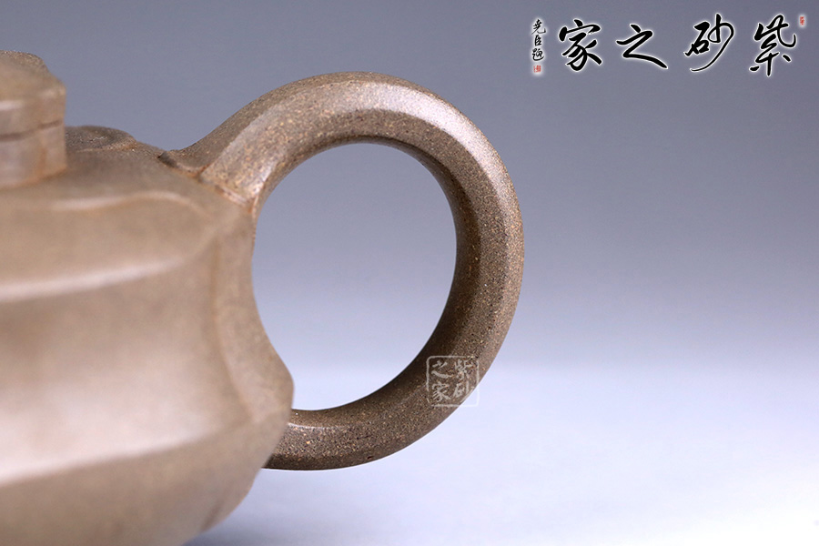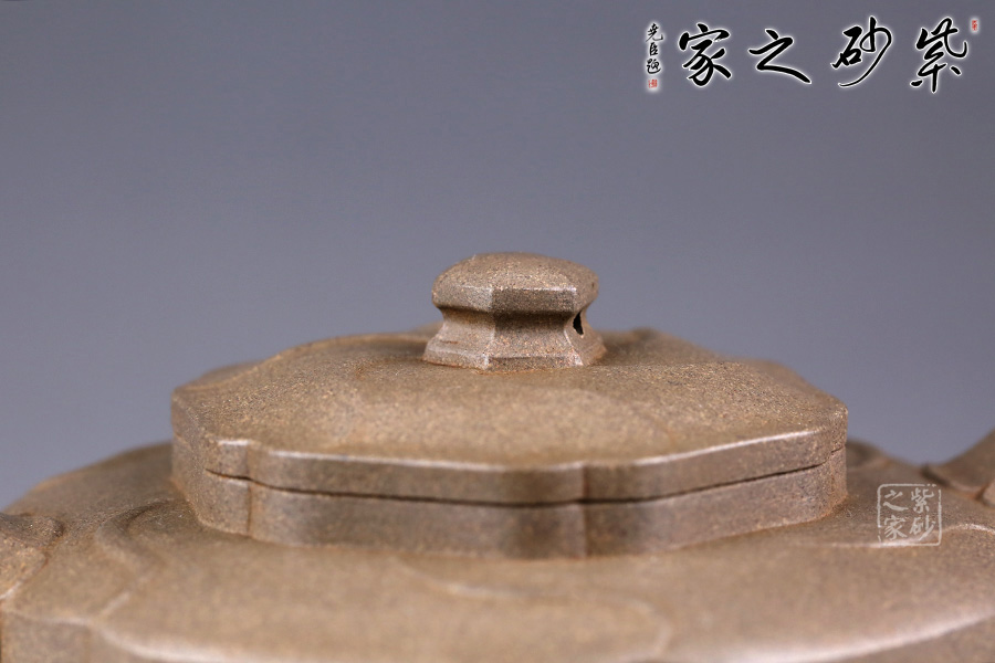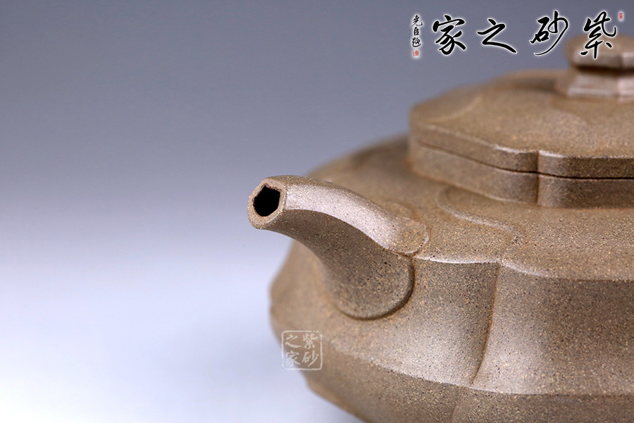 整器形體扁圓而飽滿,口頸處理稍挺,呈現(xiàn)出精神抖擻的氣質(zhì)。通體以葵花為式,形態(tài)自然逼真,千瓣參差,向背分明,線條回旋生動、流轉(zhuǎn)綿延。壺身及壺蓋飾以形態(tài)多姿的葵葉,乃取風(fēng)勢,偃仰翻轉(zhuǎn),盡顯勁逸。一彎嘴干脆利索,出水順暢,倒耳把則更顯細(xì)膩自然。觀之整器,別致小巧,宜賞宜用。