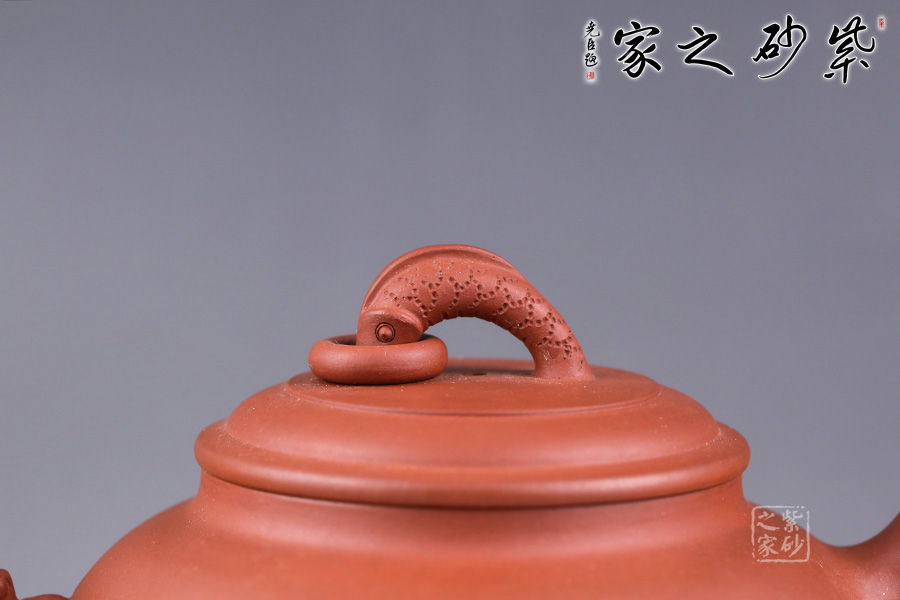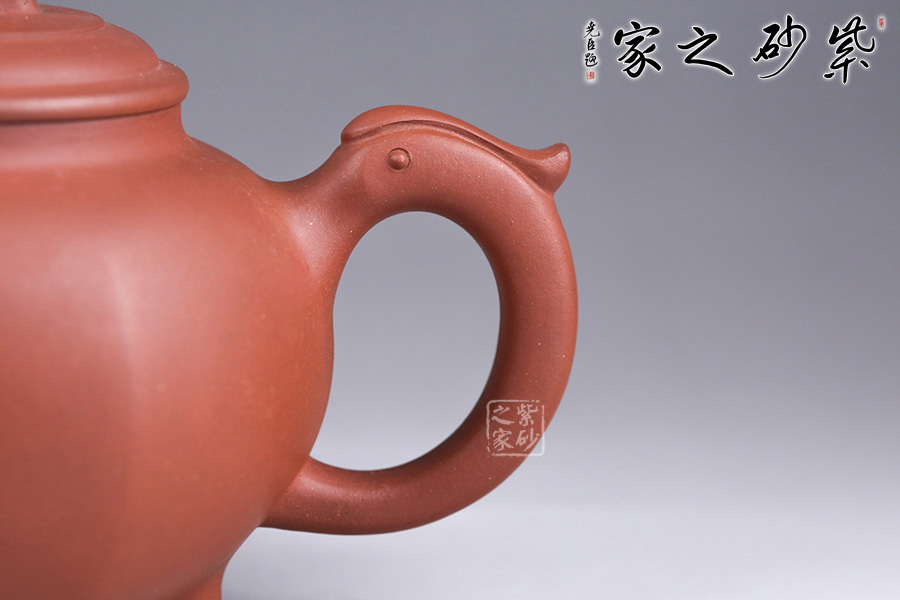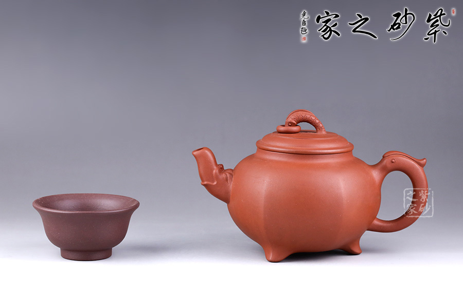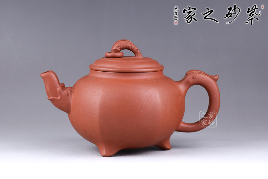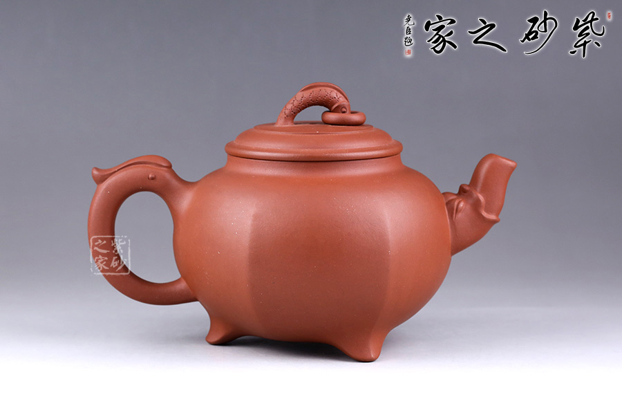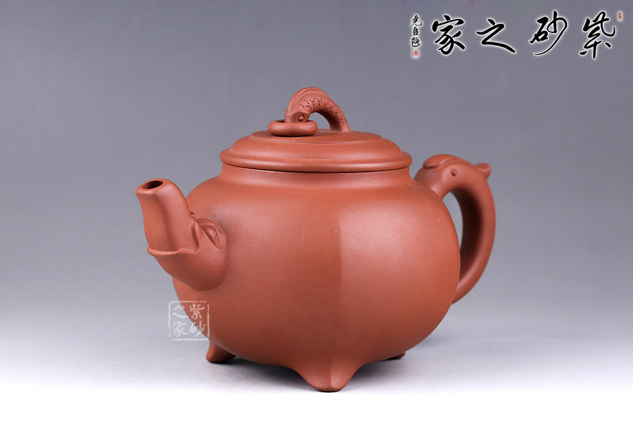 此壺名為“三腳龍鳳”,以龍鳳為主題,寓意吉祥和如意。壺嘴、壺把均以龍嘴為原型制作而成,韻味非凡。壺鈕為龍,出水之姿簡單生動,加環(huán)裝飾更見構(gòu)思巧妙。三鼎足設(shè)計,形狀小巧典雅,與壺身筋紋連接一起,輪廓飽滿,增添了更多氣韻。
