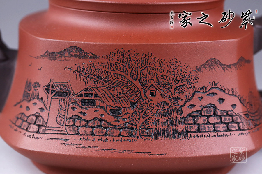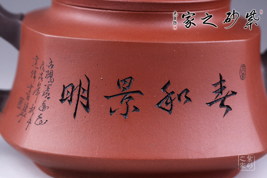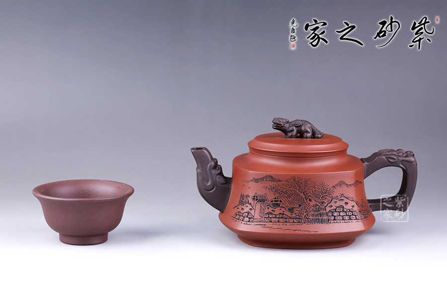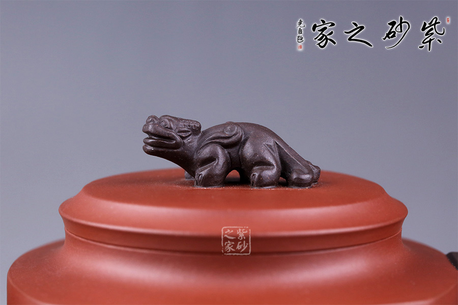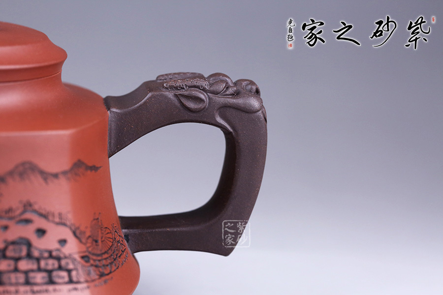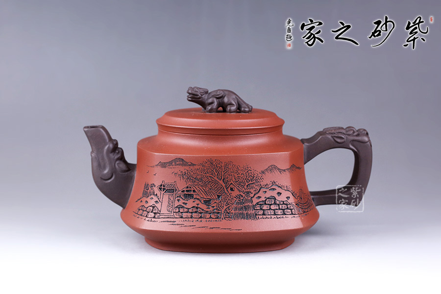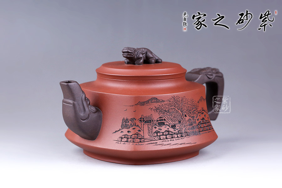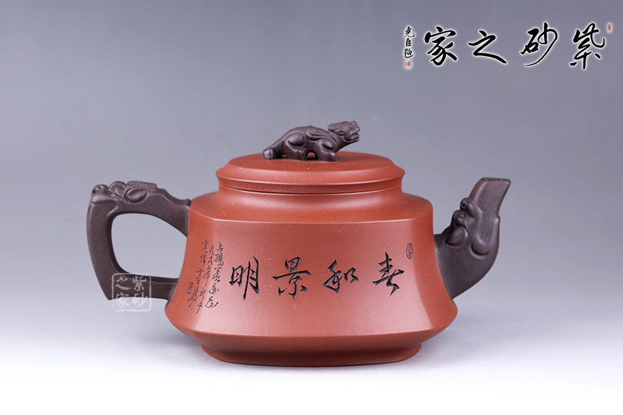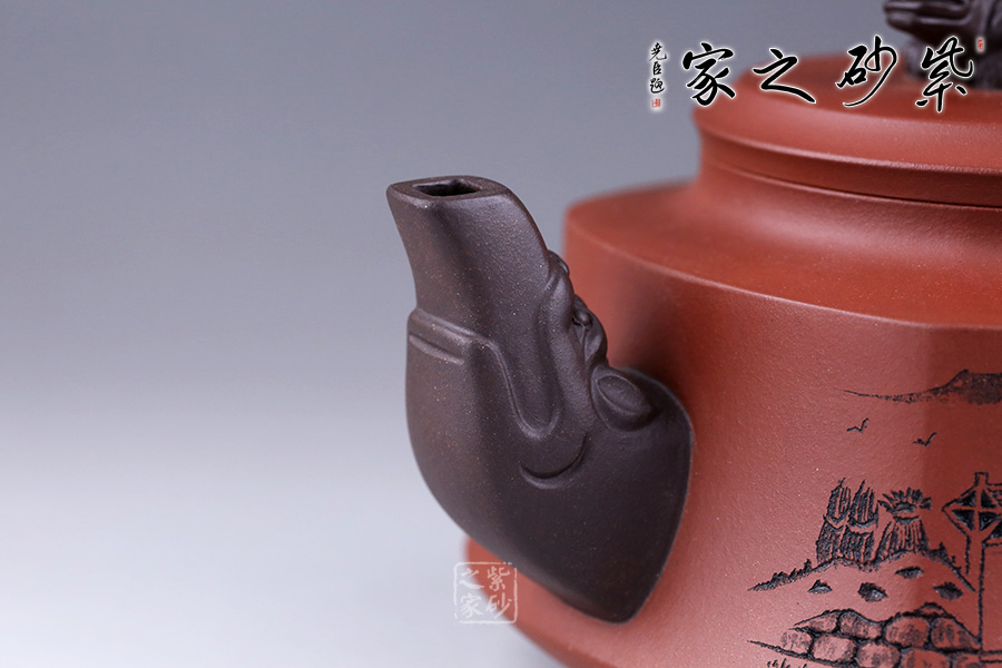 此壺采用朱建偉老師最擅長(zhǎng)的雙色泥制作手法,泥色運(yùn)用恰到好處,整體端莊大氣。 壺身外撇,過渡平滑洗練,線條美感十足。壺面詩(shī)詞景色,刻畫精美,韻味十足。壓蓋設(shè)計(jì),瑞獸壺鈕栩栩如生,富有工藝美感。彎流嘴壺把從壺身胥出,皆龍形,線條柔和而生動(dòng)。整器周正,似一件沉穩(wěn)的藝術(shù)品,發(fā)人深想。
