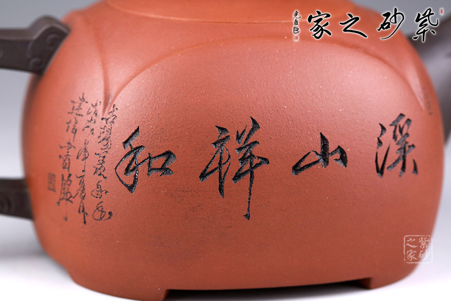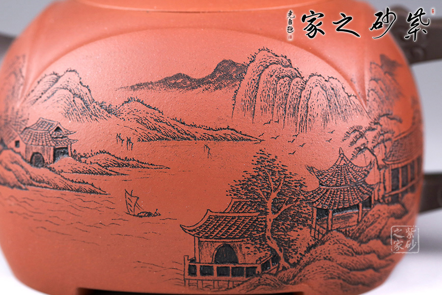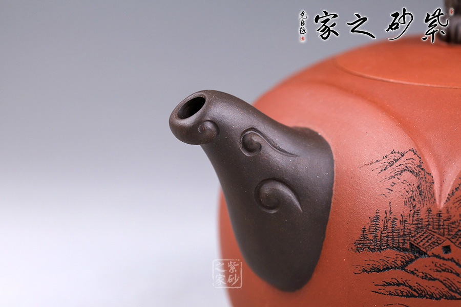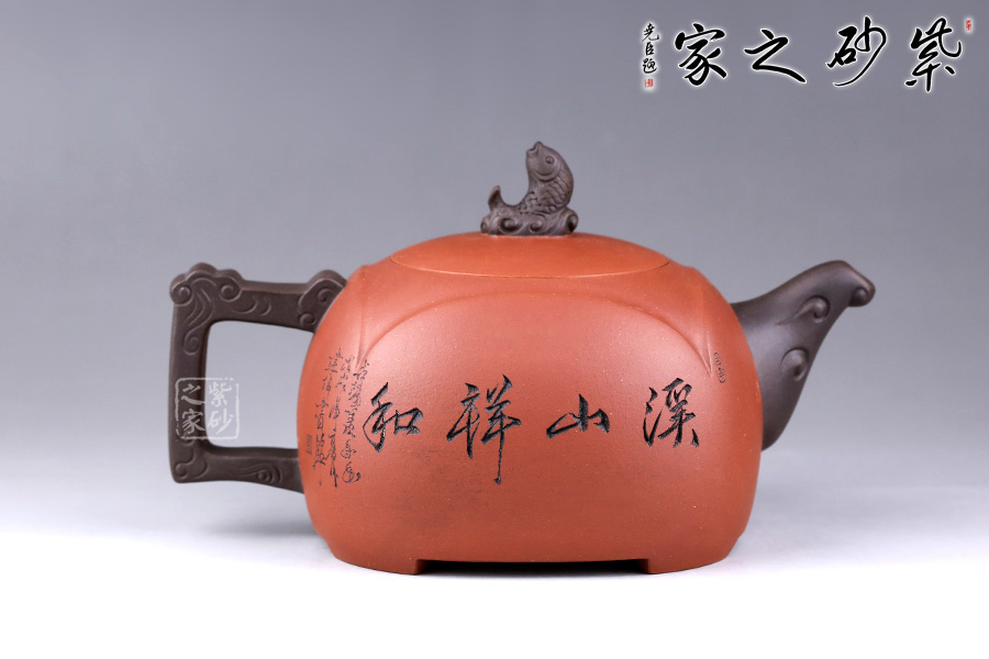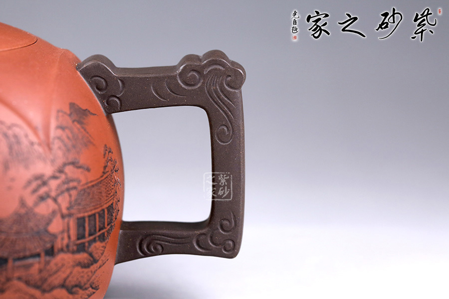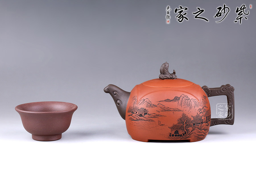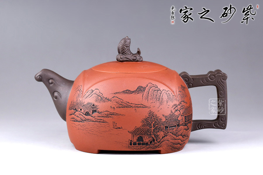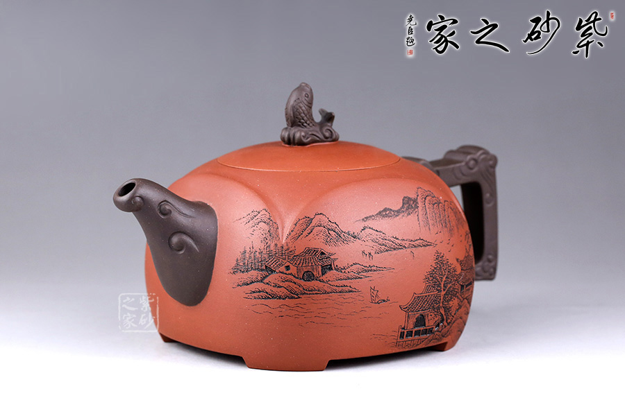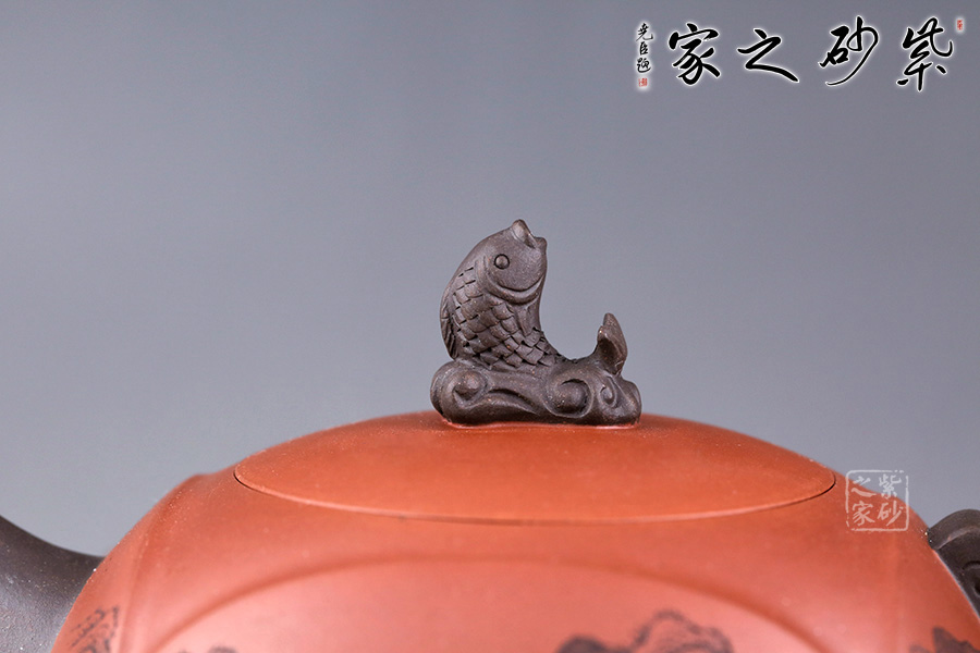 此壺設(shè)計巧思,造型華美大方,壺身為圓形,彎嘴方把,以躍起的“錦鯉”為鈕,別致可愛。嘴把鈕色澤一致,與整壺其他色調(diào)和諧,更顯韻致。 作品刻畫精細而不繁瑣,塊面清晰簡潔,線條流暢明快,壺身書畫裝飾,“溪山祥和”,山水之景,觀感為之胸襟一開,暢快舒適!
