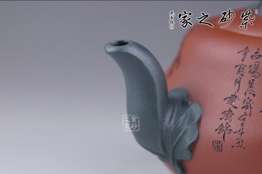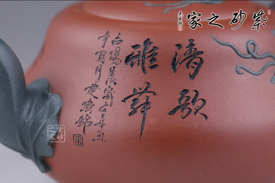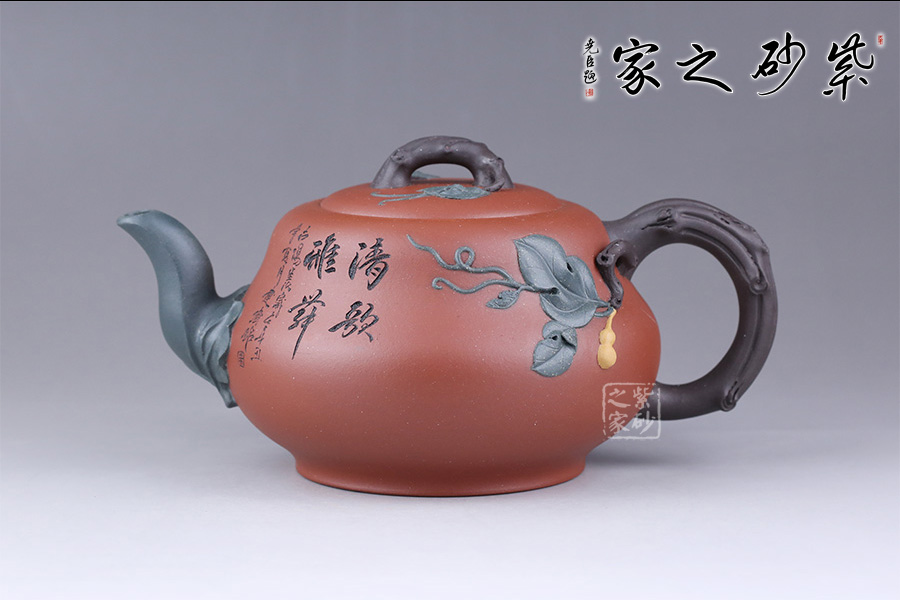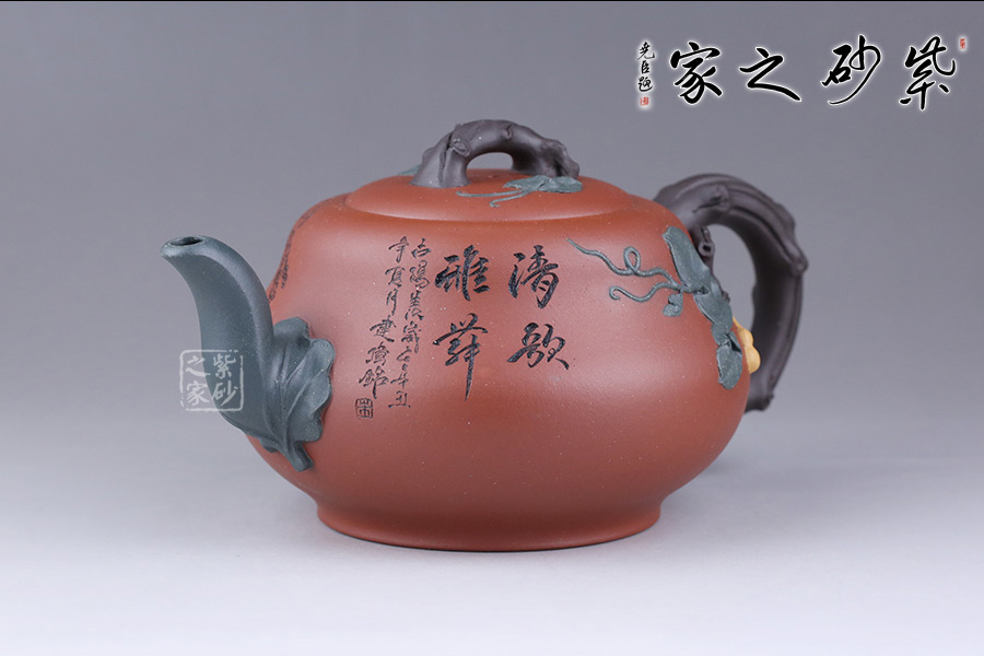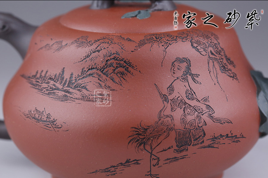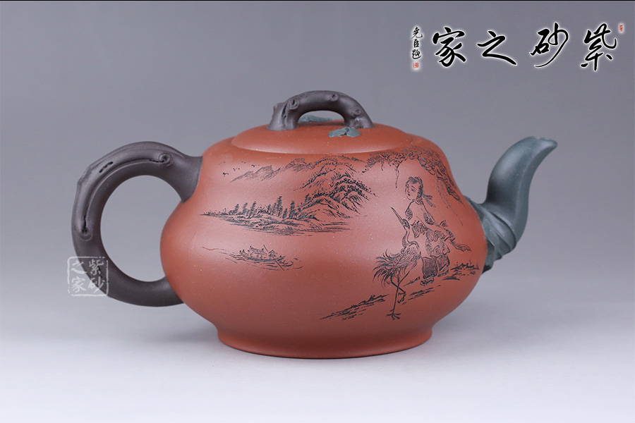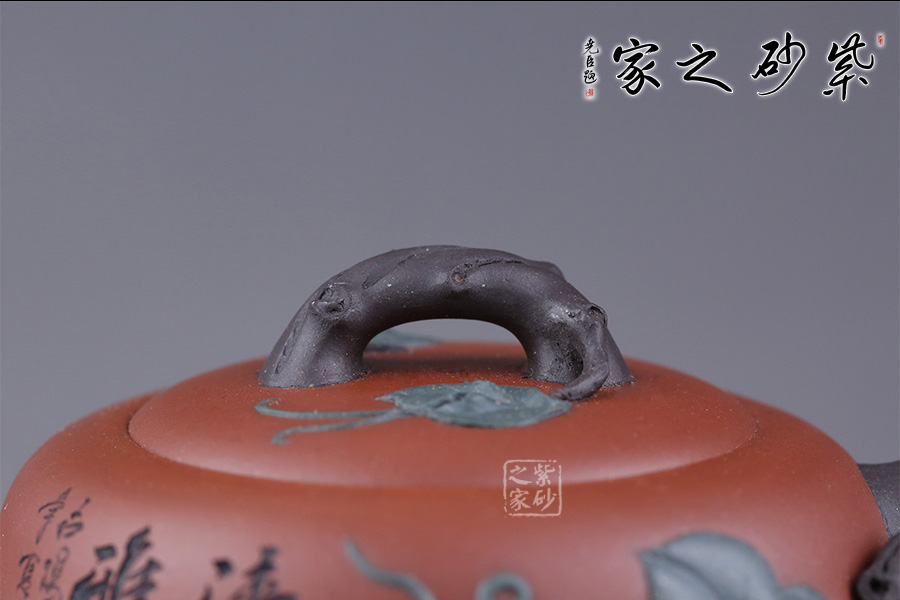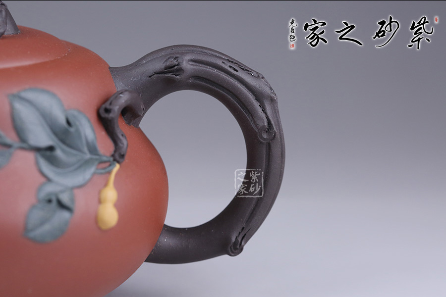 朱建偉老師最擅長壺身裝飾金銀鑲嵌以及山水、花鳥,此壺完美的展現(xiàn)了老師制壺的特點(diǎn)。壺身正面陶刻“清歌雅舞”,反面陶刻小童登山瞭望,遠(yuǎn)處山巒起伏,小舟湖面飄蕩,前后相呼應(yīng)。壺把、壺紐皆仿制葫蘆藤蔓,一根葫蘆藤延伸至壺身,葫蘆懸掛,形態(tài)逼真有趣。