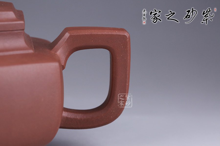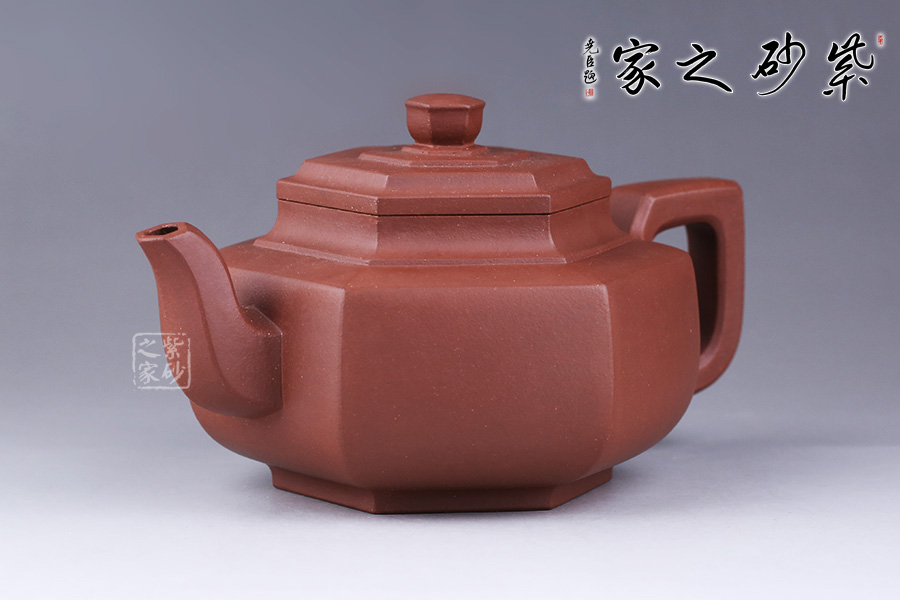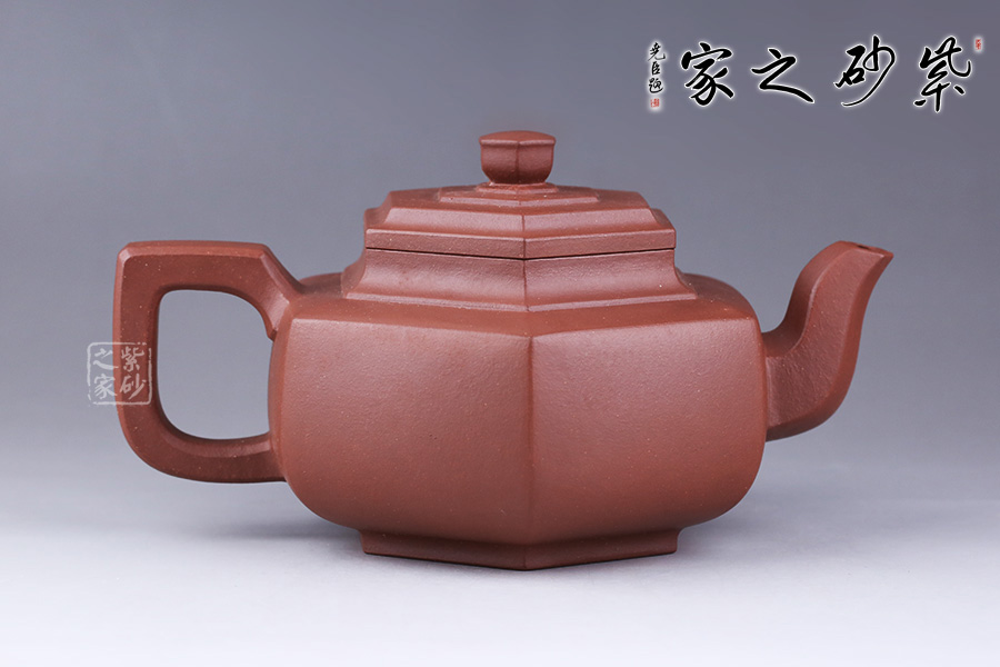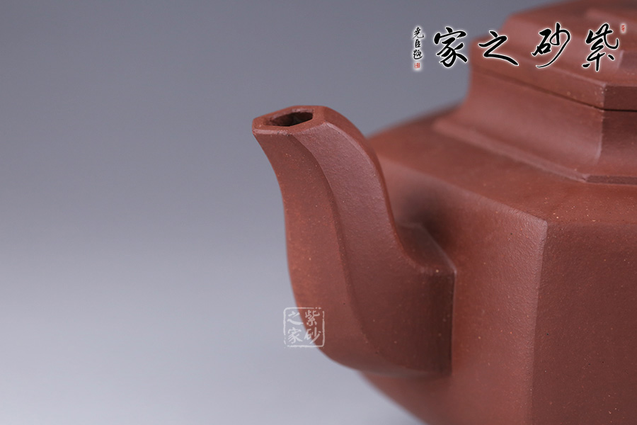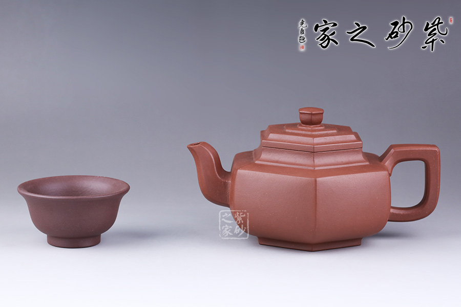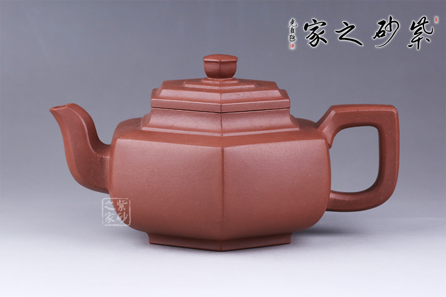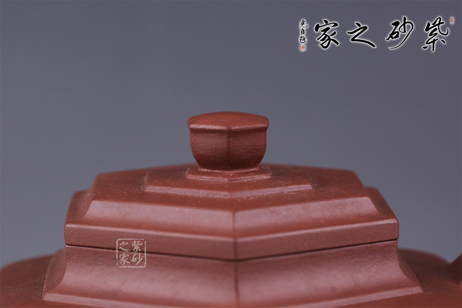 朱建偉老師制作的這款雪華壺將經(jīng)典再現(xiàn),蓋面重疊六方形,六方蓋鈕與壺身相似。壺腹下內(nèi)收,六方加底,整體造型,折肩以上刻劃較細,俯視可看出六個方形層層疊加,壺身較為簡單,可形成對比。嘴、鈕與把三點一線,整個壺型輕薄飽滿,做工細致,方雅而不失靈氣,不禁讓人想起漫天飛舞的輕盈雪華,美麗動人。