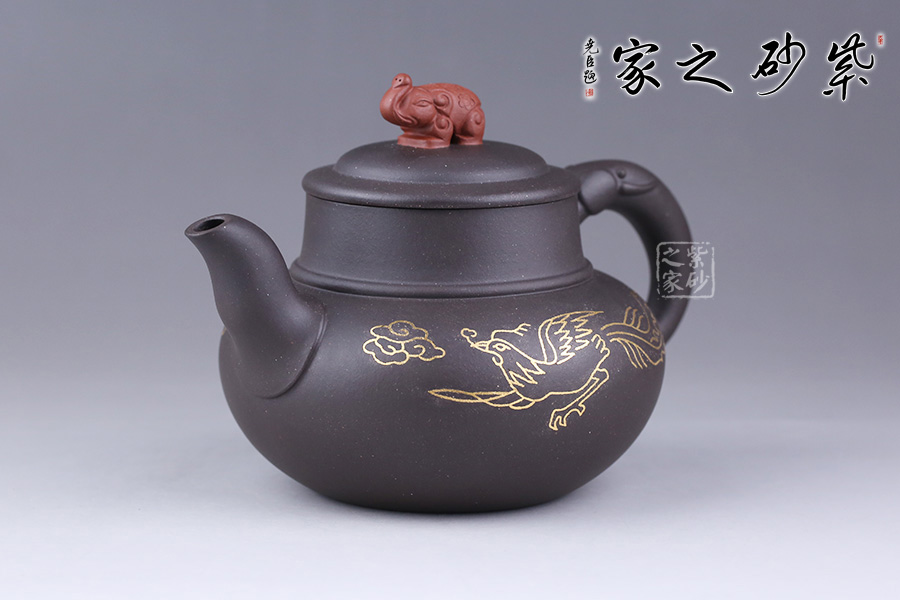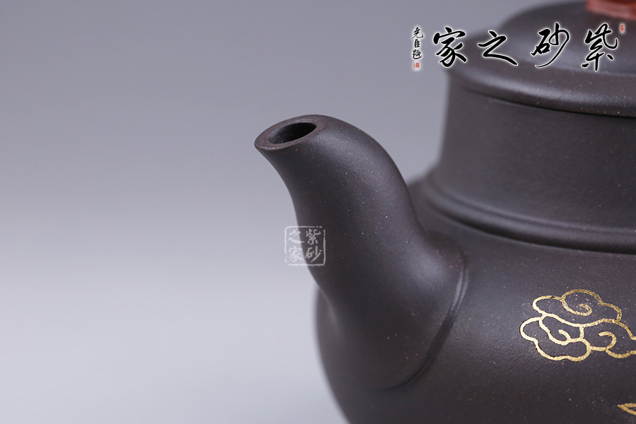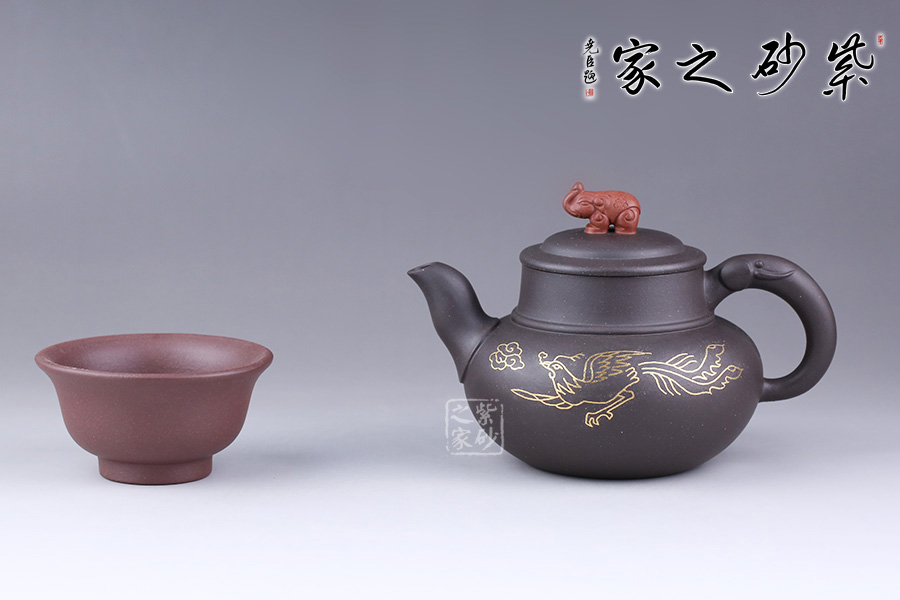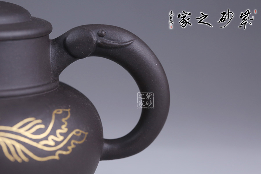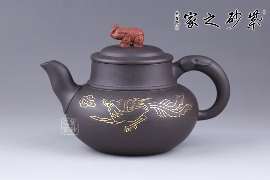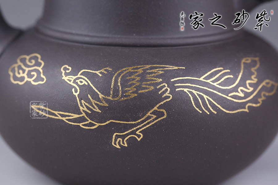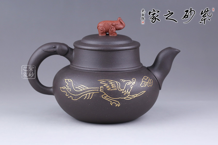 這款鑲金鳳翔細而不膩,綿密柔和,散發(fā)著別樣的光彩。壺身圓潤,線條流暢,壺面用金絲鑲嵌鳳凰展翅高飛,鑲金畫面流光溢彩,寓意吉祥。壺蓋為壓蓋,口與蓋互相吻合,絲毫不差。一彎嘴,出水流暢。壺鈕似象,制作工藝精細,壺把象牙裝飾,與壺鈕遙遙相望。大象體型碩大而強健,是力量與富足的象征。