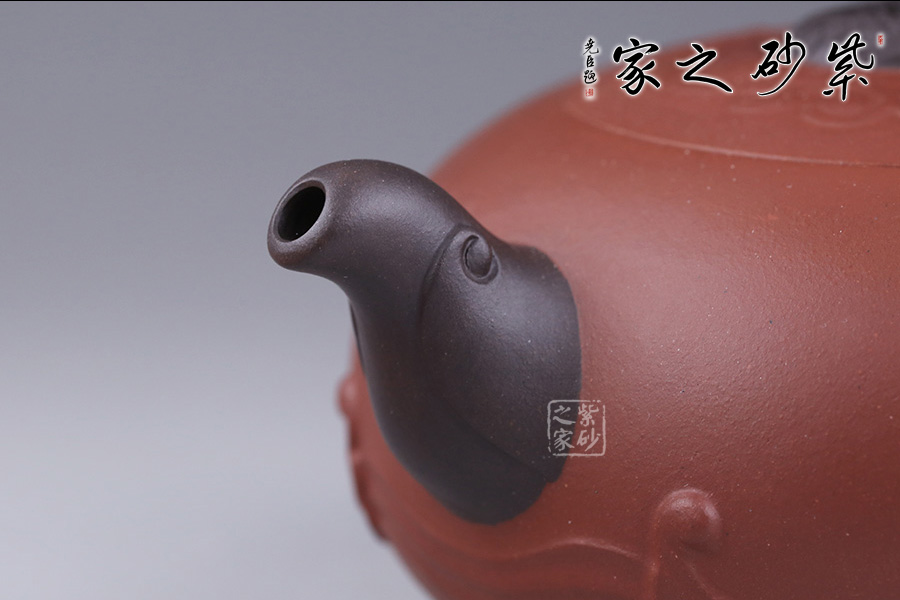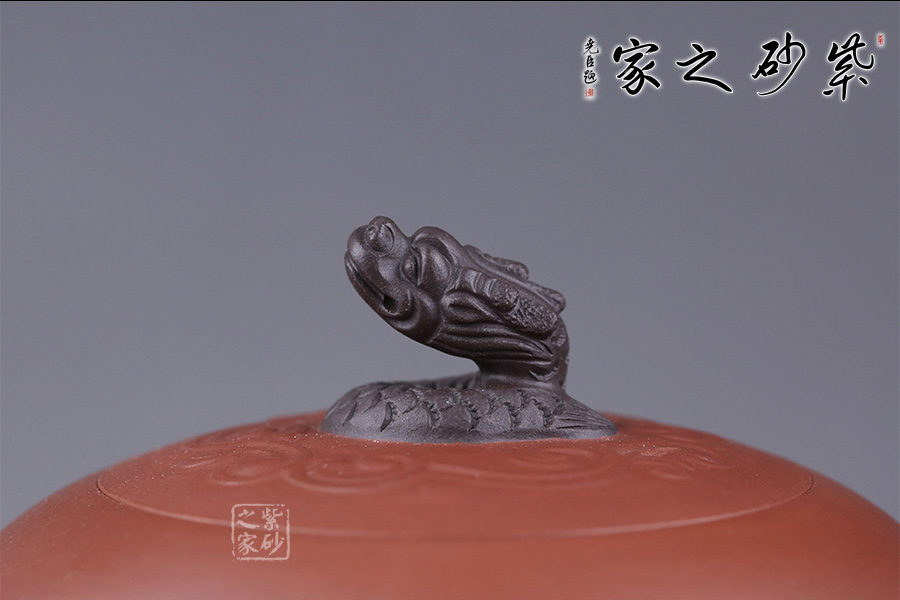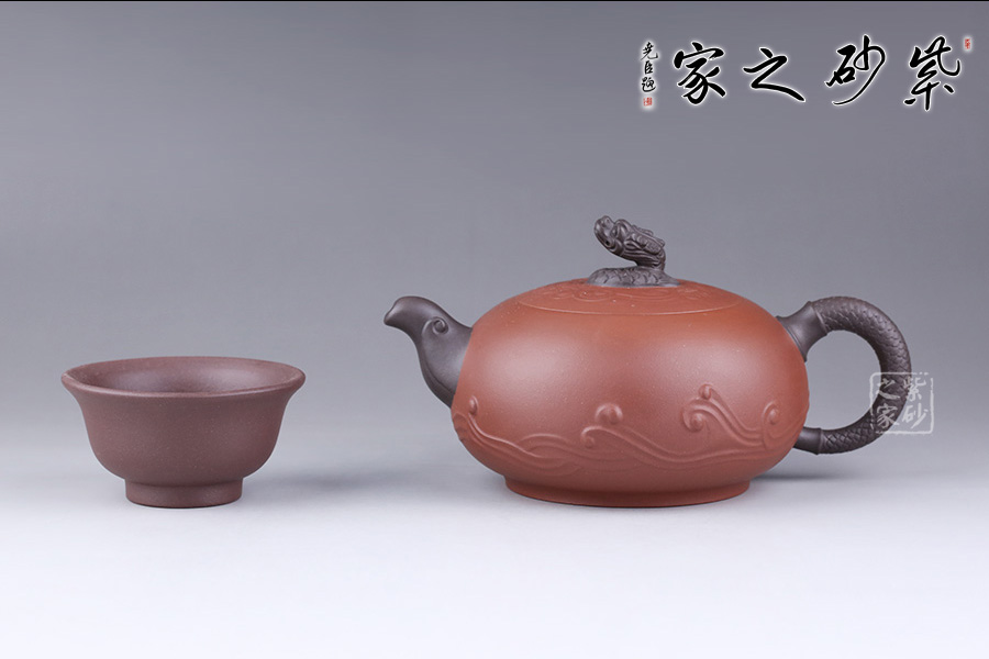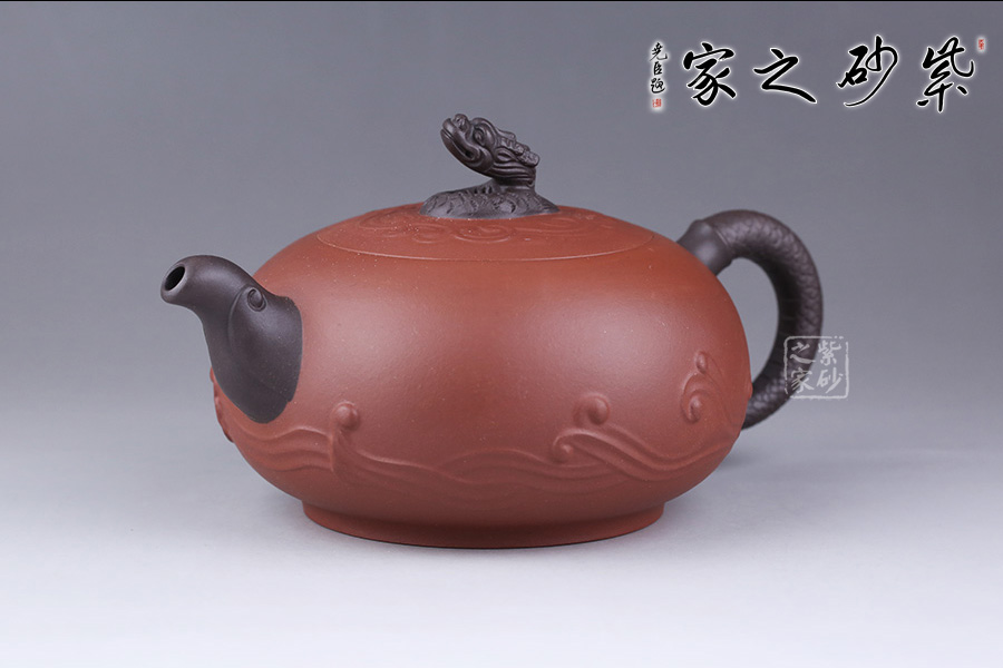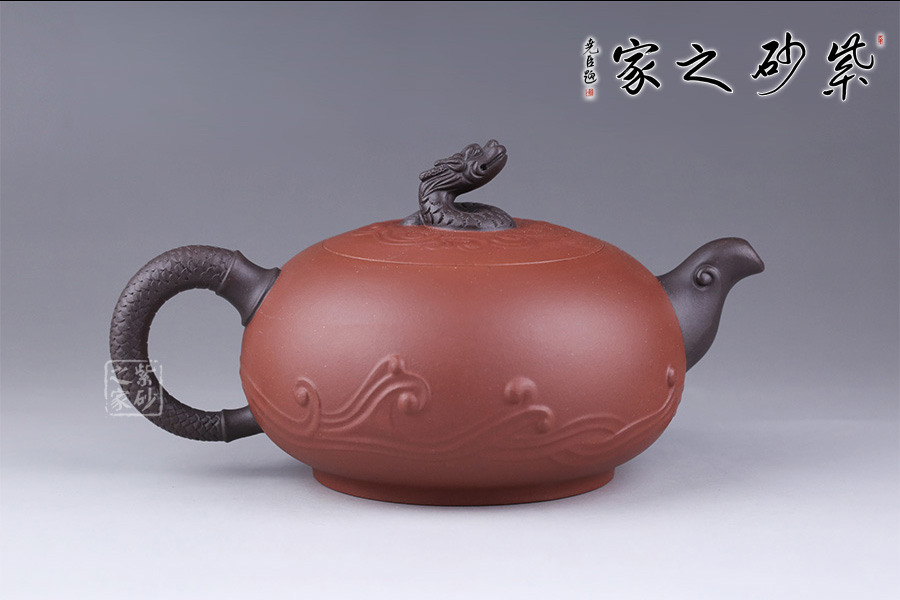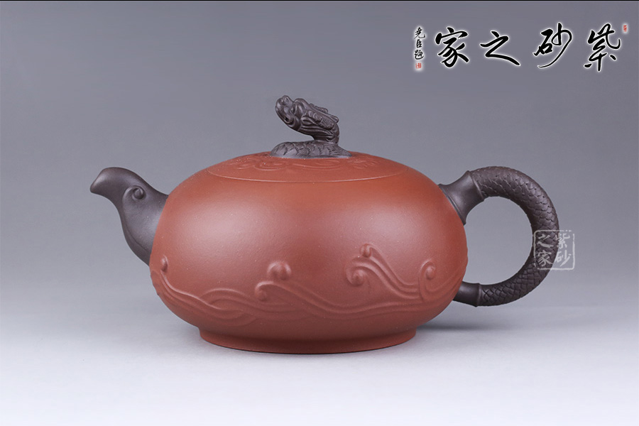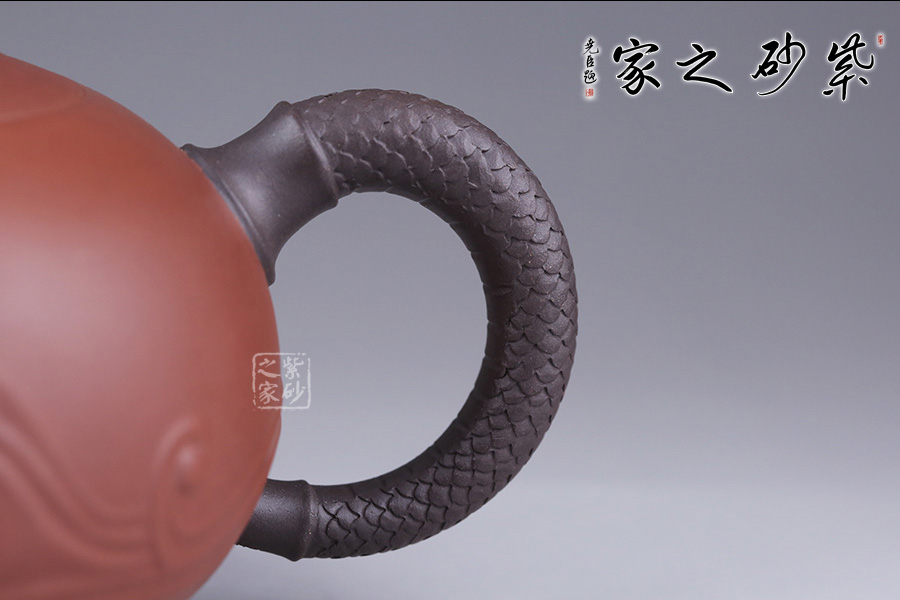 朱建偉老師享有“雙色泥一絕”的美譽(yù),擅于自制自銘,精于雙色泥料制壺,裝飾手法采用金銀鑲嵌、堆泥貼花。此壺呈扁圓形,線條自然。壺身泥繪浪花波浪紋,整器觀之感受蛟龍出海之磅礴之勢(shì)。龍首作鈕,蜷身昂頭,龍尾作把,彎繞自然,龍紋刻塑細(xì)膩逼真。巧妙構(gòu)思,是收藏賞玩不二之選。