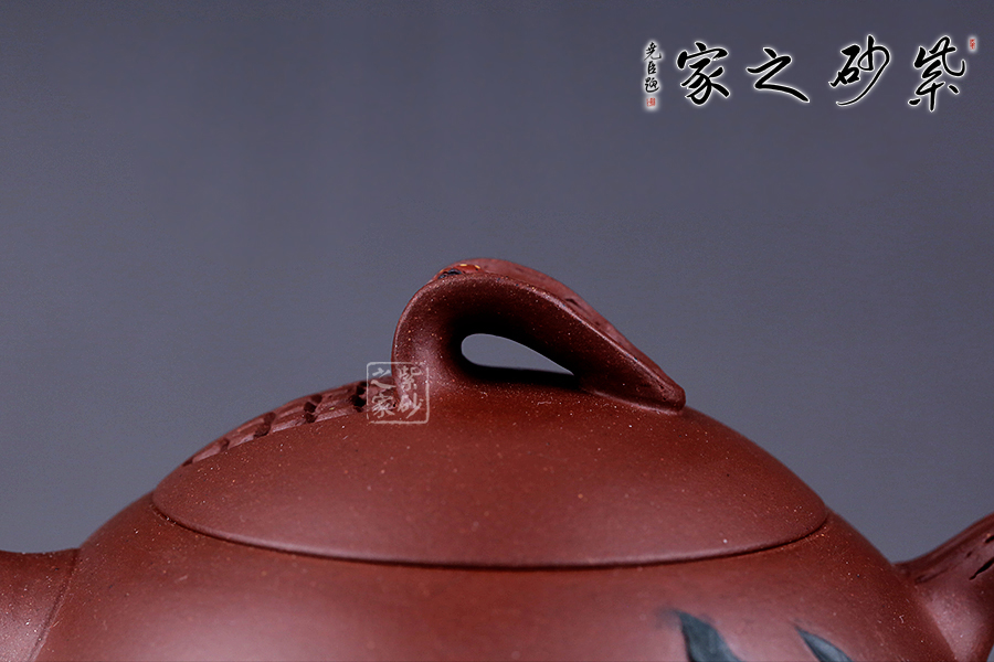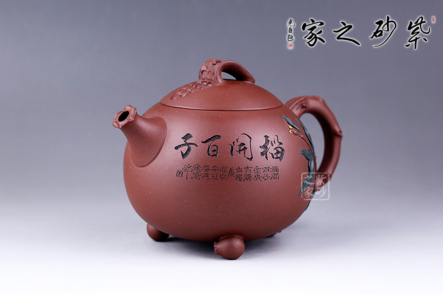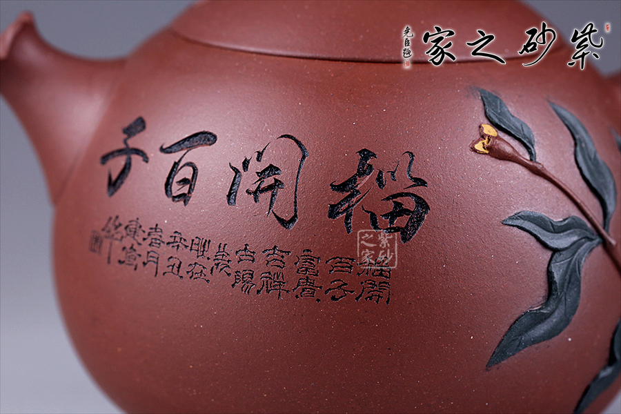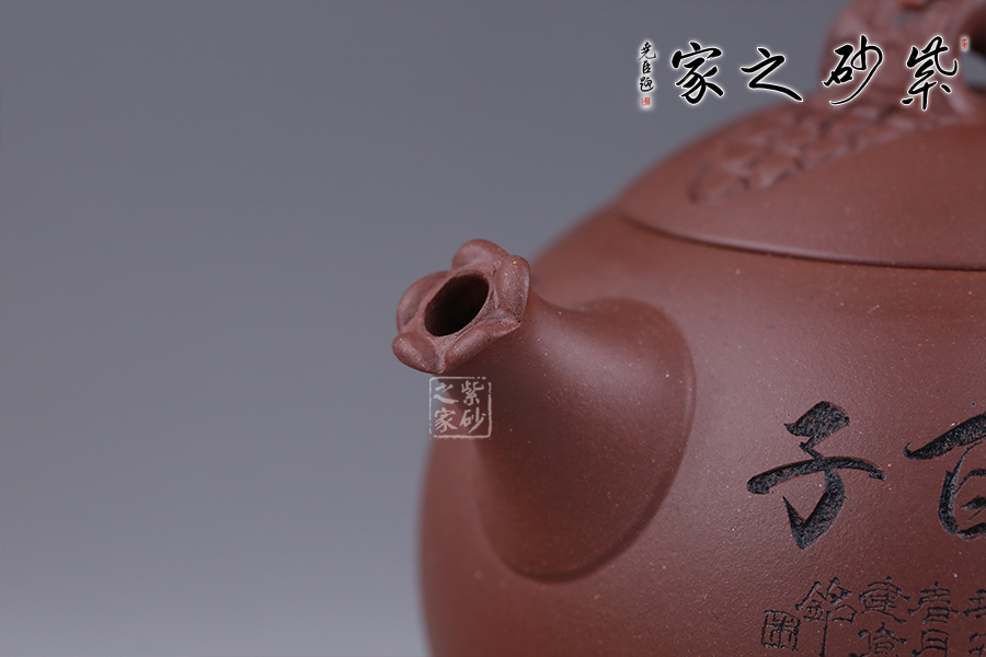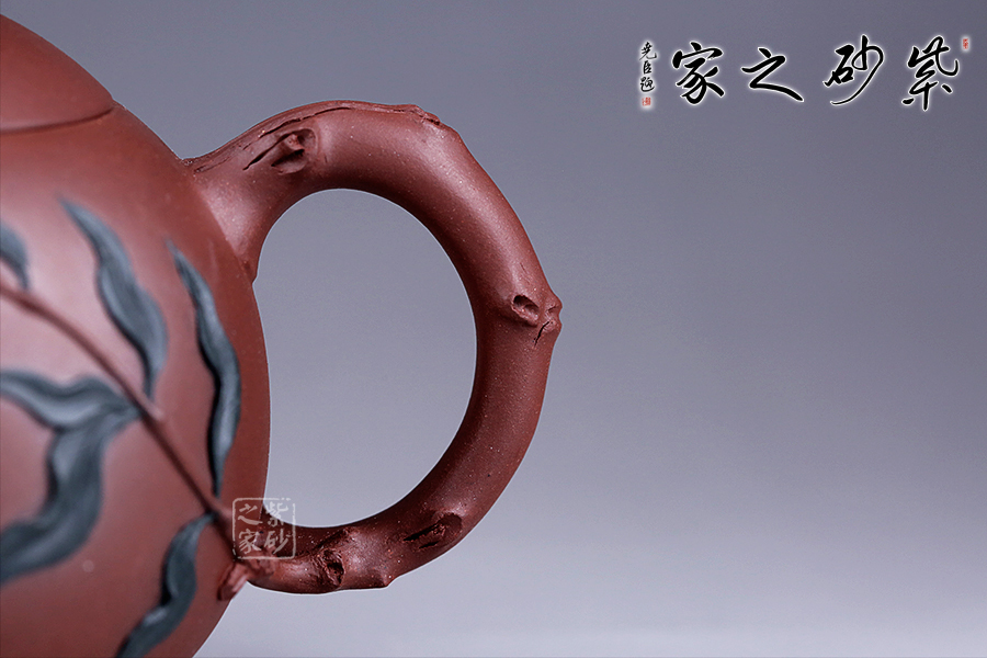 此壺壺身飽滿,如一只碩大的石榴,壺嘴小巧可人、精致別致、創(chuàng)意極新;壺把以藤蔓為形,與壺身裝飾的葉片相連,形態(tài)逼真,充盈神韻。壺蓋上以剝開的石榴皮裝飾成壺鈕,露出累累果實的石榴圖案,形態(tài)生動活靈活現(xiàn)。