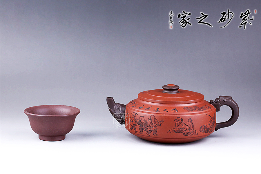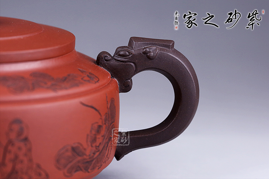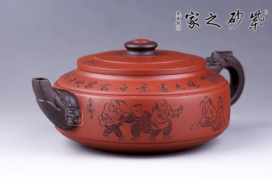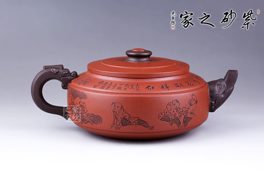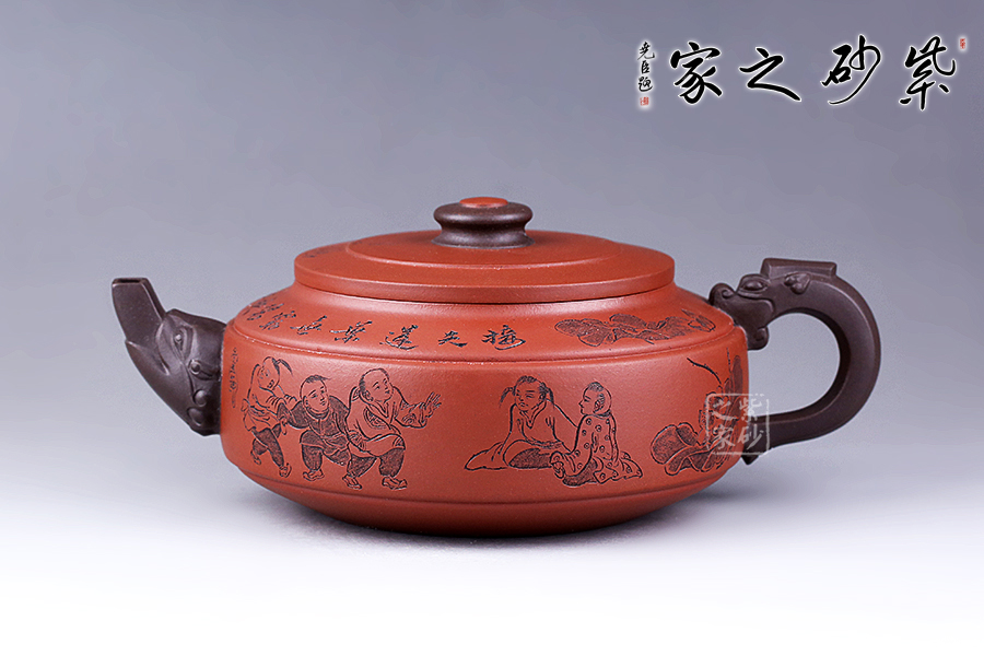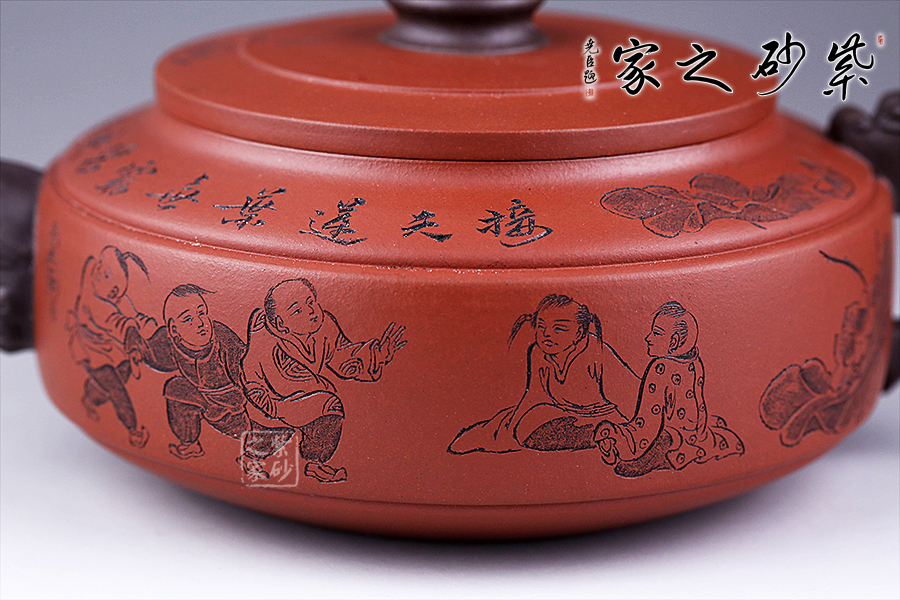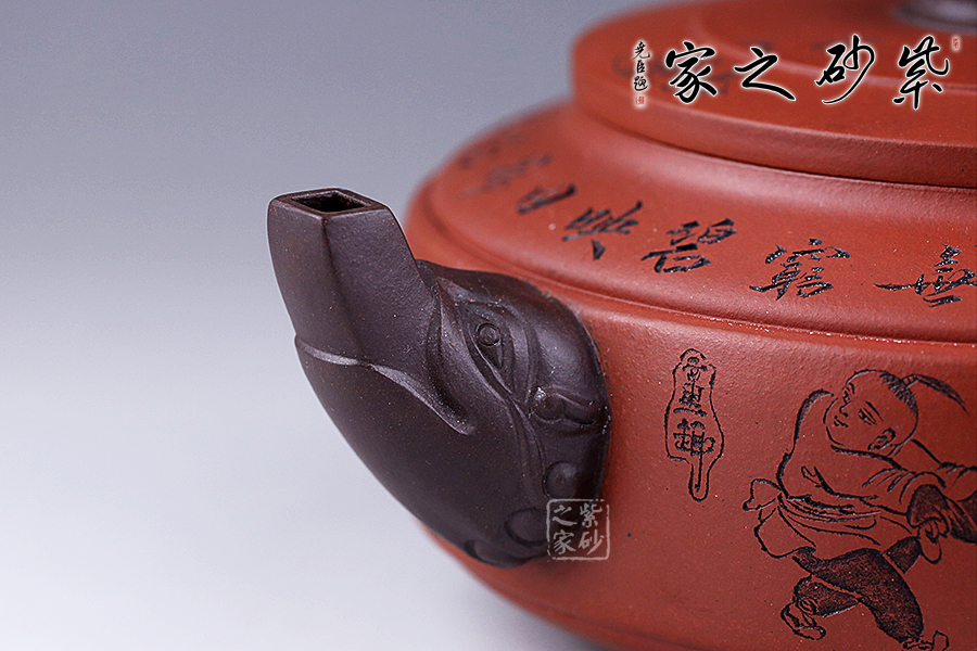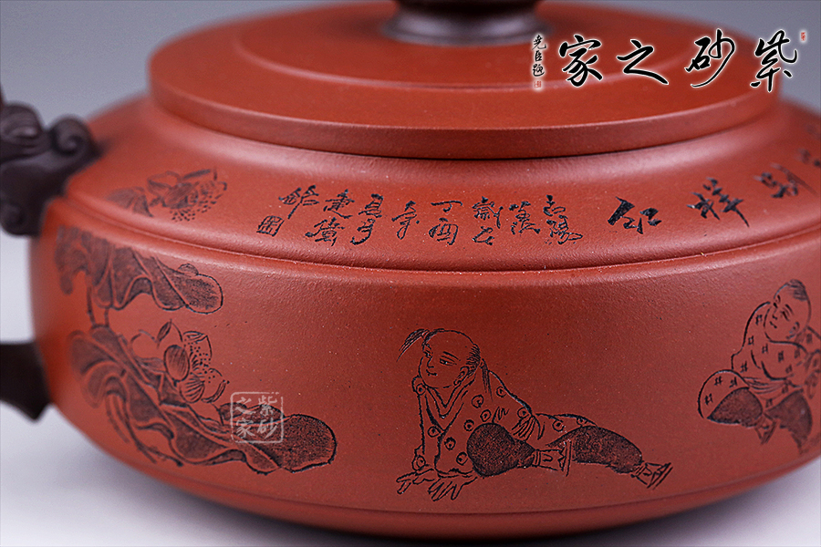 此壺選用雙色泥料制作,相互和諧,別有一種風(fēng)格。縱觀此壺,壺把與壺嘴自然胥出,皆以龍為形,與壺為身自然銜接,毫不沖突。壺身呈圓柱狀,壺底內(nèi)收變?yōu)榈?,穩(wěn)重而平實。壺身刻繪的百子百福吉祥有趣,刻繪的詩詞“接天蓮葉無窮碧,映日荷花別樣紅”別有一番雅韻。觀之整器,整體過度的非常自然、漂亮,看起來簡潔明快,典雅大方。無論收藏還是送人,都是極不錯的選擇。