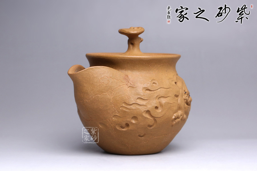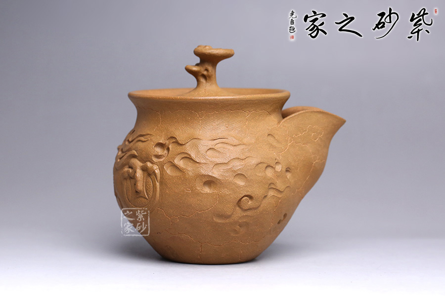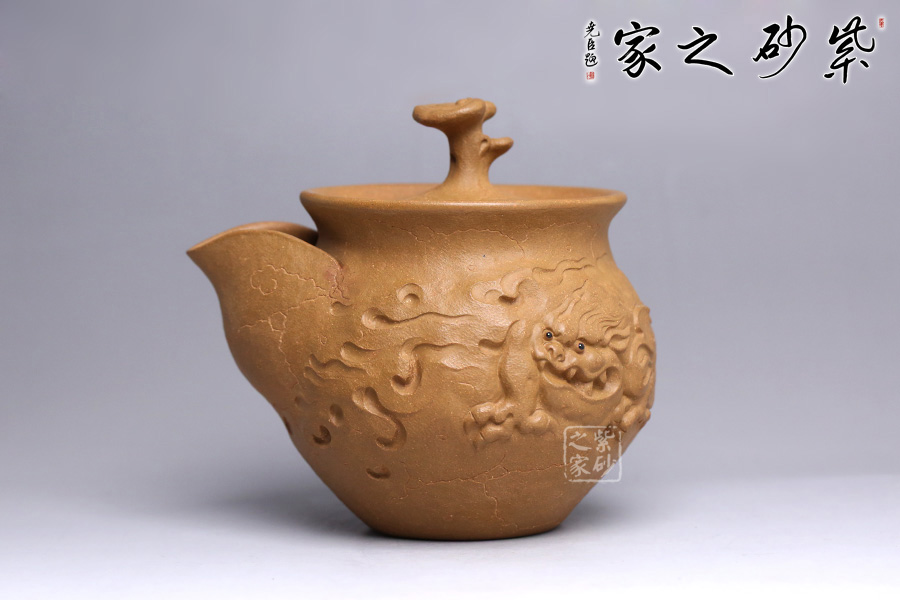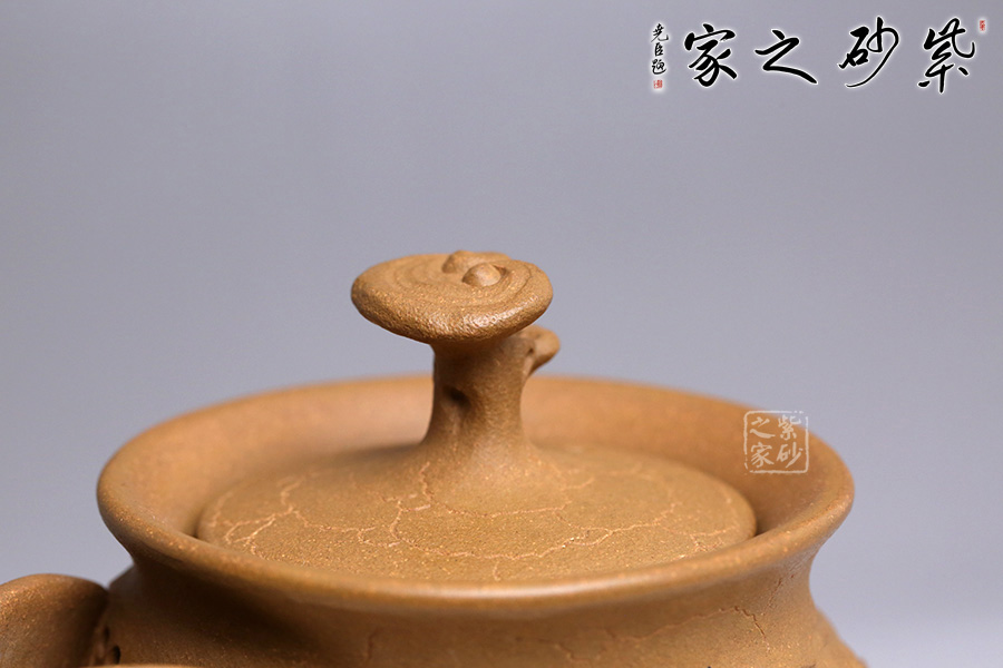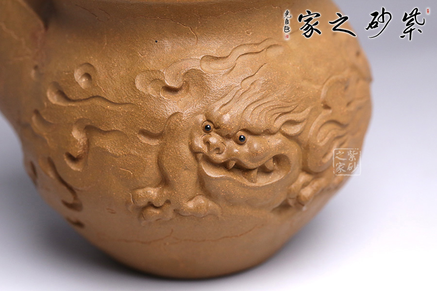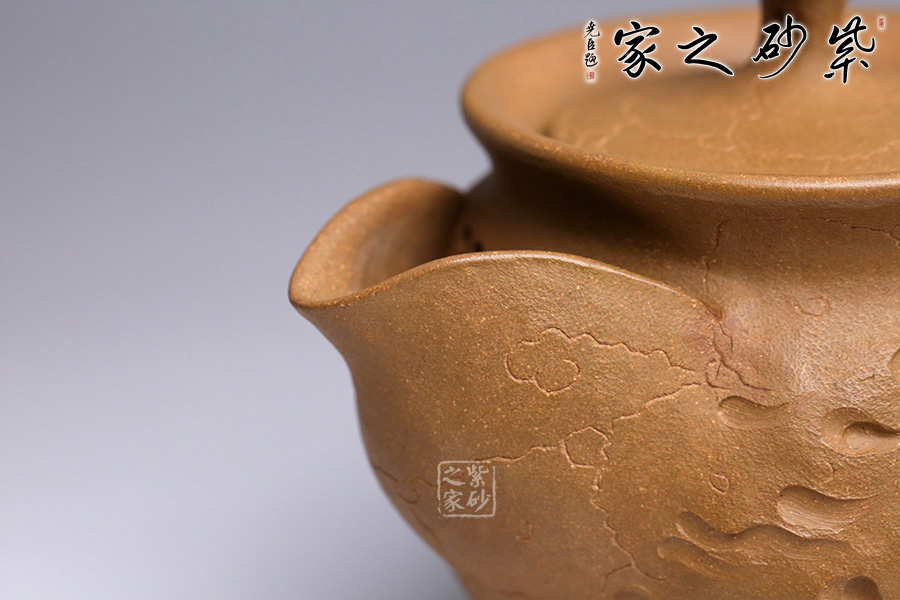 此款靈芝貔貅與傳統(tǒng)的供春壺實(shí)有異曲同工之妙。壺身帶有貔貅招財(cái),活靈活現(xiàn),做工精湛。貔貅寓意豐富,除了開運(yùn)、辟邪的功效之外,還有鎮(zhèn)宅、化太歲、促姻緣等作用。 壺嘴不是傳統(tǒng)意義上的直流、一彎流、二彎流樣式,由張斌老師手工捏制的,暗接自然,線條流暢。壺蓋上靈芝壺鈕的設(shè)計(jì),極富趣味,又與該主題極其契合,壺蓋為壓蓋,口與蓋互相吻合,絲毫不差。