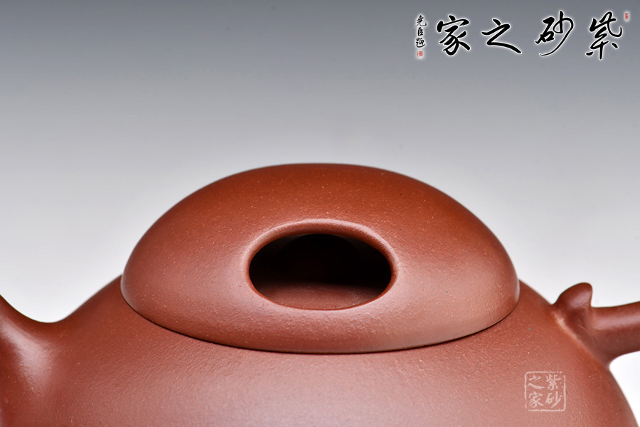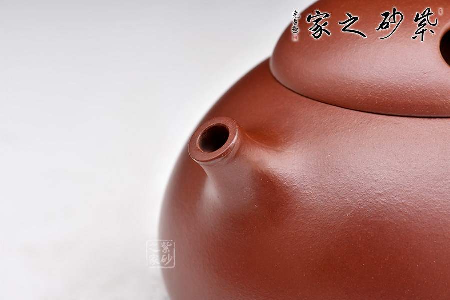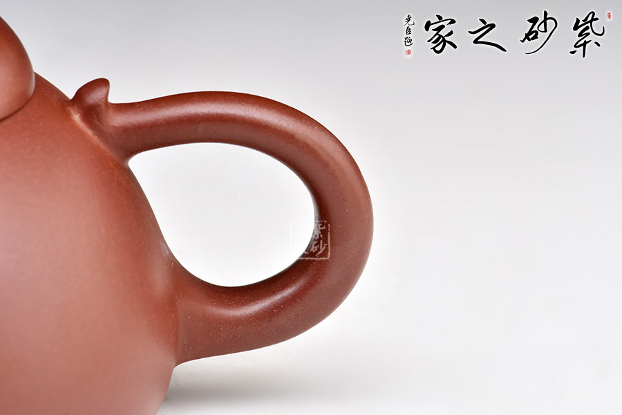 此壺名為牛蓋蓮子,萬慶華老師在自己獨特的見解上經(jīng)過創(chuàng)新制作而成。壺身圓而飽滿,上窄下寬,曲線流暢自然。短頸,肩部收斂成口,外包口沿。短嘴,一彎流,出水流暢。壺柄耳大圓潤,小巧可愛。壓蓋,與壺口緊密結(jié)合,口蓋整體平整光滑,外形流暢。壺鈕制作別出心裁,采用了牛鼻孔式的鏤空結(jié)構(gòu),生動與趣味完美結(jié)合。蓋沿,口沿為母子線。整體造型簡單、大方,于流利的曲線,簡潔的塊面中可見作者高超的壺藝。