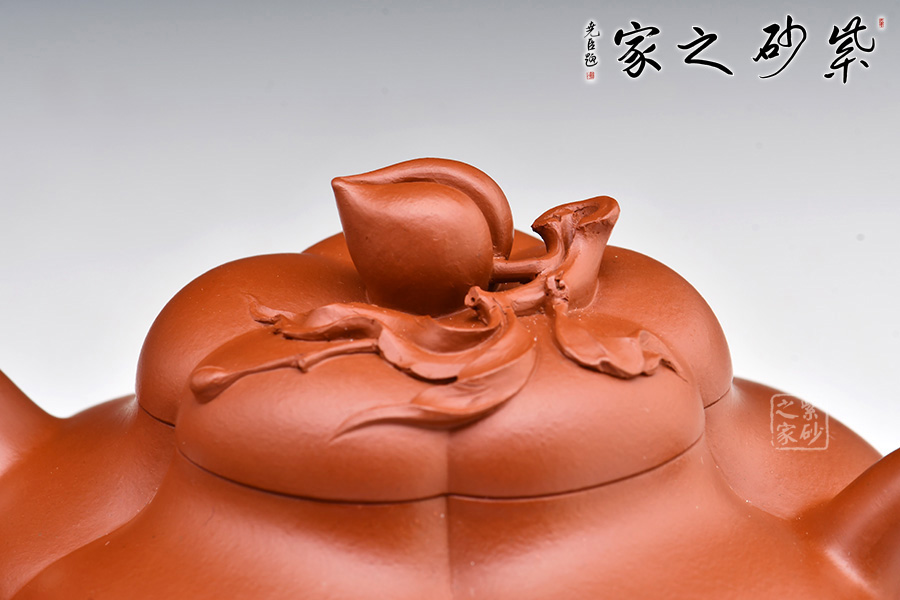 此壺融合了筋紋器與花器技藝,壺身做五瓣筋囊式,等分均勻,筋紋深厚,張力十足!壺身鼓腹,筋囊飽滿,自壺蓋至壺底均以筋紋裝飾,上下一致;短彎流與耳形把纖巧俊秀,更添精神;蓋上塑一桃子為壺鈕,并貼塑桃枝桃葉,十分生動形象,此乃點睛之筆。以桃為主題,象征長壽安康,饋贈長輩之選。