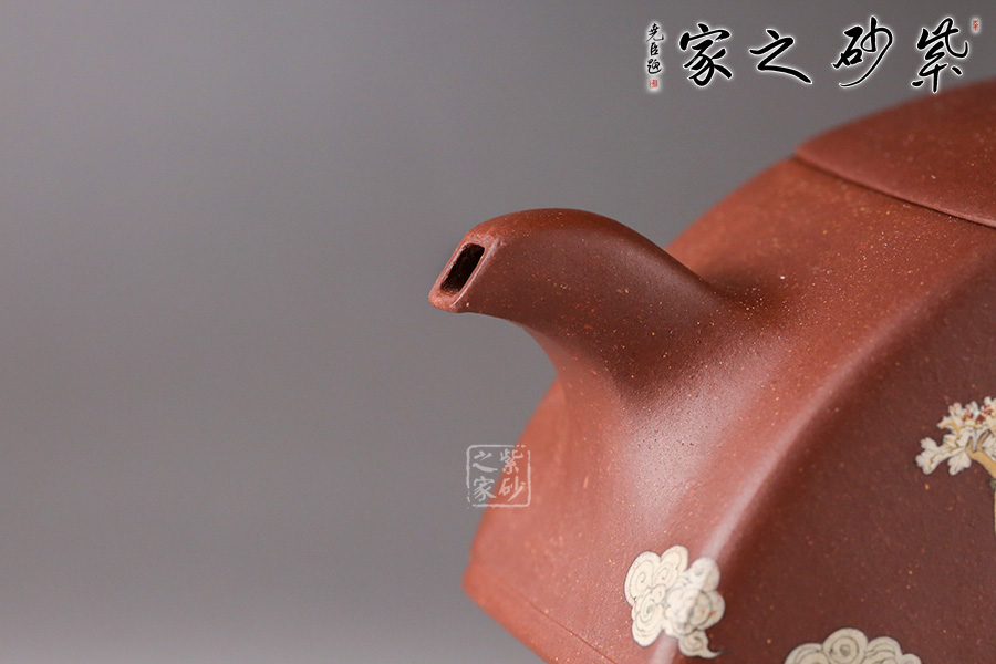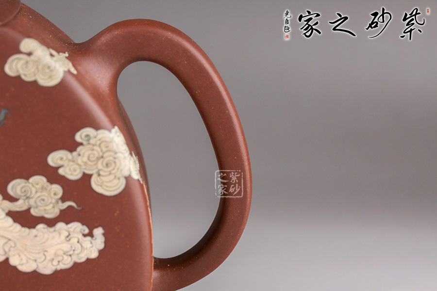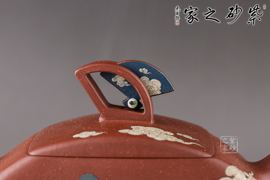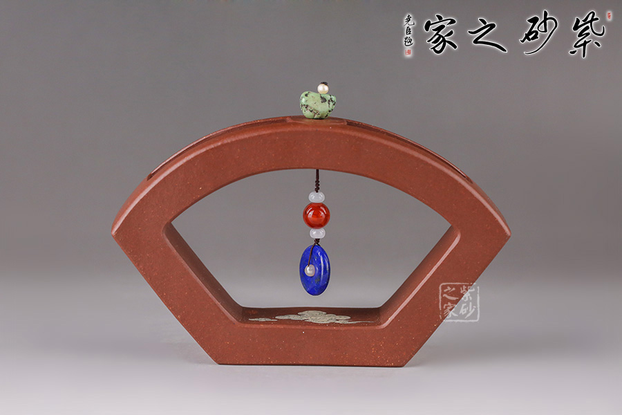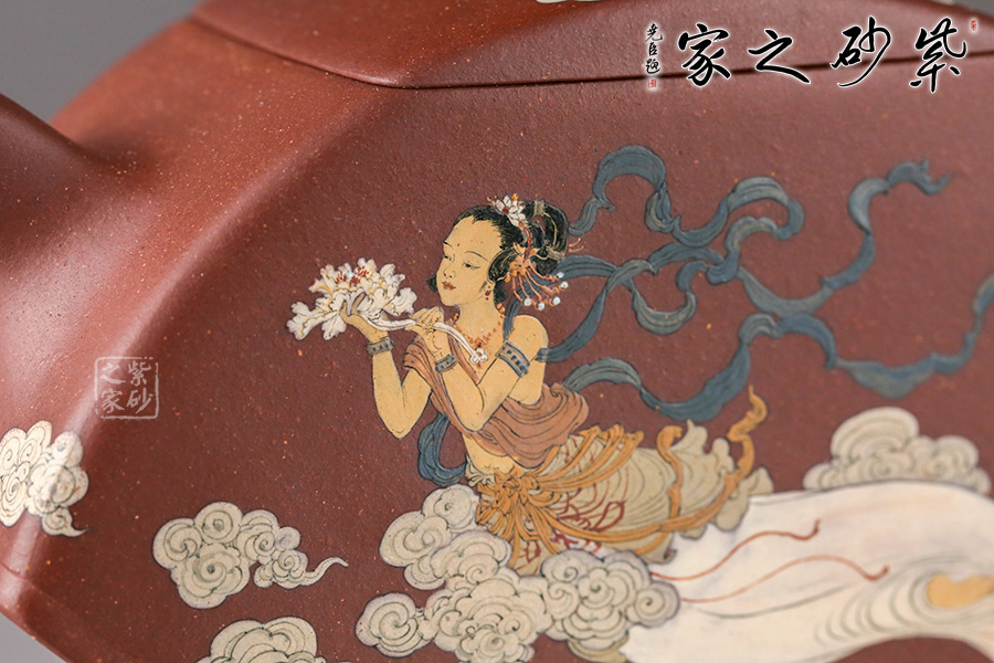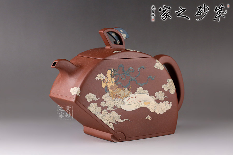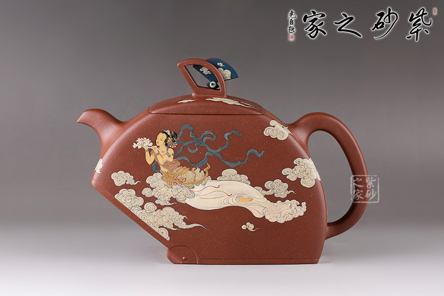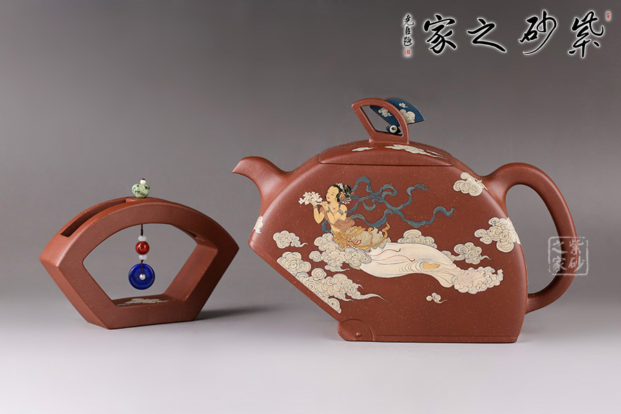 在空中飛翔的神仙。佛教石刻壁畫中常有飛天的造像。此壺扇形結(jié)構(gòu),造型像一把打開的折扇。壺鈕也是兩柄折扇,鏤空扇形與以小藍(lán)田玉石裝飾的藍(lán)扇相互呼應(yīng),虛實結(jié)合。壺身畫以飛天神女在祥云中漫游的姿態(tài),手捧牡丹玉如意,優(yōu)美典雅。背后裝飾書法“輕盈舞殿三千女,縹緲飛天十二臺,定有仙人來種玉,藍(lán)田歸計少徘徊”。配有裝飾了三色玉石的鏤空扇形配套小擺件,更添喝茶趣味。