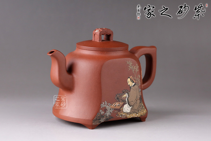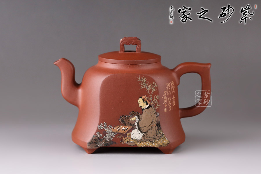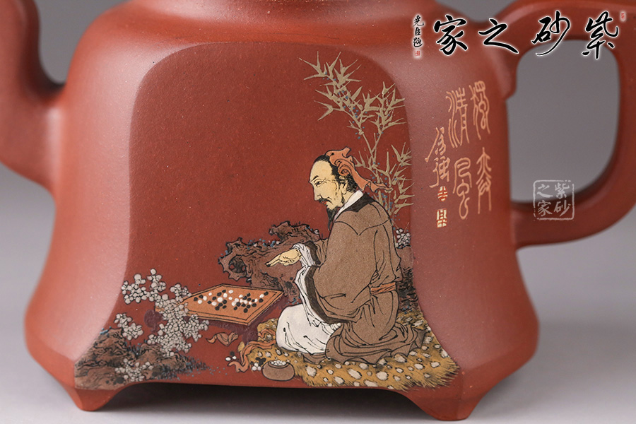壺身正面泥繪“一人在林中下棋”,畫面清新秀麗,恬靜淡遠(yuǎn),畫中老人執(zhí)棋待下,眉頭微鎖,自娛自樂,生活情趣豐富。與背面刻繪的“方圓度帥才 黑白養(yǎng)將風(fēng)”相呼應(yīng)。