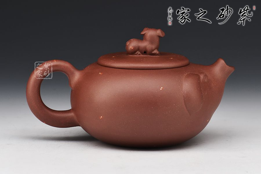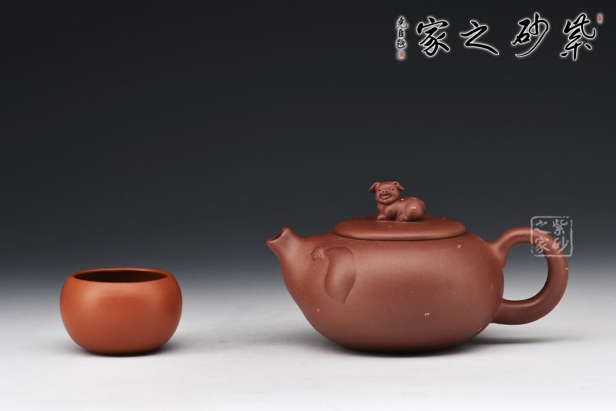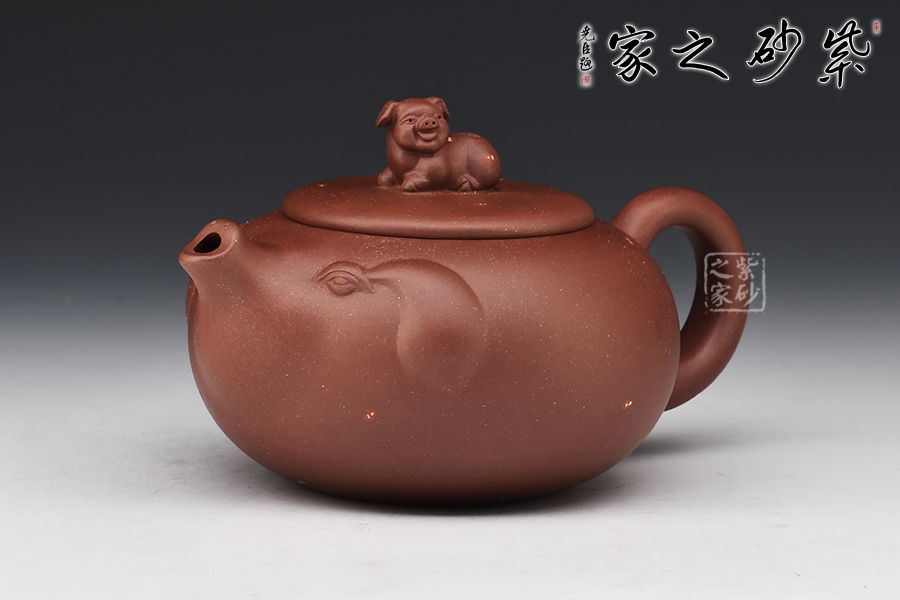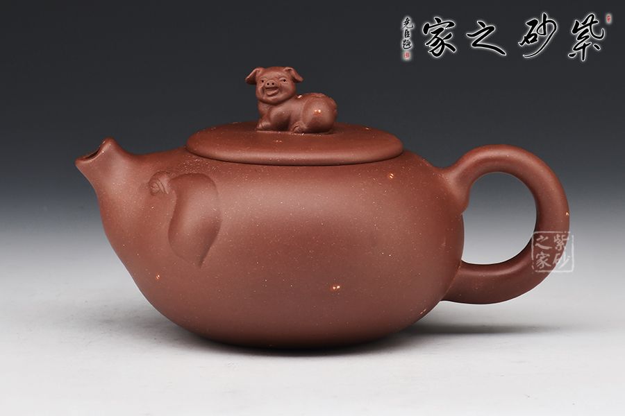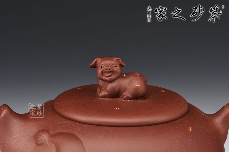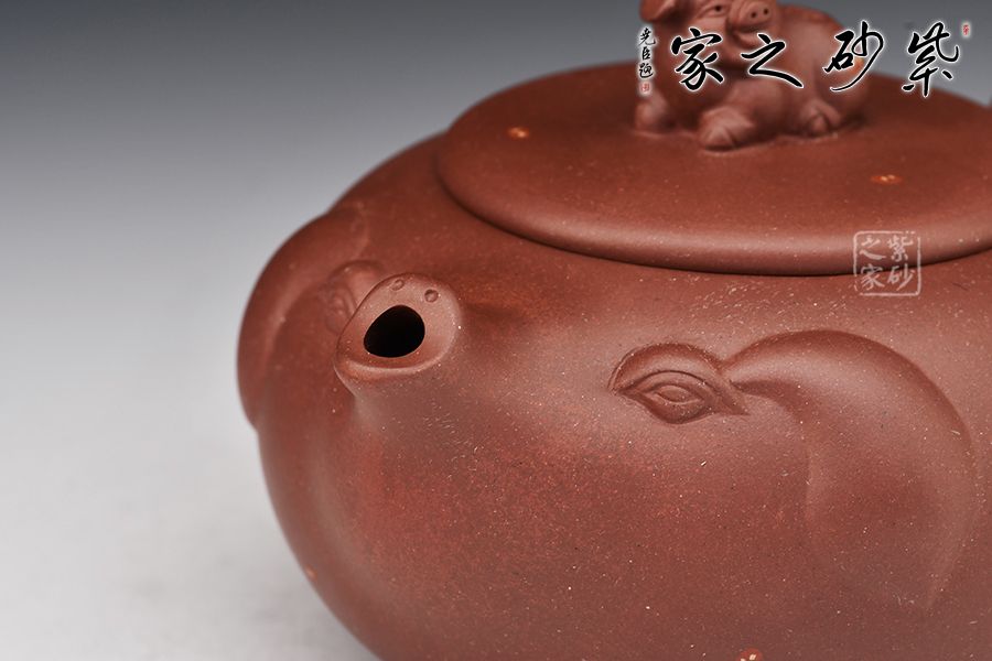 該壺第一眼看過去就讓人愛不釋手,實在可愛至極。整個壺身是一直圓潤飽滿又憨態(tài)可掬的小豬,寓意財源滾滾萬事如意,壺嘴像翹起來的豬嘴巴、壺把手像豬尾巴,壺嘴壺身及把手融為一體、形象生動。壺鈕是臥躺的小豬、栩栩如生,活潑可愛,與壺身及主題遙相呼應(yīng)。