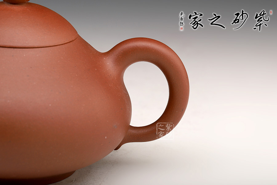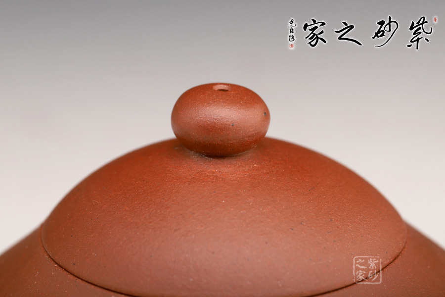 此壺壺身圓潤飽滿,上斂下豐,寶珠鈕似乳與主體造型緊密呼應(yīng),截蓋與壺身相連,似天工削成,暗接一彎流,圈把如女性挽起的發(fā)髻,高傲而不做作。