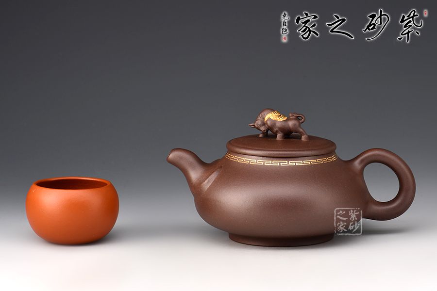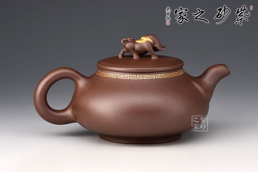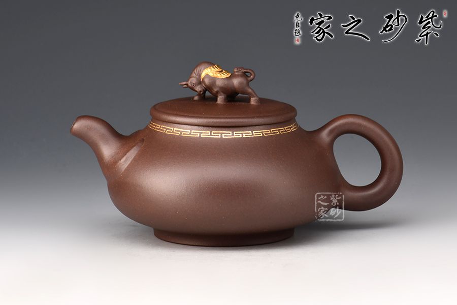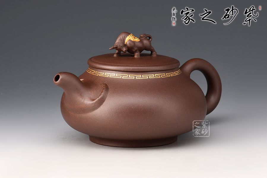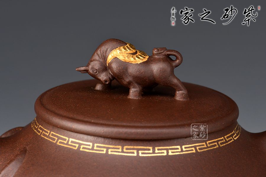 圈足底,傳統(tǒng)圓壺壺身,壺腹圓潤(rùn)飽滿?;绺哳i,壓蓋設(shè)計(jì),微形雕塑金牛鈕精致生動(dòng),壯碩的體格十分逼真,亦是本作品的點(diǎn)睛之筆,突出“金牛開(kāi)運(yùn)”的中心思想。一彎壺嘴,圓口滑溜,兩側(cè)牛角裝飾,構(gòu)思十分巧妙;倒耳形把細(xì)出粗收,造型獨(dú)特。