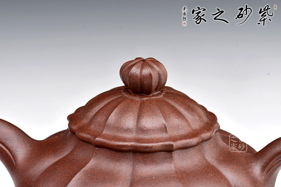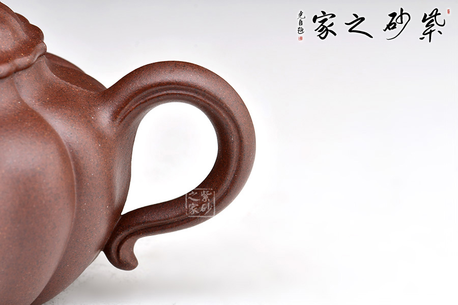 壺身通體筋紋,線條流暢,凹凸起伏,規(guī)律有序,在光影映射下,明暗的律動(dòng)更顯得委婉曲折。一變嘴,耳形壺把隨身勢(shì),比例得當(dāng)。筋紋抽角貫穿于壺身、壺頸、壺蓋與壺鈕,在美化壺體的同時(shí)也增加了此壺的制作難度,但整壺又不失實(shí)用性。