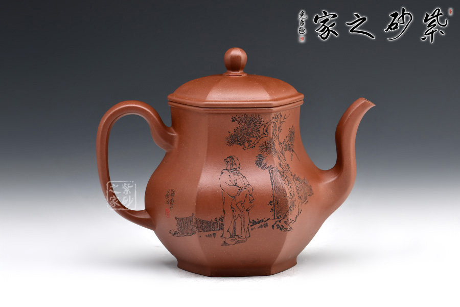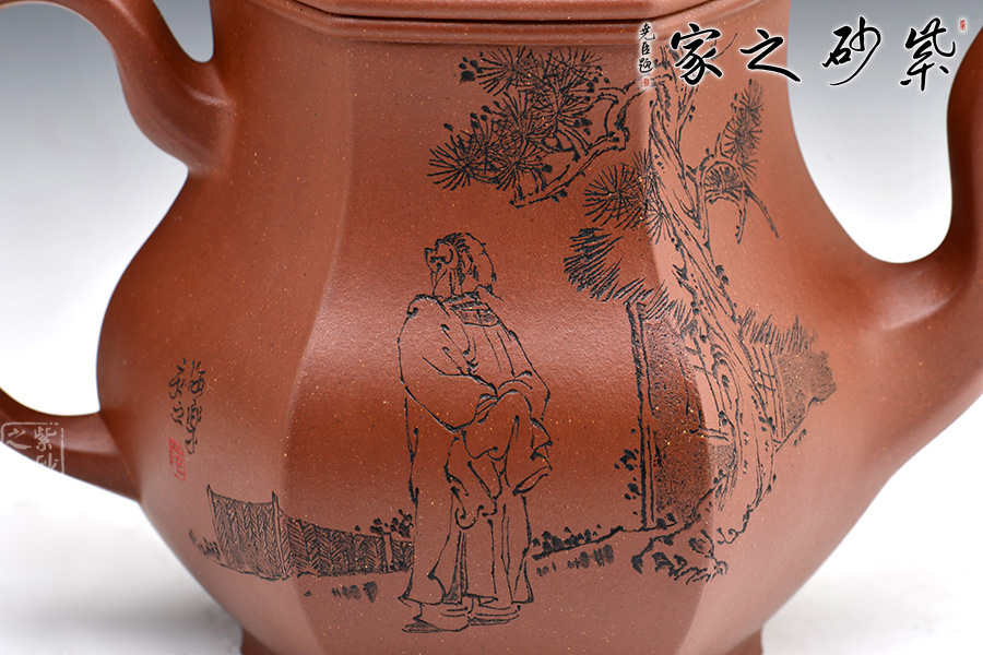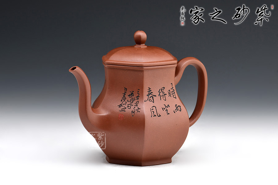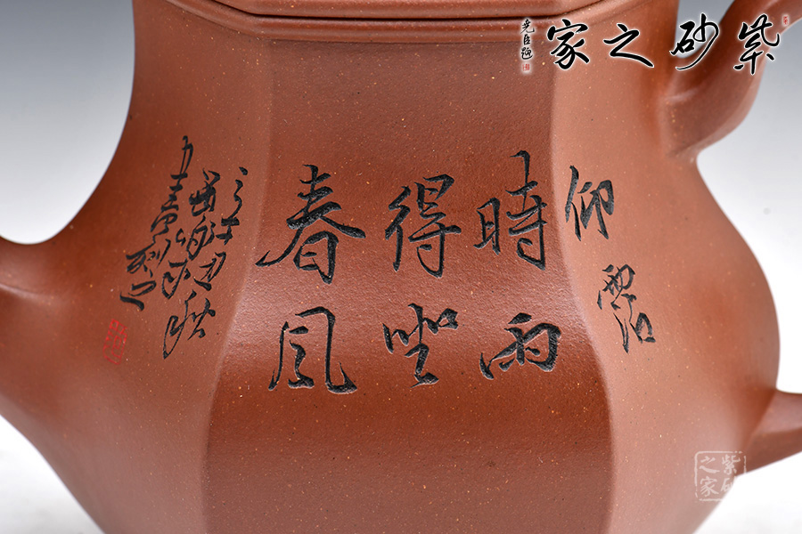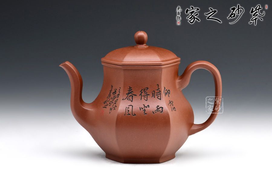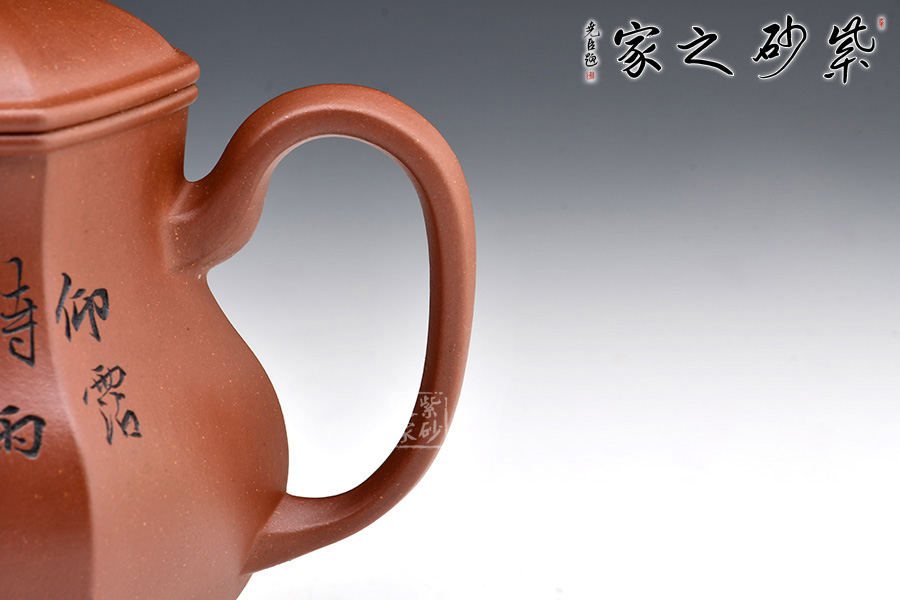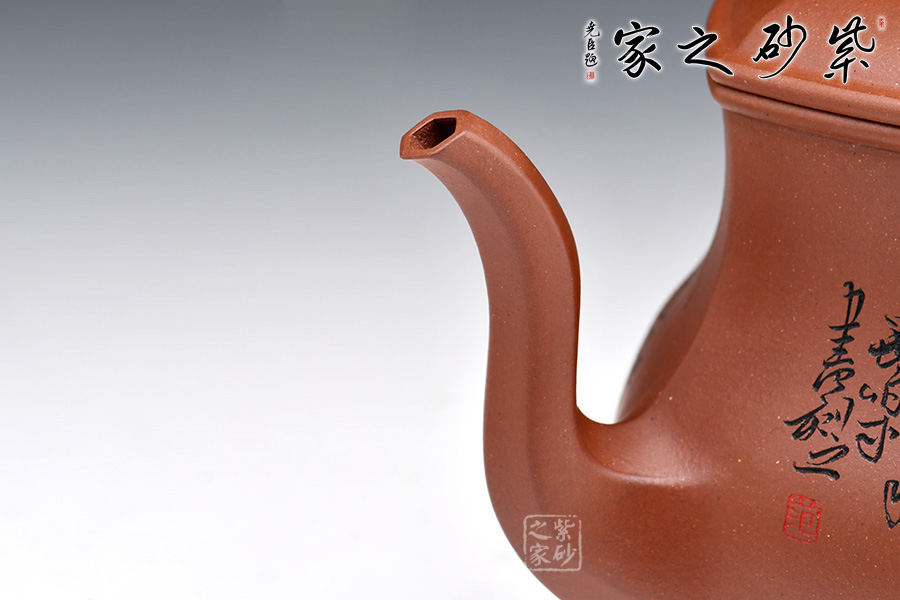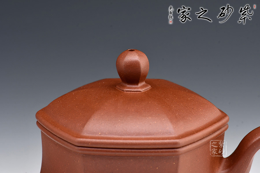 宮燈壺是紫砂壺中的經(jīng)典。宮燈,顧名思議是指古代宮廷用燈,紫砂以其為原型,不僅因其造型美觀,更取其奢華富貴、興隆和吉祥之意。此宮燈壺以六方呈現(xiàn),線條順滑,造型別致,對(duì)于做工要求極高。而此壺的六方輪廓清晰,線條鮮明有力,比例協(xié)調(diào),對(duì)稱工整,整把壺看起來確如宮裝仕女,雍容典雅,我見猶憐。