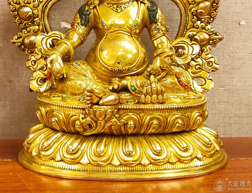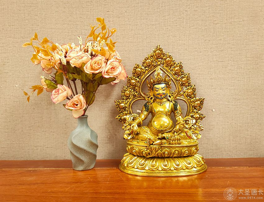 黃財神的形象為上身袒露,下身著裙,右手持摩尼寶,象征寶光普照十方,增添眾生的福報;左手抱一只大貓鼬(吐寶鼠),鼬的嘴里含著珠寶,象征財寶。右腳踏一只白色海螺,象征著他能入海取寶。