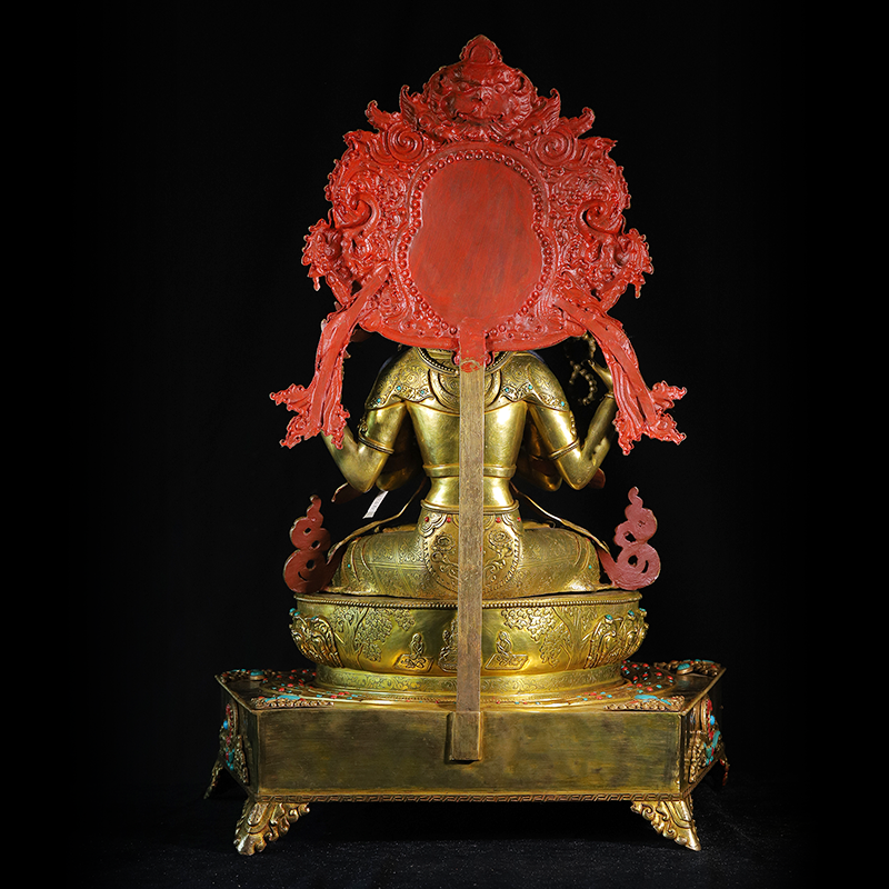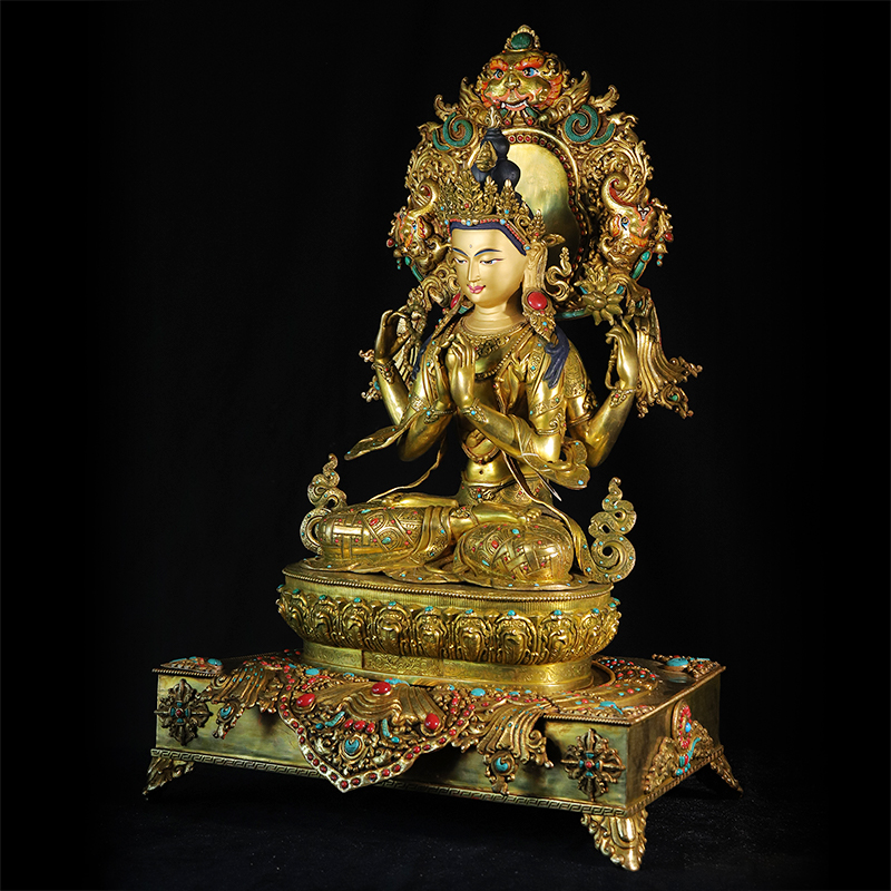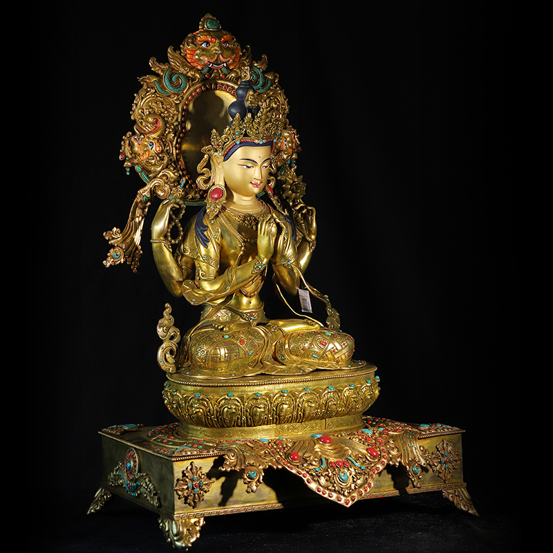 四臂觀音,雪域西藏的守護神,為西藏佛教密宗本尊之一。本尊身顏潔白如月,頭戴五佛冠,發(fā)黑色結髻,中央二手合掌於胸前,捧有摩尼寶珠,右手持水晶念珠。左手拈八瓣蓮花與耳際齊,面貌寂靜含笑。
