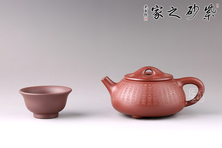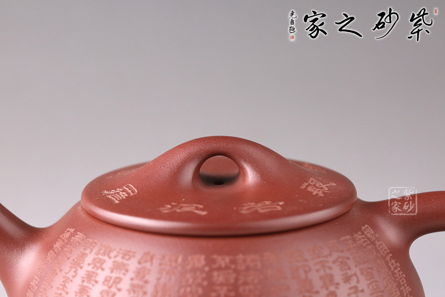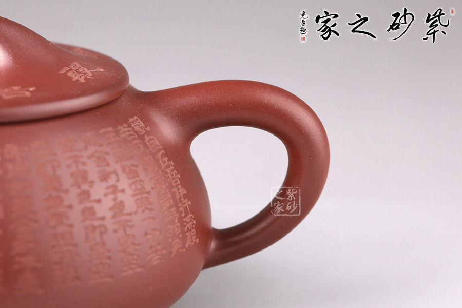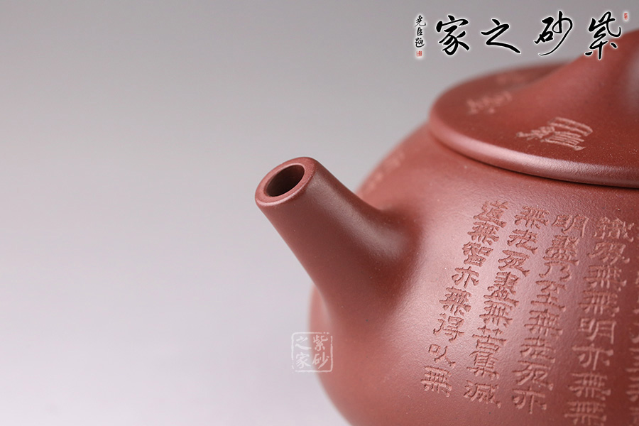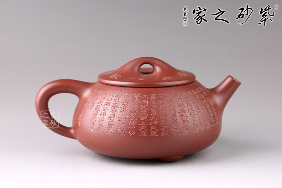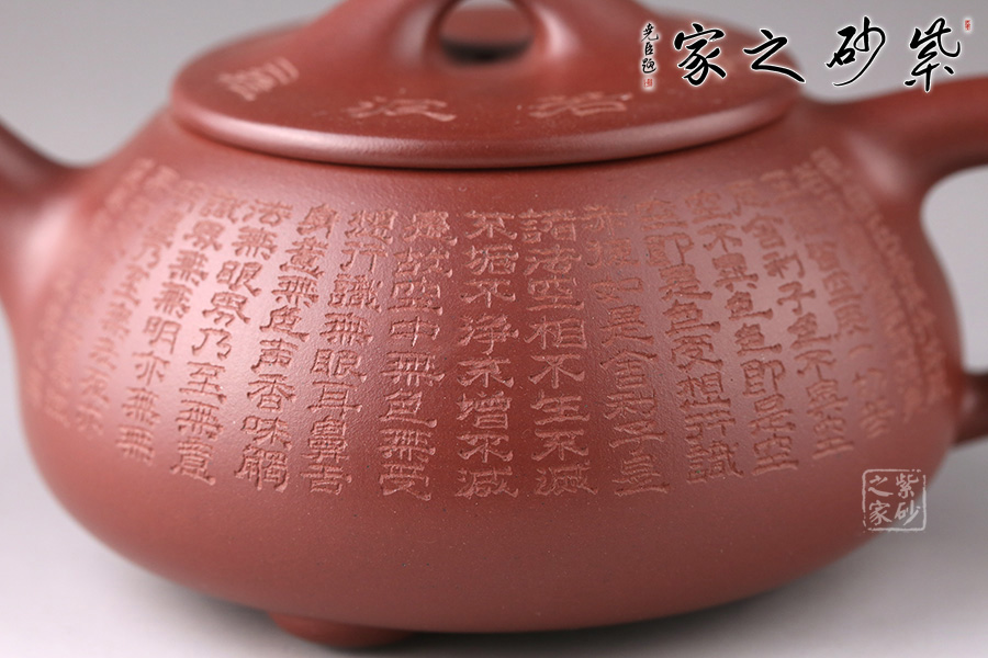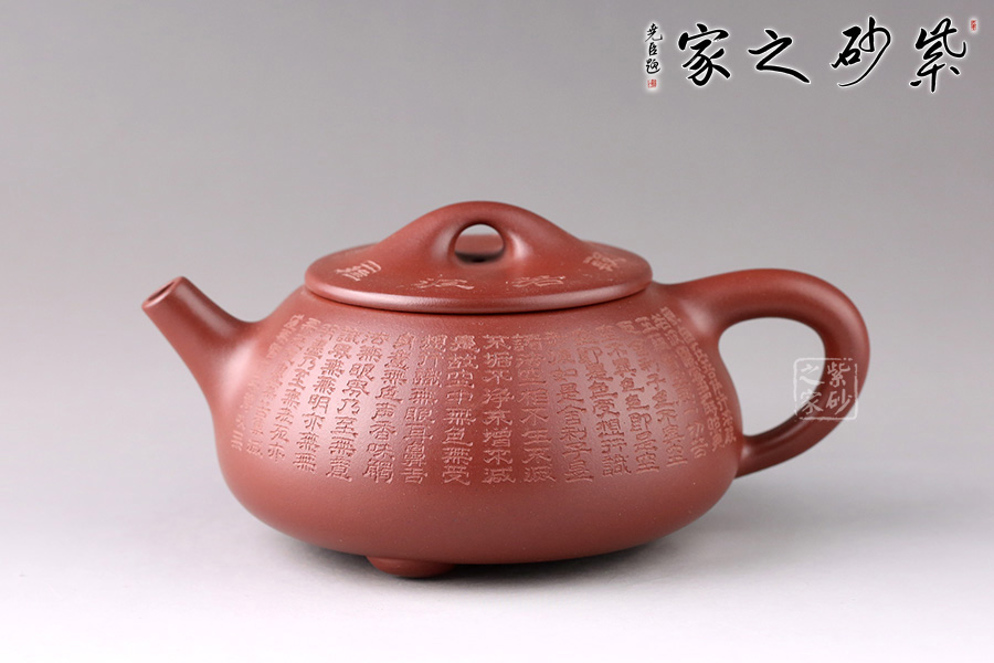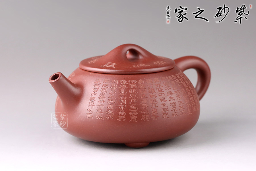 此壺為經(jīng)典石瓢造型,壺身環(huán)刻《般若波羅蜜多心經(jīng)》,經(jīng)典老道的器型配以佛韻禪機豐盈的心經(jīng)刻繪,使石瓢壺披上一層佛家的霞光瑞靄,熠熠生輝。鐫刻筆觸細膩,干凈整潔。造型簡練,整個壺型看上去端莊貴氣之外亦感靈動,值得珍藏。