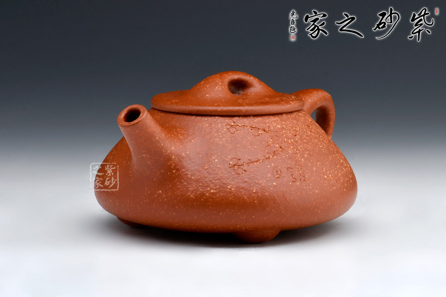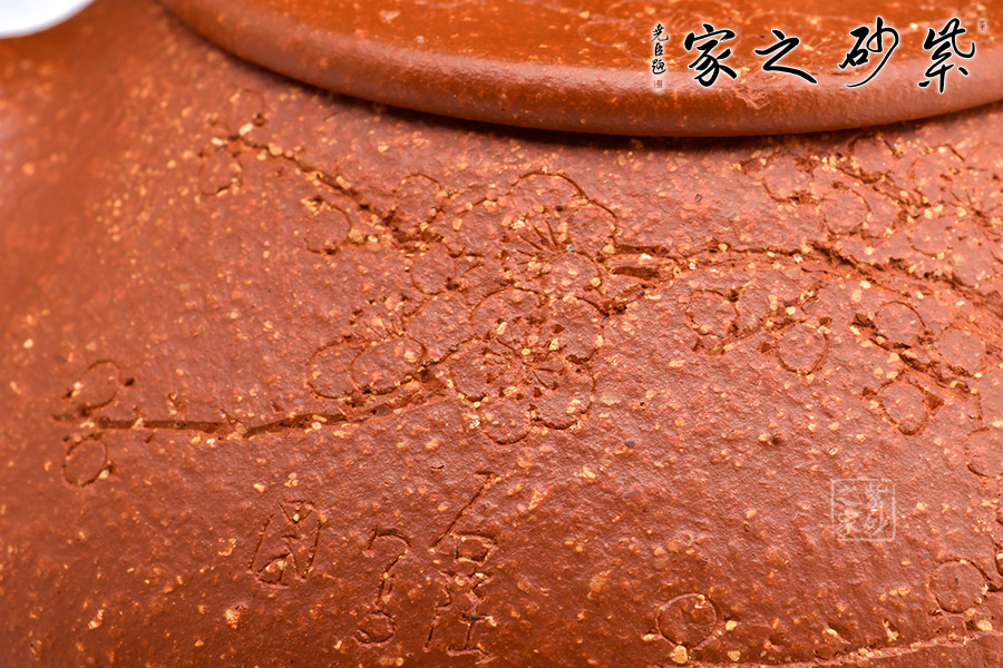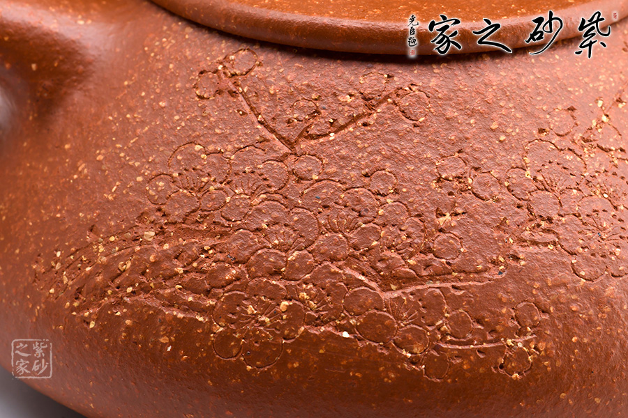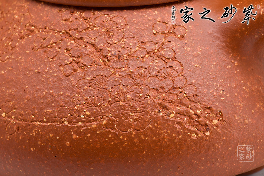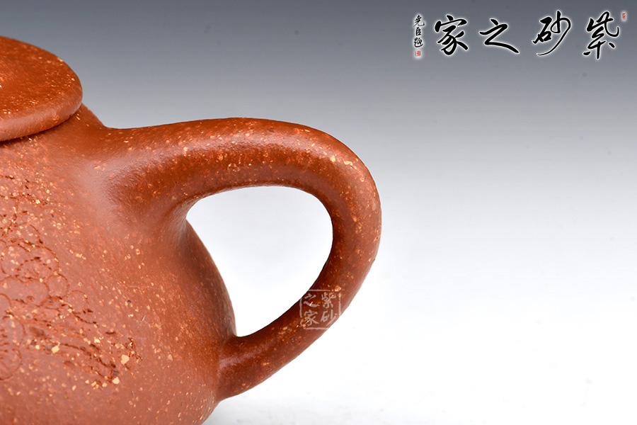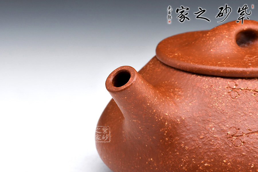 泥性:原礦因含緞泥、紅泥、紫泥等諸多共生礦,陶之后,于深沉之“橙紅色”底上,滿佈五彩斑斕的粗細(xì)、深淺之紅、黃星斑點(diǎn)。