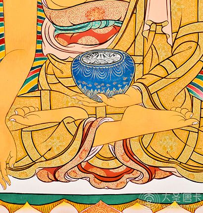 在繪制佛像服飾等位置時(shí),用刻金技法,使圖案更具豐富的層次和立體感,用金勾勒的線條和圖案不但明亮度進(jìn)一步提高,讓畫面更加燦爛,而且也使金在畫面上保持得更加長(zhǎng)久。
