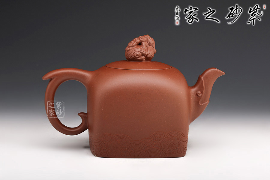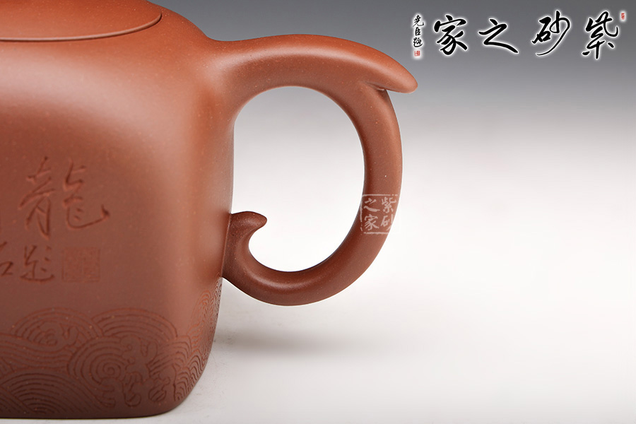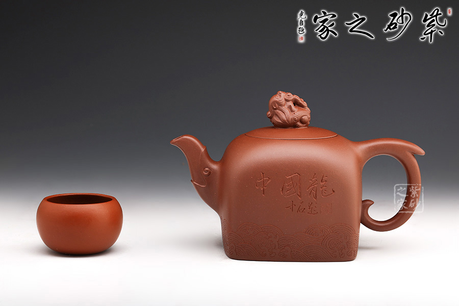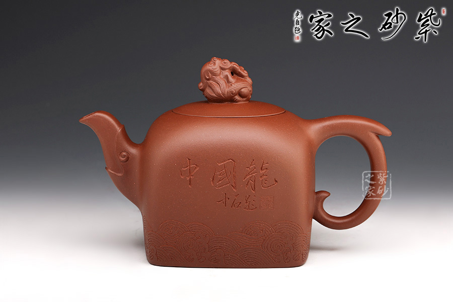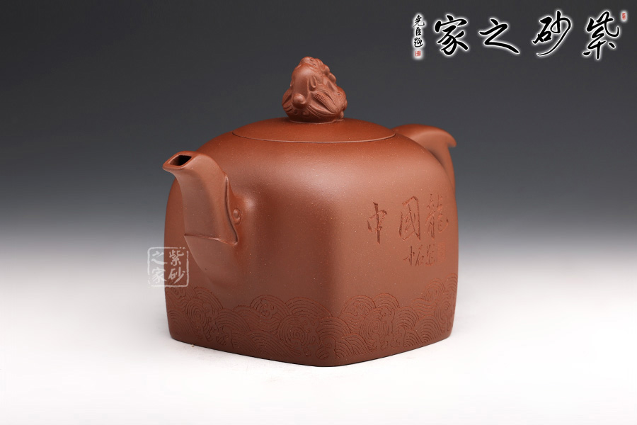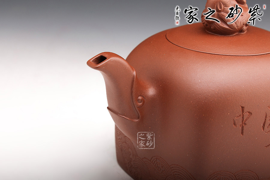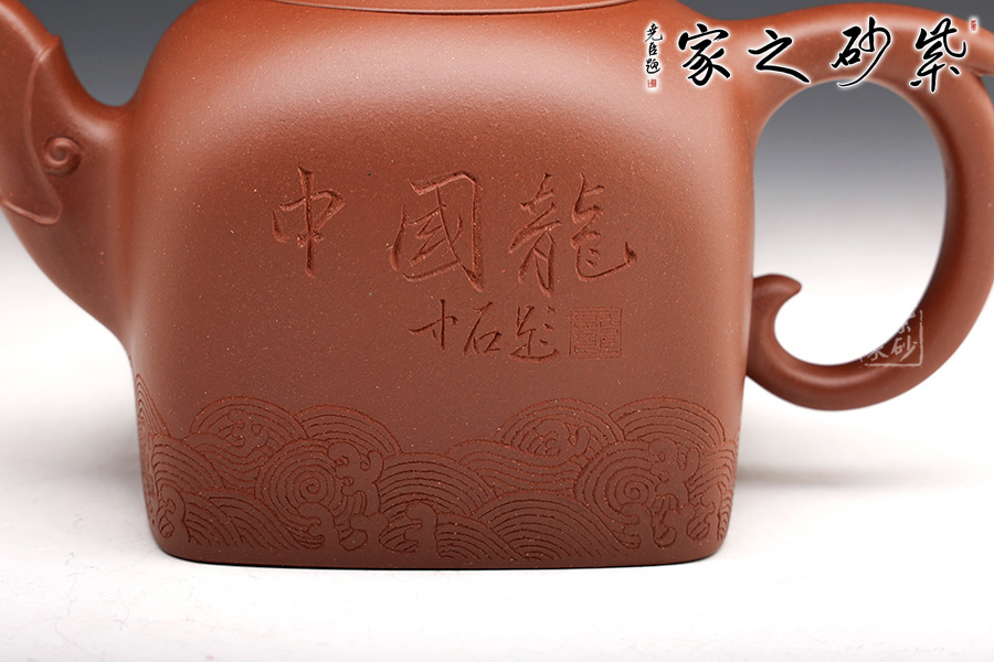 此壺壺鈕為國(guó)璽樣,獨(dú)具匠心,嵌蓋與壺口嚴(yán)絲合縫;壺身方中寓圓,線(xiàn)條流暢,過(guò)渡自然;壺嘴以瑞龍裝飾,出水爽快,耳形圈把優(yōu)雅滑落,壺身刻有“中國(guó)龍”三個(gè)字,與刻繪的花紋相得益彰,照應(yīng)主題。