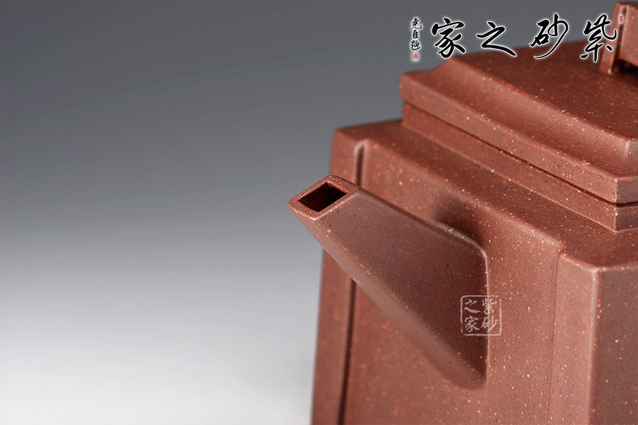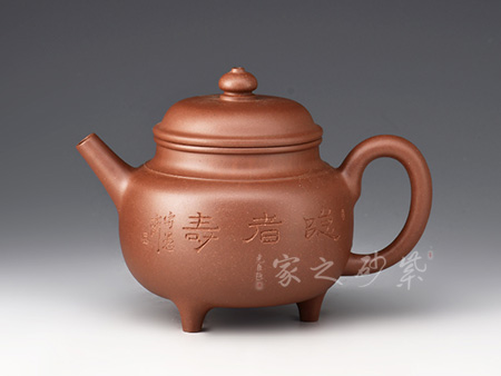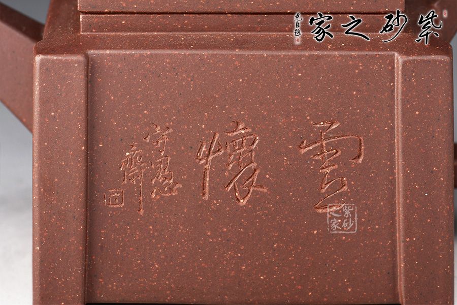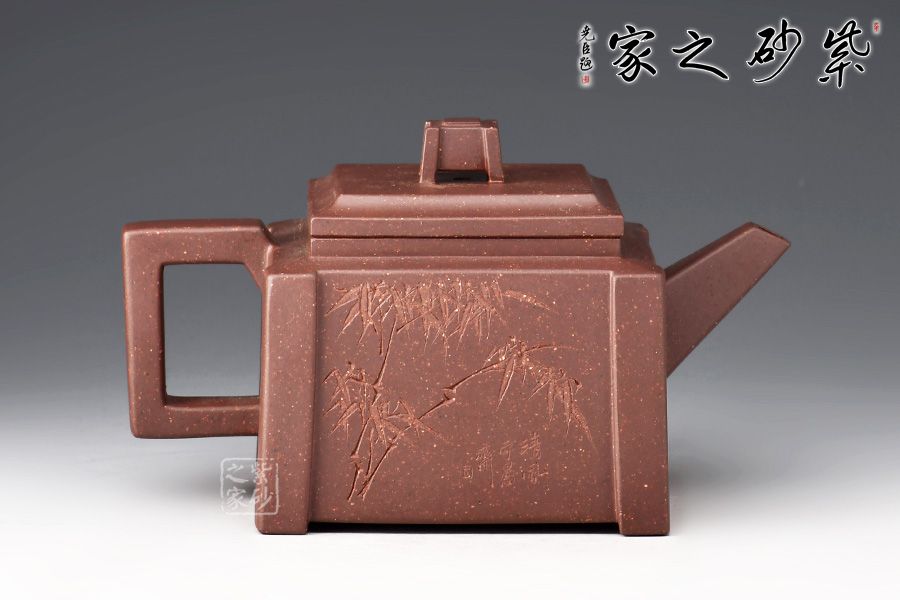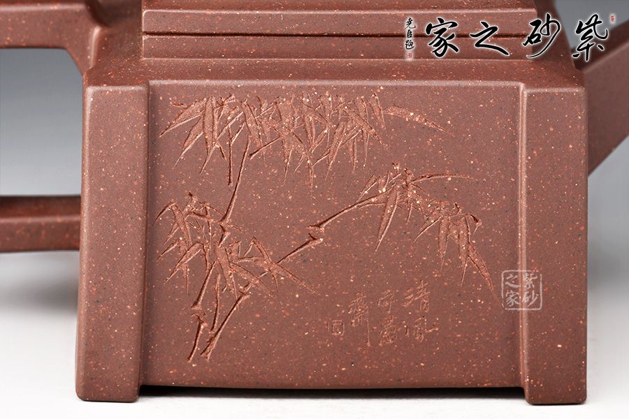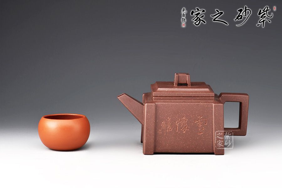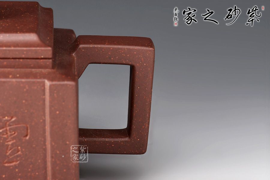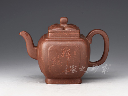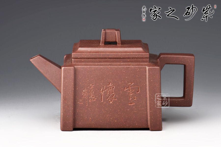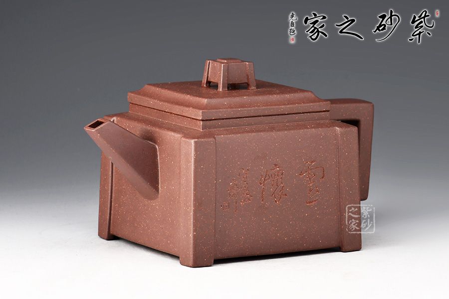 四方壺身,端莊大氣。壺身、壺嘴、壺蓋、壺把皆為方形,塊面挺括,線條利落,比例準(zhǔn)確,透露出豪爽、剛勁、正直的陽(yáng)剛之氣。壺身裝飾書(shū)畫(huà),篆刻一絕。壺鈕乃點(diǎn)睛之筆,似縮小版的壺身,矗立于壺蓋,提綱挈領(lǐng)一般,確立了壺的“身姿。整器質(zhì)樸無(wú)華、典雅端莊,,造型渾厚樸拙。