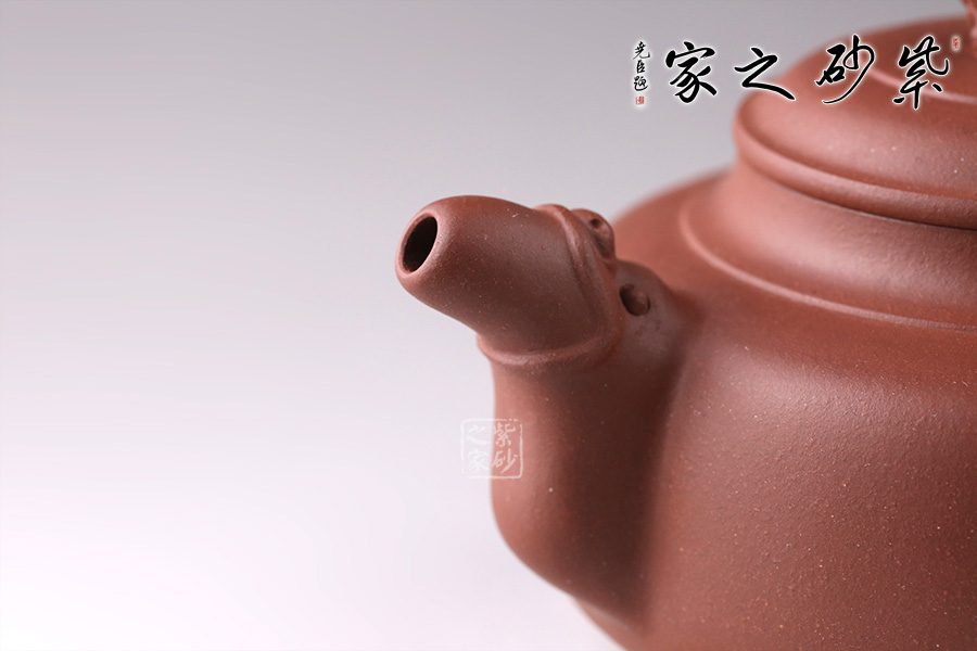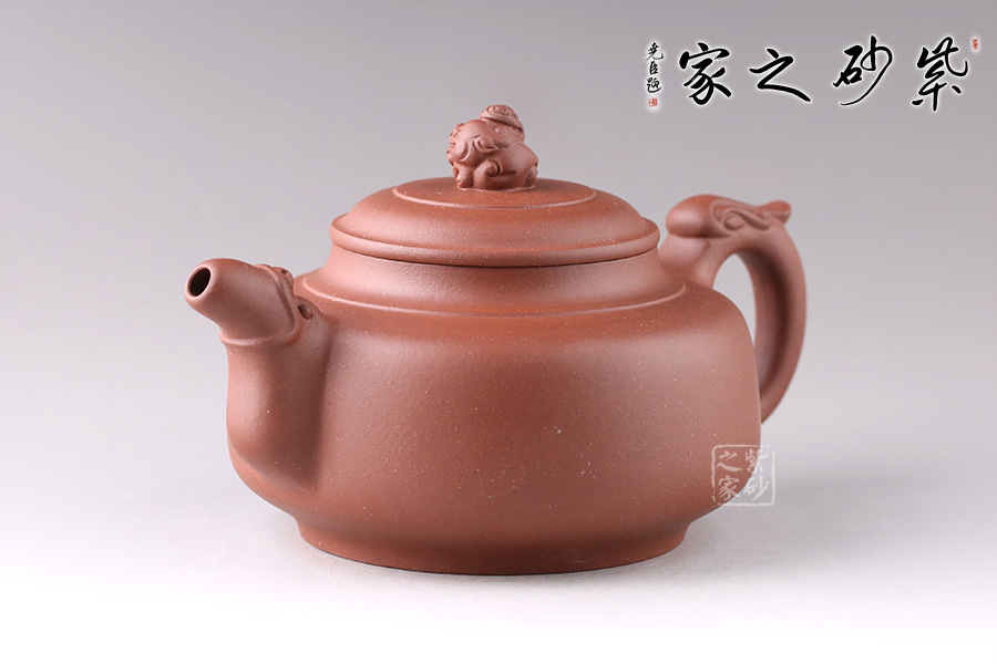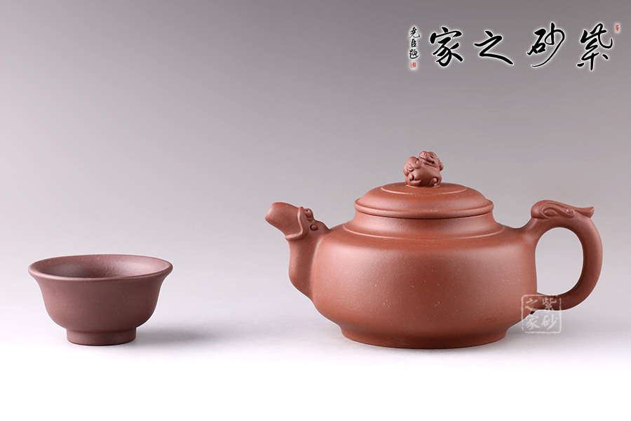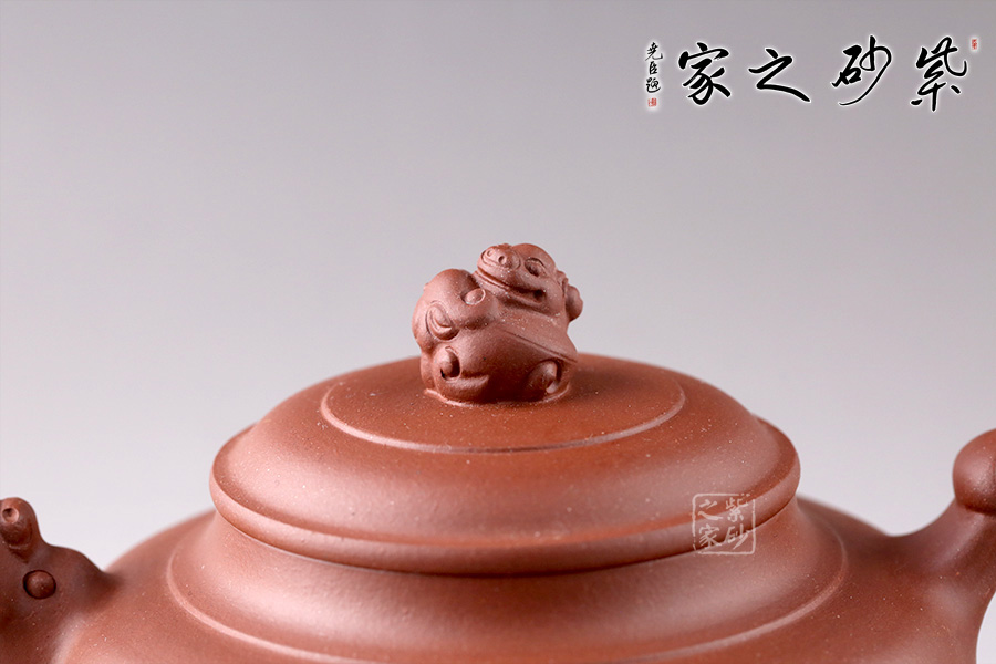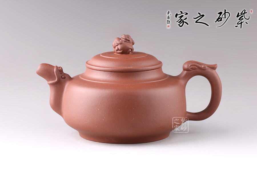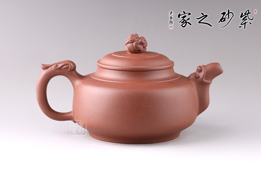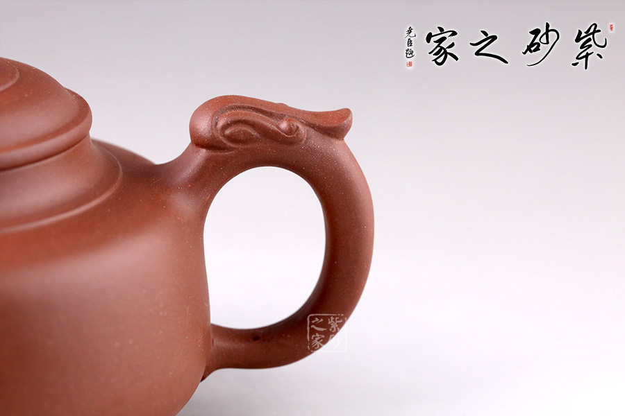 此壺線條流暢舒美,為扁圓壺型,底部?jī)?nèi)斂成圈足,穩(wěn)重大方。龍形流嘴,觀感氣勢(shì)十足,出水迅猛流暢。環(huán)形把似龍尾,姿態(tài)優(yōu)美。龍型壺鈕,造型小巧精致,嘴、把相互呼應(yīng),以龍化形,一個(gè)奮力升騰,昂揚(yáng)向上的形象躍然壺上!