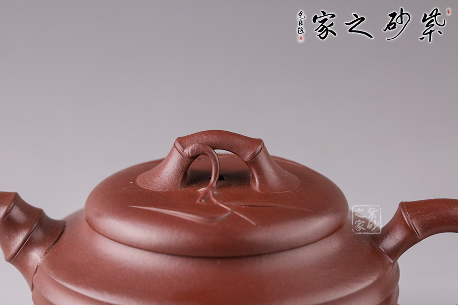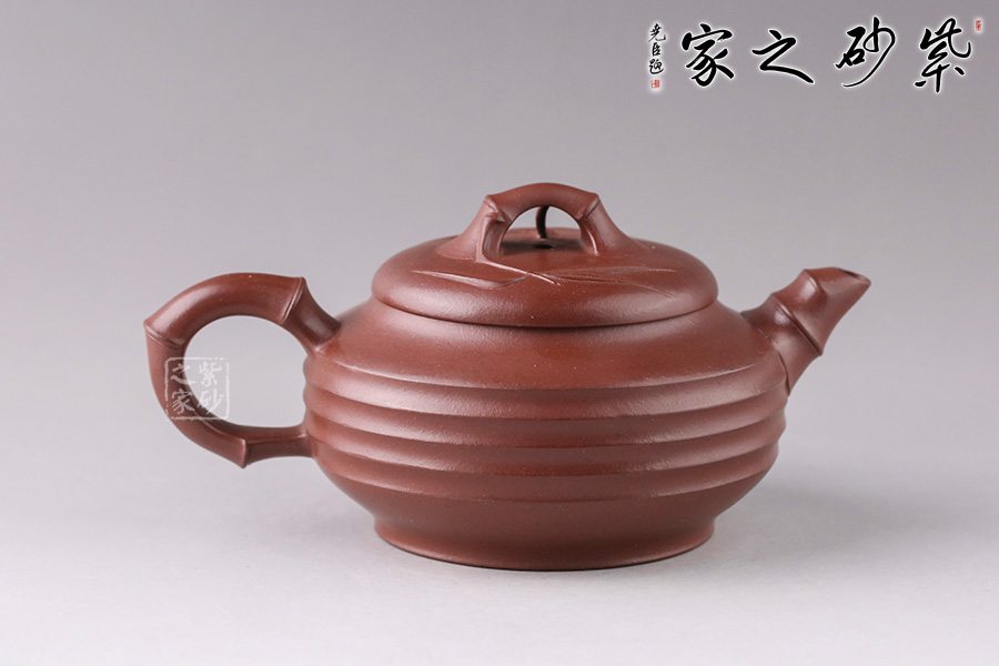 此壺造型精致生動有韻味,充滿精、氣、神、韻。壺身飽滿,下部幾道凹進的圓環(huán),彰顯一種圓潤厚實的感覺。壺鈕為一節(jié)竹節(jié)彎曲成橋梁狀置于壺蓋之中,并用竹葉作裝飾,組配得當,透出一般新,特,細的功力,是飄逸生動的竹系列中的雅品,奇趣頓生。