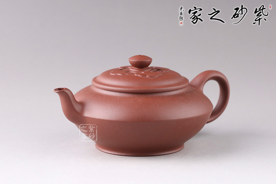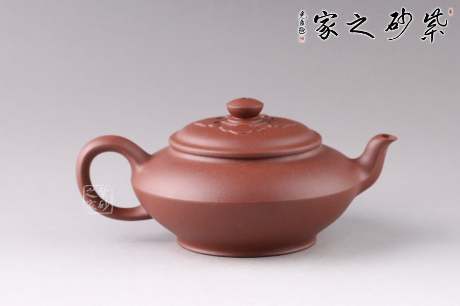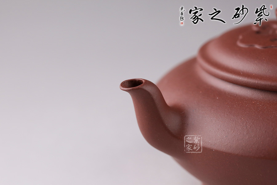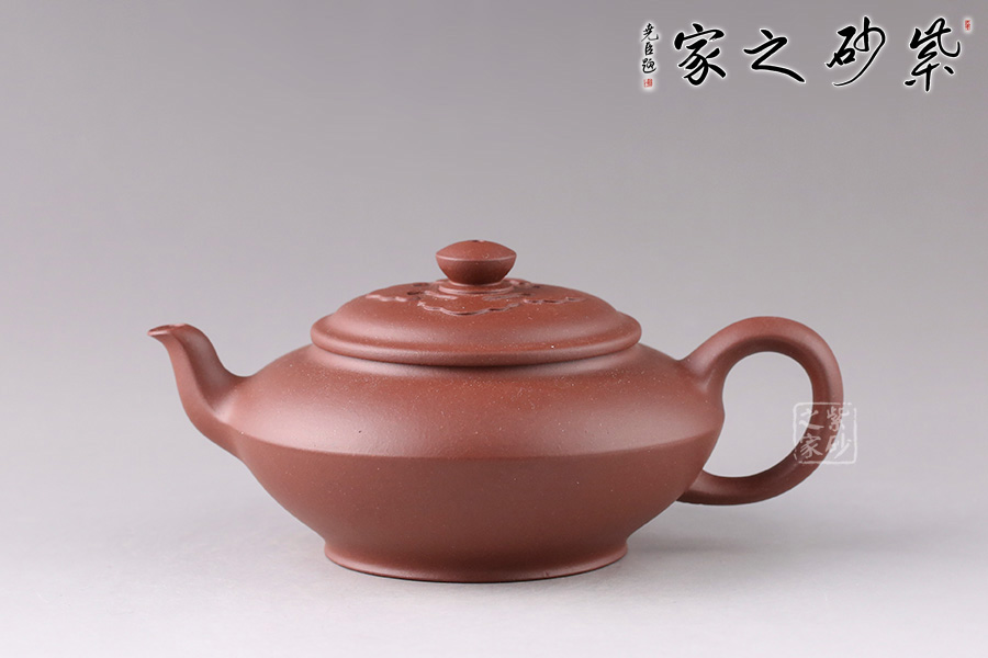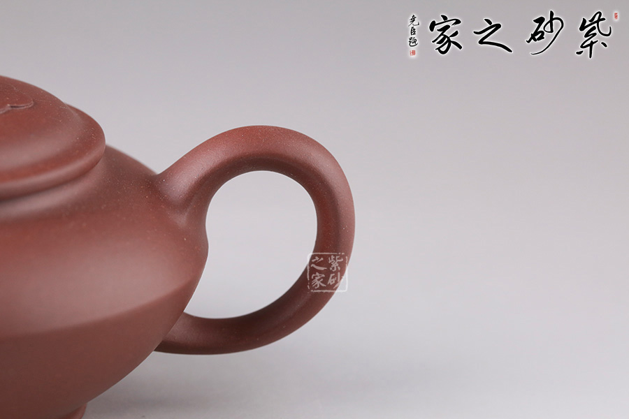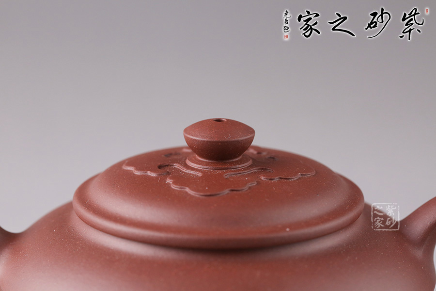 此壺壺身成扁鼓式,腹部折成帶形,壺腹下緣作對應處理,把圓蓄勁。流作二彎,根部略大,以“明接”手法過渡,將壺肩線與壺嘴、壺把的側(cè)線接連一氣,自然舒暢、整體感強。壺鈕似碗,壓蓋與口唇合體,微細中見神韻,蓋面裝飾如意祥云,呼應主題。
