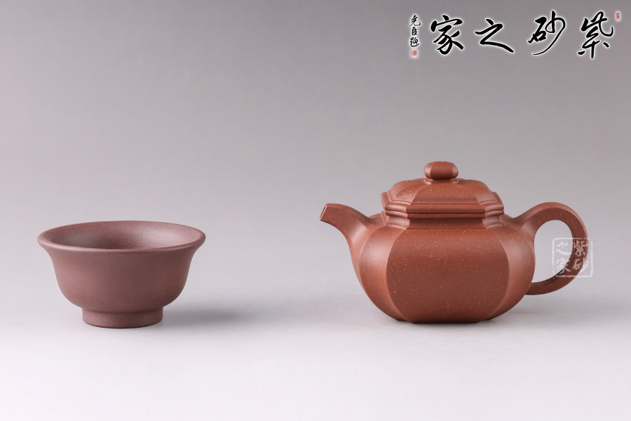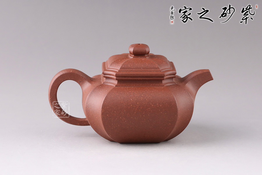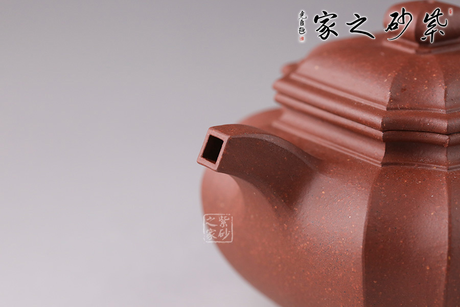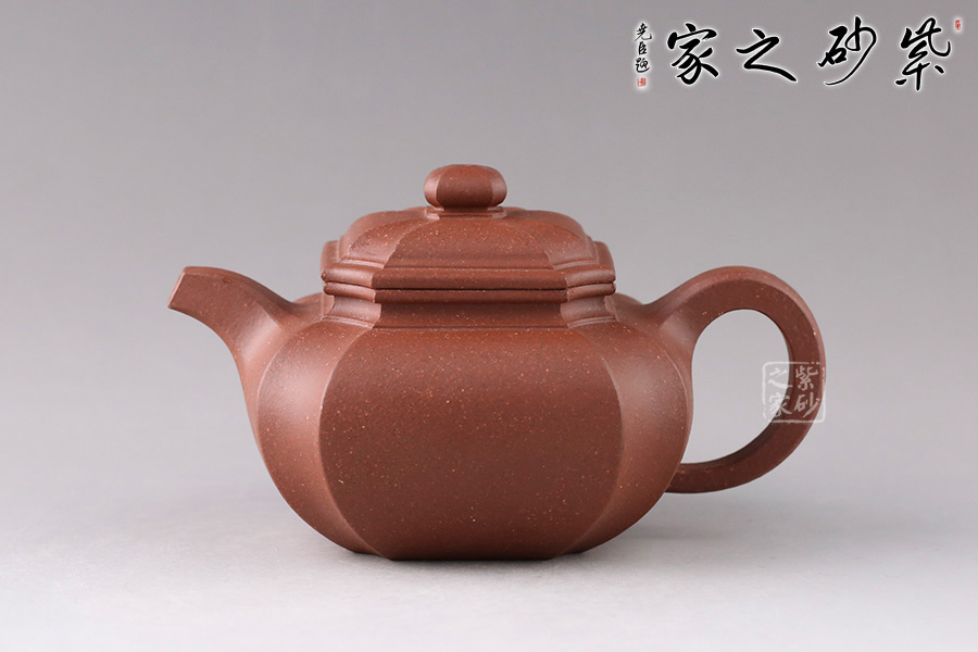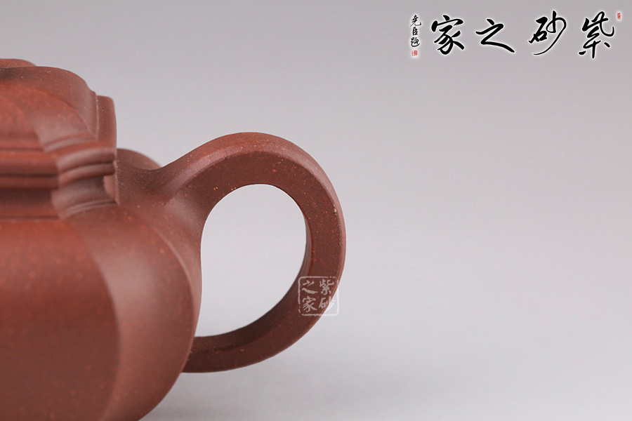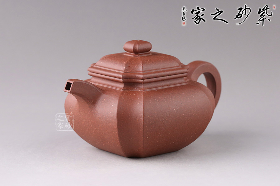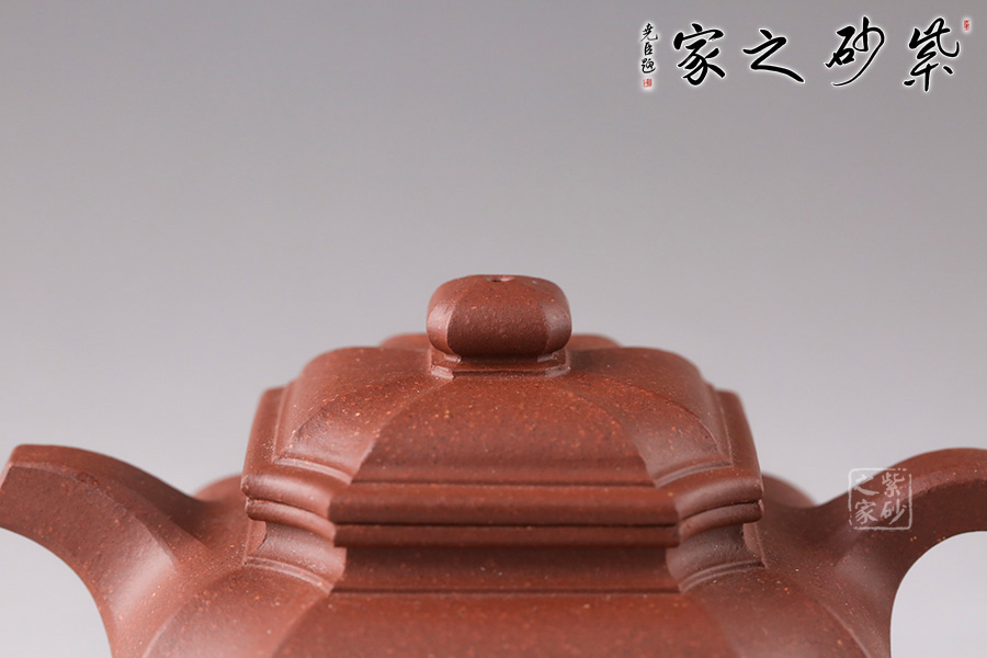 “扁腹”之扁乃是“扁圓”,既非扁平,也非扁方,紫砂之氣勢(shì)以飽滿(mǎn)為重,故扁腹造型壺身之弧度處理極難,多一分顯蠢,少一分則顯弱。 此四方扁腹在其基礎(chǔ)上結(jié)合四方器的特點(diǎn),鈕、蓋、壺身與流、把皆為四方形。四角作圓化處理,線(xiàn)條流暢,壺身飽滿(mǎn)。無(wú)論是拔高的壺肩、舒張的壺口或是抽角處理的壺身都體現(xiàn)了作者高超的技藝,乃是不可多得的佳器!