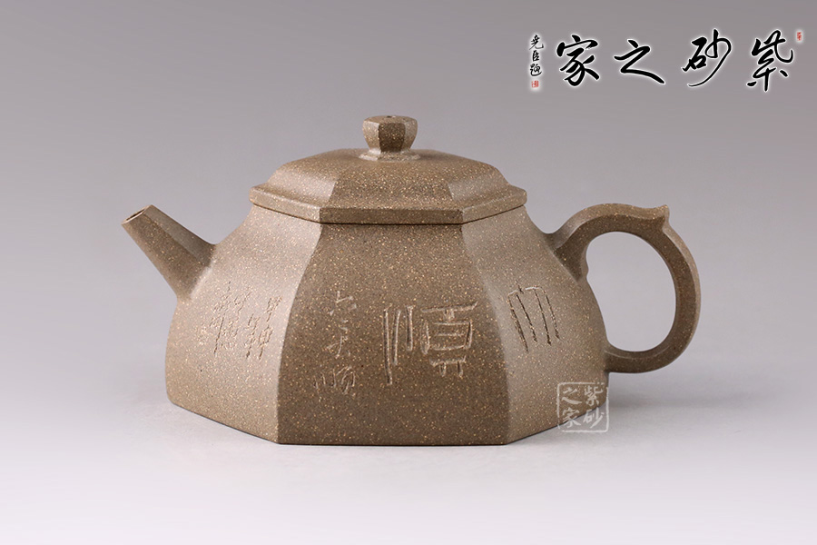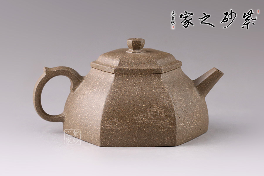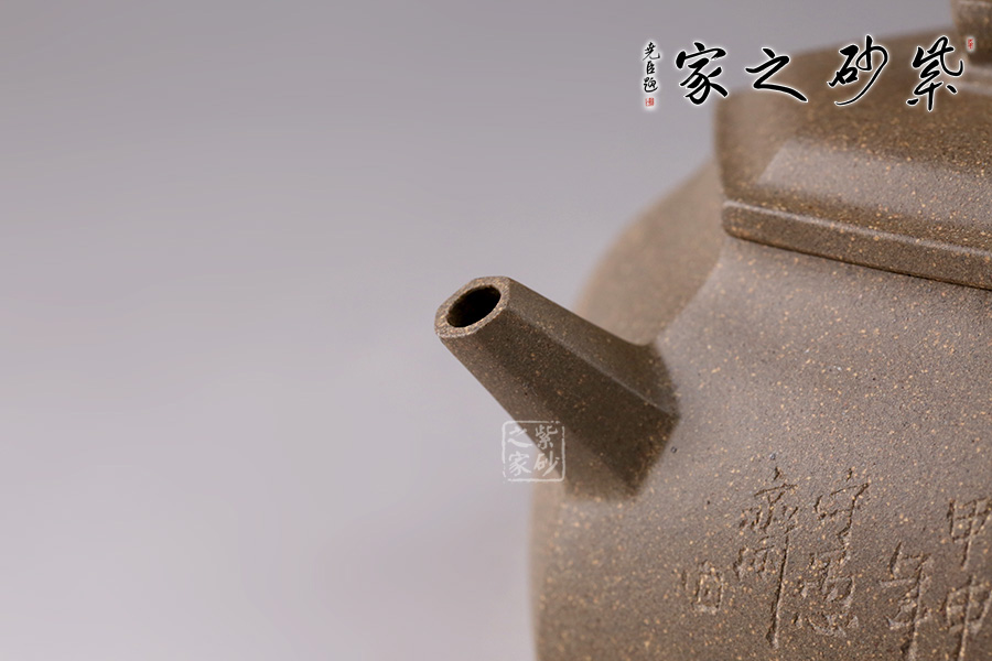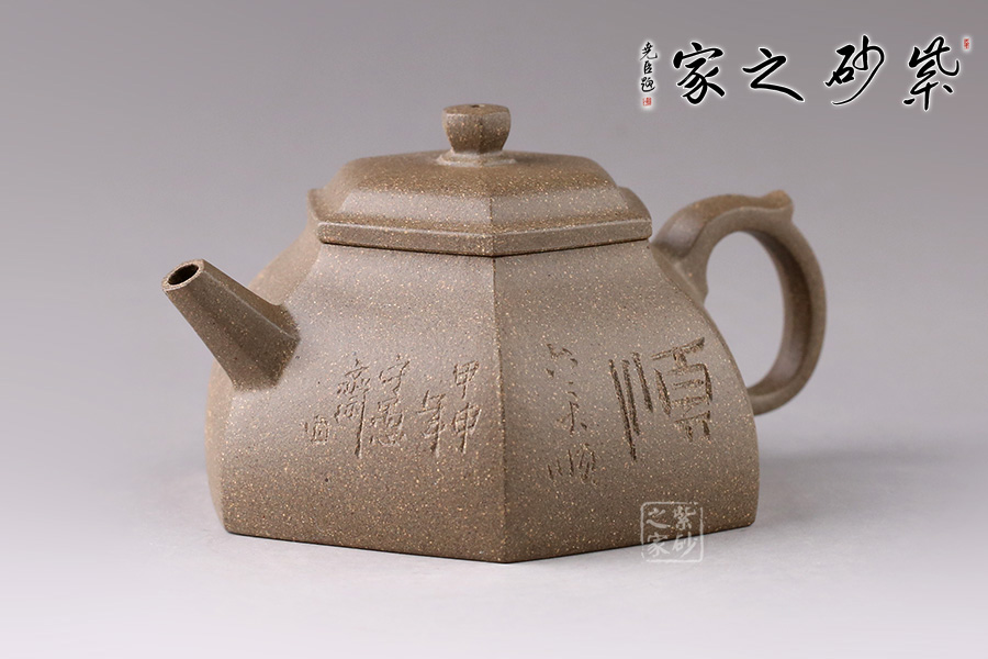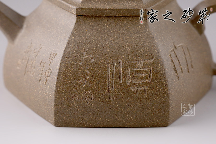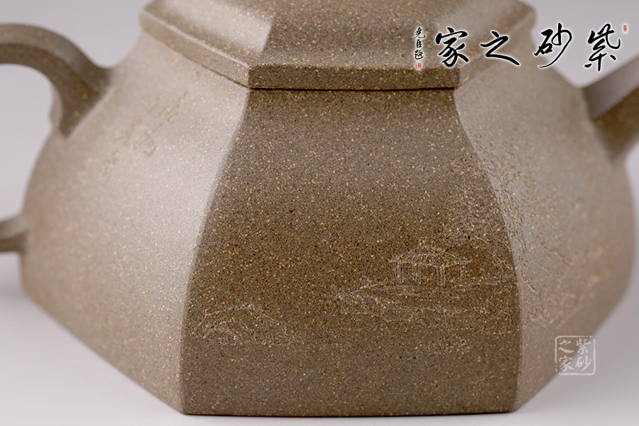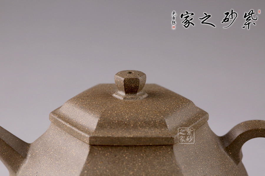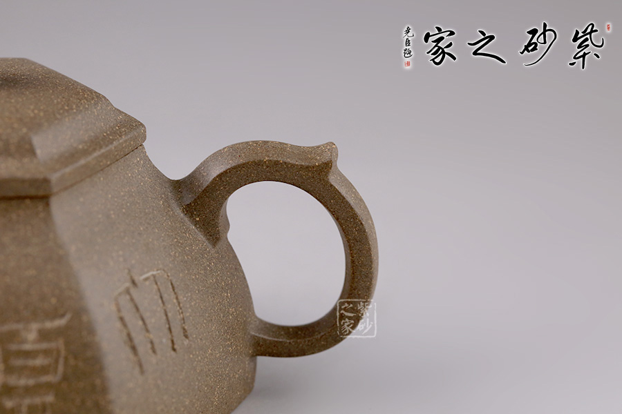 壺身以六片梯形泥片結(jié)構(gòu)而成,重心不移,結(jié)構(gòu)周正。壺頸與蓋緣連結(jié)成一立面,俯視,壺身、壺口、壺蓋、壺鈕均為六方形,整壺剛?cè)岵€條流暢,婉轉(zhuǎn)而又大氣,造型簡潔洗練,方正大氣,形態(tài)自然,無銜接之感。