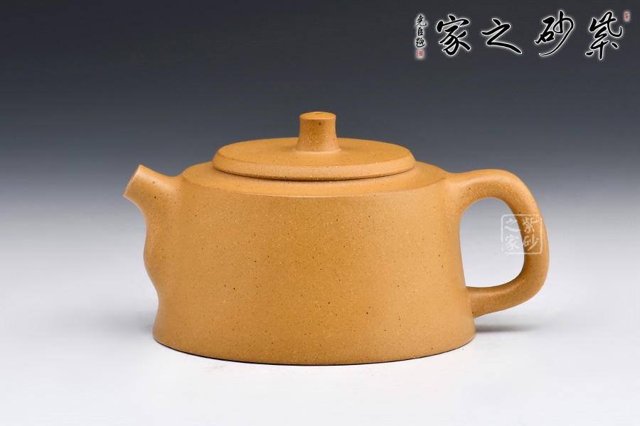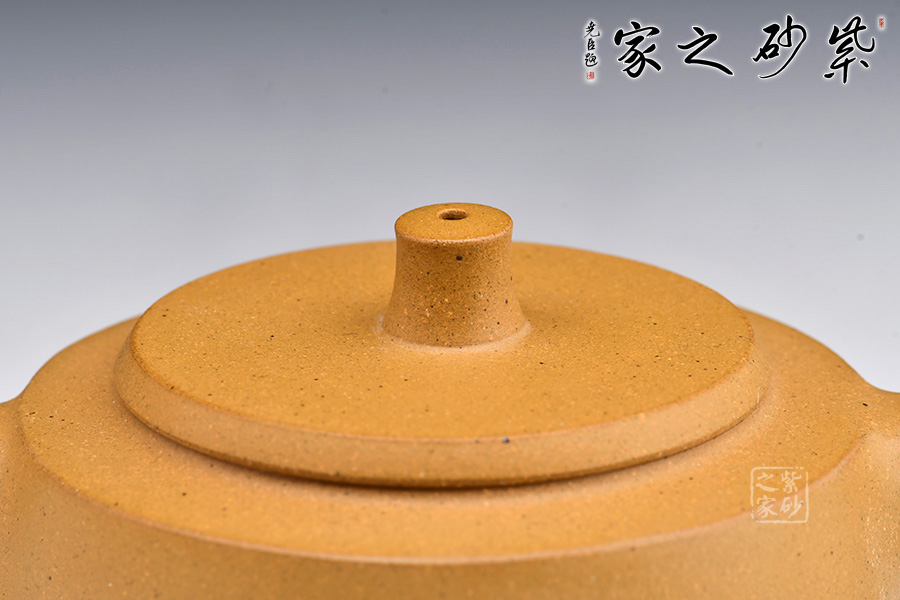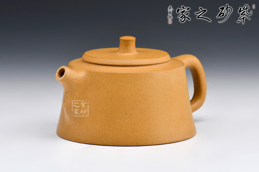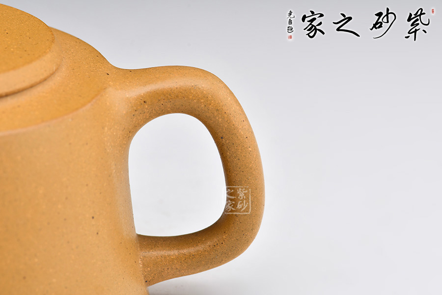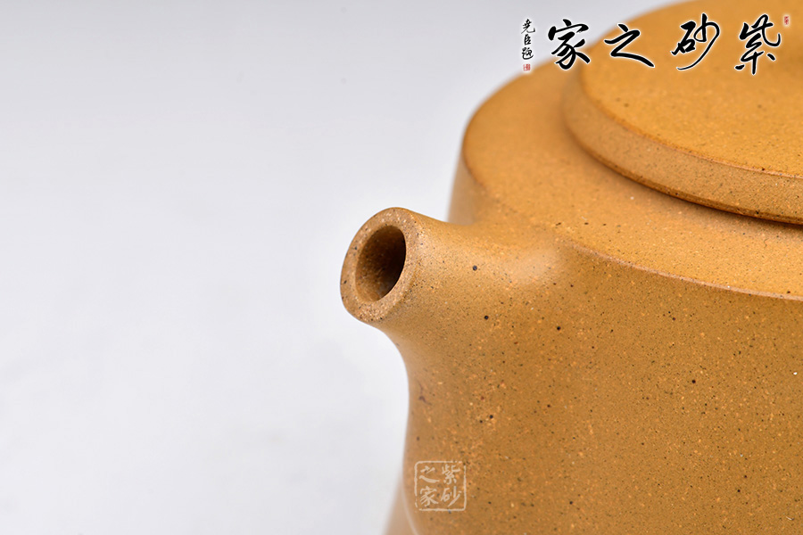 整壺壺身較矮,梯形狀的壺身,上斂下豐,壺底大而穩(wěn)重,肩線分明,蓋與壺肩相平,中間略顯平整,層層疊疊,直筒短嘴下加一彎,出水流線更美。壺鈕圓柱形,方便拿捏。