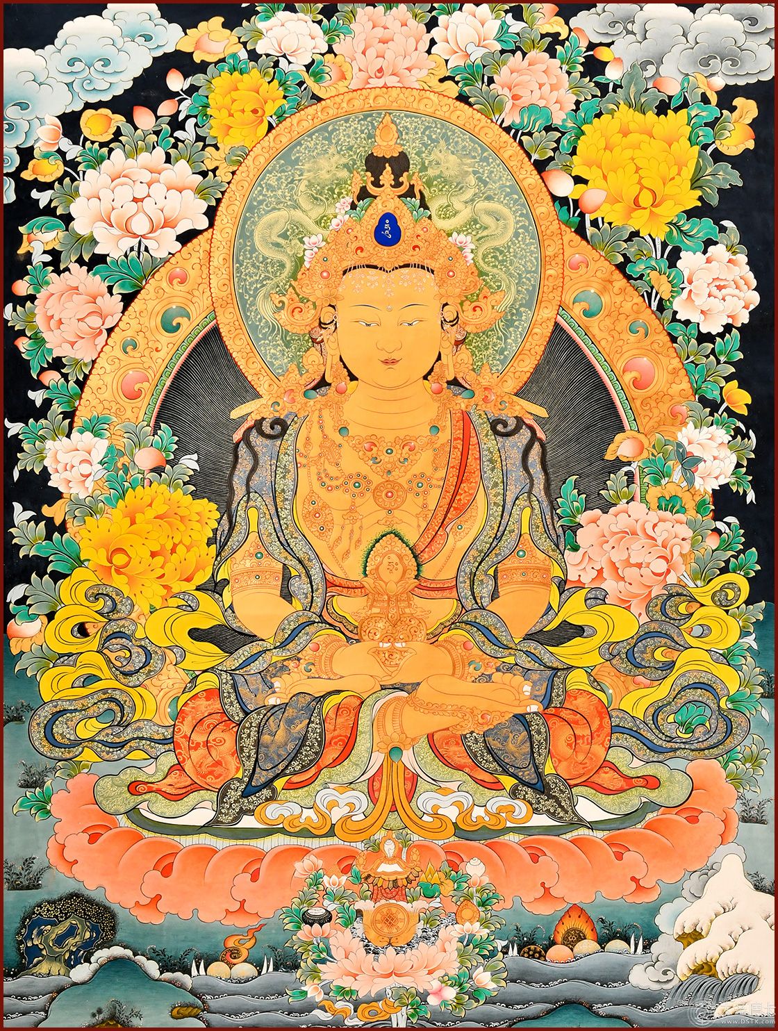 產地:熱貢 工藝:彩唐 創作年份:2021 題材:長壽佛 繪制時間:6月 尺寸:*70*100cm 裝裱: 材質:織面 使用場地:書房