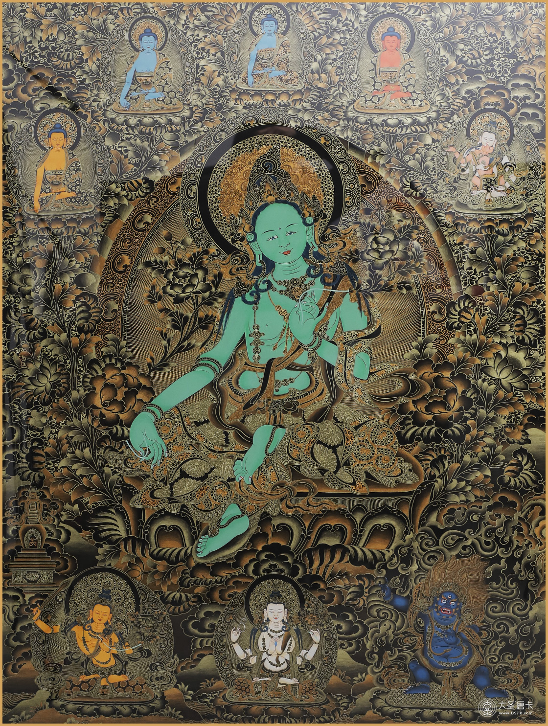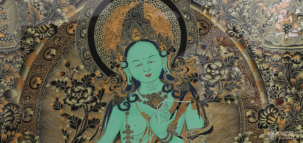 綠度母,藏語叫“卓姜”,是從觀音菩薩的眼淚中化現出來的,所以最慈悲。綠度母為所有度母之主尊,總攝其余二十尊化身之所有功德。因其救度之迅速、摧滅魔業(yè)之勇猛,故又稱作“救度速勇母”。