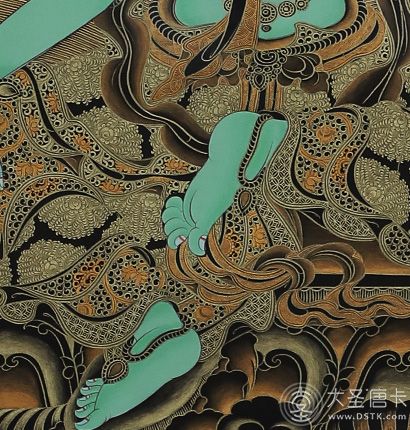 該作品在表現形式及構圖和設色上吸收了漢地工筆畫的畫風,與藏傳繪畫藝術兼容并蓄,在傳統(tǒng)上加進自己對繪畫和佛教的理解來創(chuàng)作,意境遼遠。線條的繪制手法精湛,細致而不纖弱,流暢舒緩。
