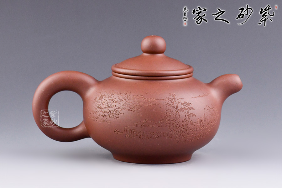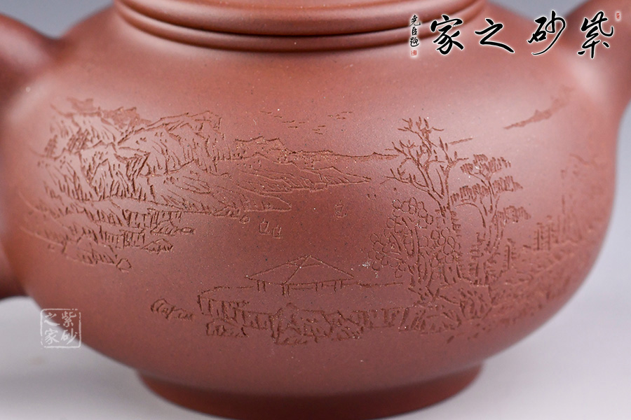 此壺為父子合作款,天樂刻繪,遠山近水,意境幽遠,刻繪詩句“青山多畫意,春雨潤詩情”。筆力俊秀飄逸。