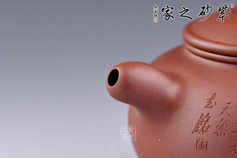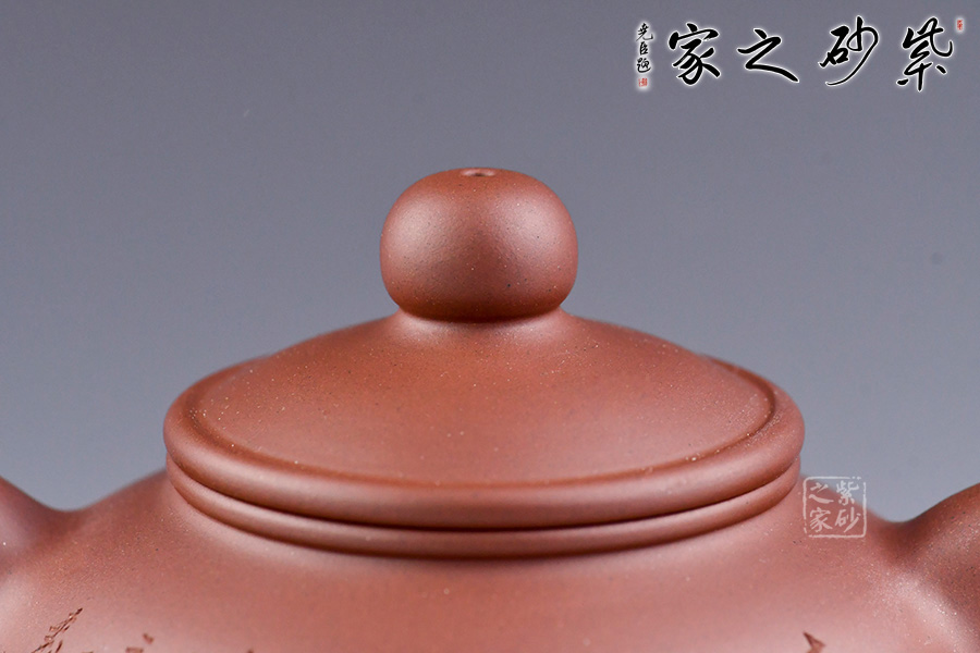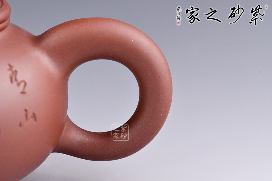 此壺為王福君老師新作,傳統(tǒng)之上有創(chuàng)新,泥質(zhì)細膩,瑩潤可愛。造型簡練,大方,球腹,矮頸,彎流,把如肥耳,流把勻稱自然,口蓋緊密,蓋上設(shè)小球鈕。壺形樸拙渾厚,造工精細,美妙絕倫,古雅美觀,制作頗見功力!