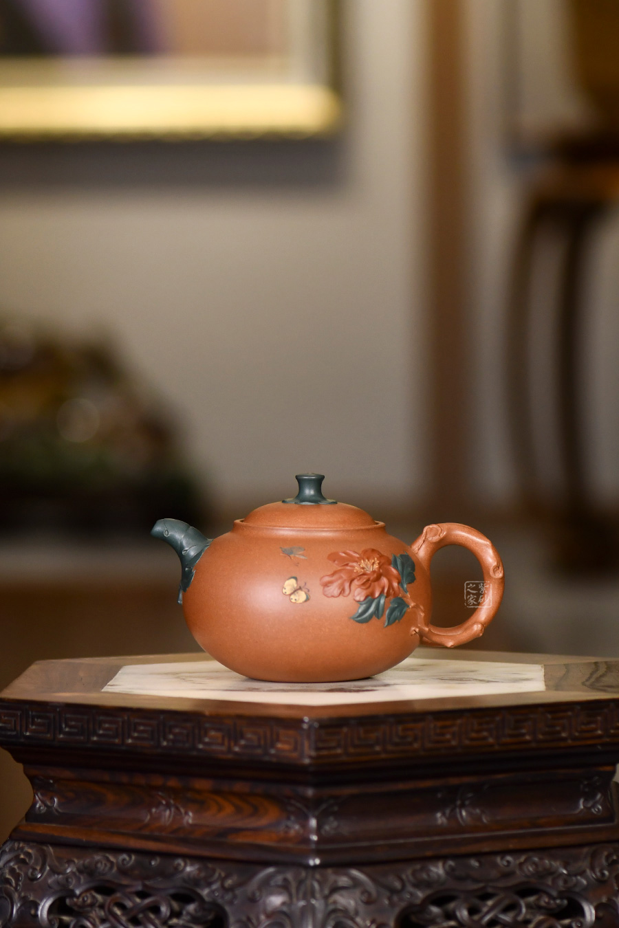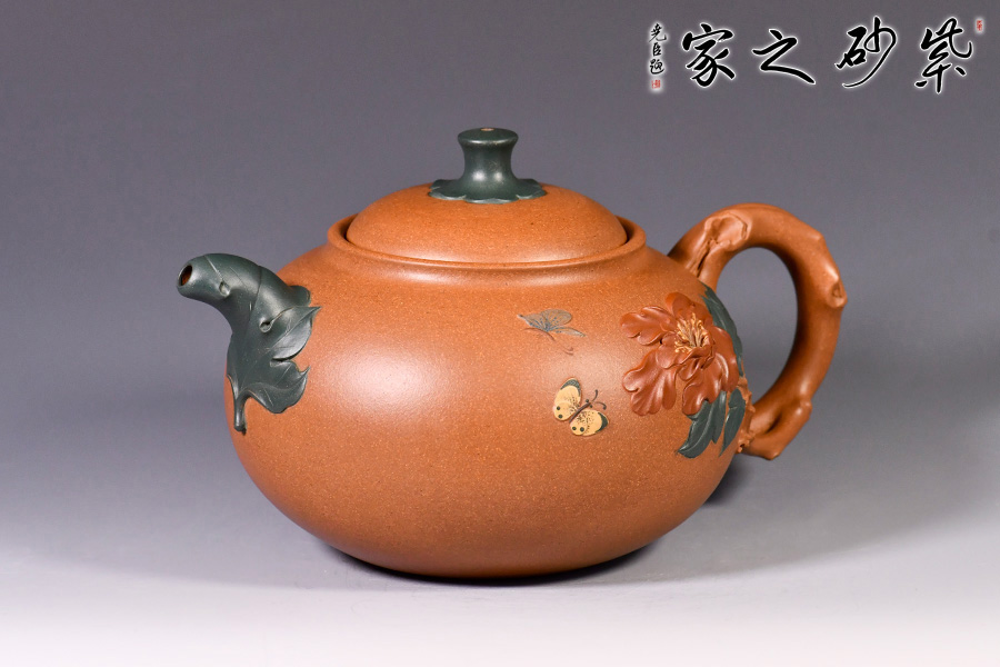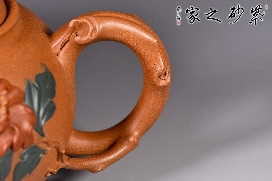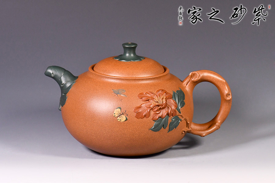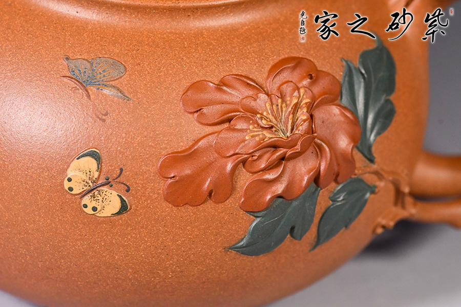 牡丹花開,從容華貴,氣質天成,如洛神出水,一顧傾城,一瞥驚鴻,讓人不禁想起《詩經(jīng)》里“月出皎兮,佼人僚兮”的絕美句子來。 季益順老師的牡丹壺由原礦段泥精心制作而成,色澤亮麗。壺身飽滿有力,泥繪牡丹花,花朵飽滿,片片花瓣,充滿生機活力;彩蝶紛飛,花香撲鼻,徜徉置身于花叢中。壺把似花枝,癭節(jié)遍布,做工精湛。一彎嘴,出水流利。口與蓋互相吻合,絲毫不差。整體做工精致,瓶身泥繪寫意悠遠,十分貼合壺名,猶如美人出水芙蓉。