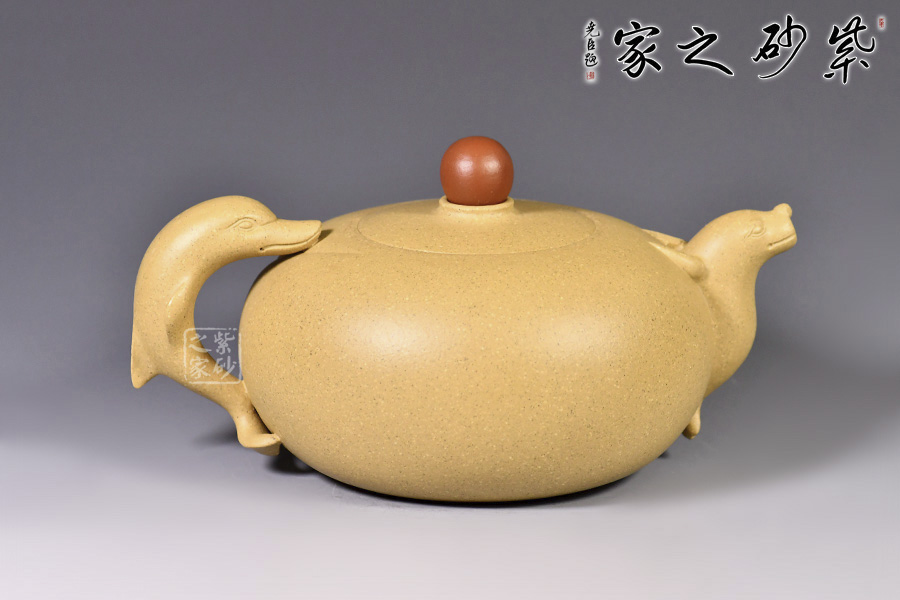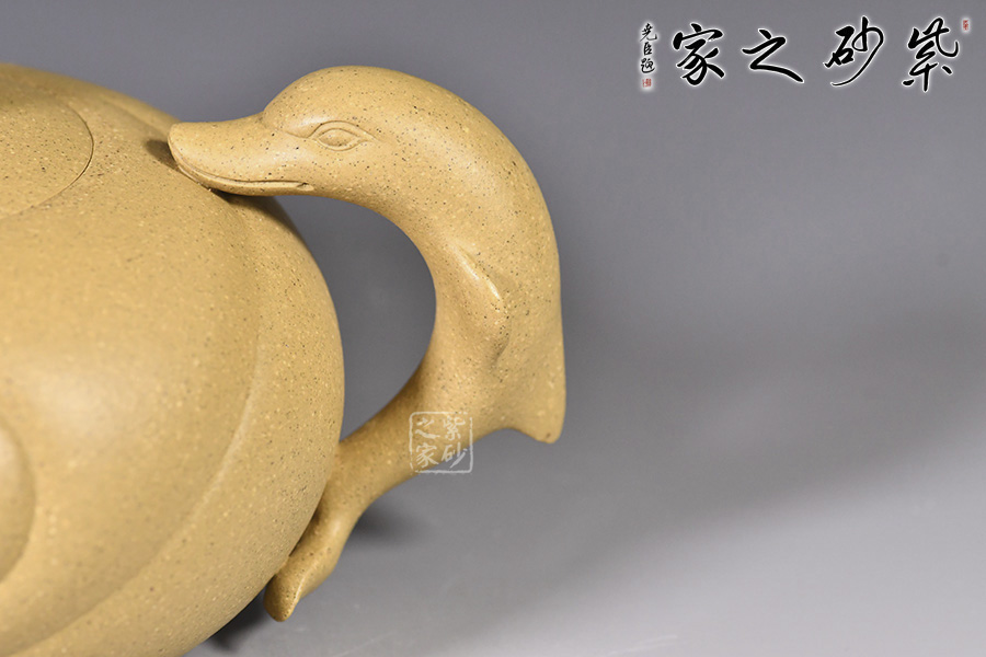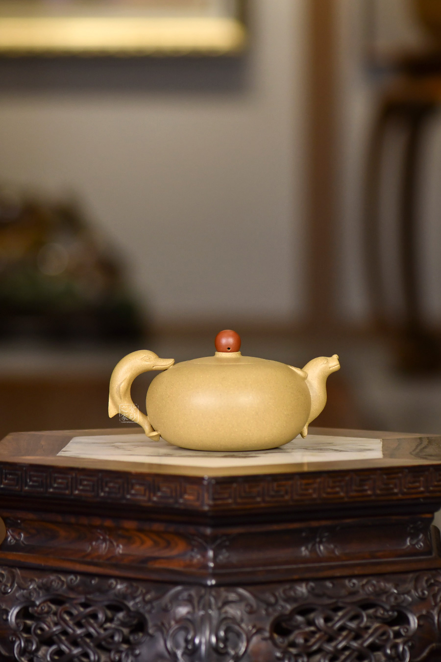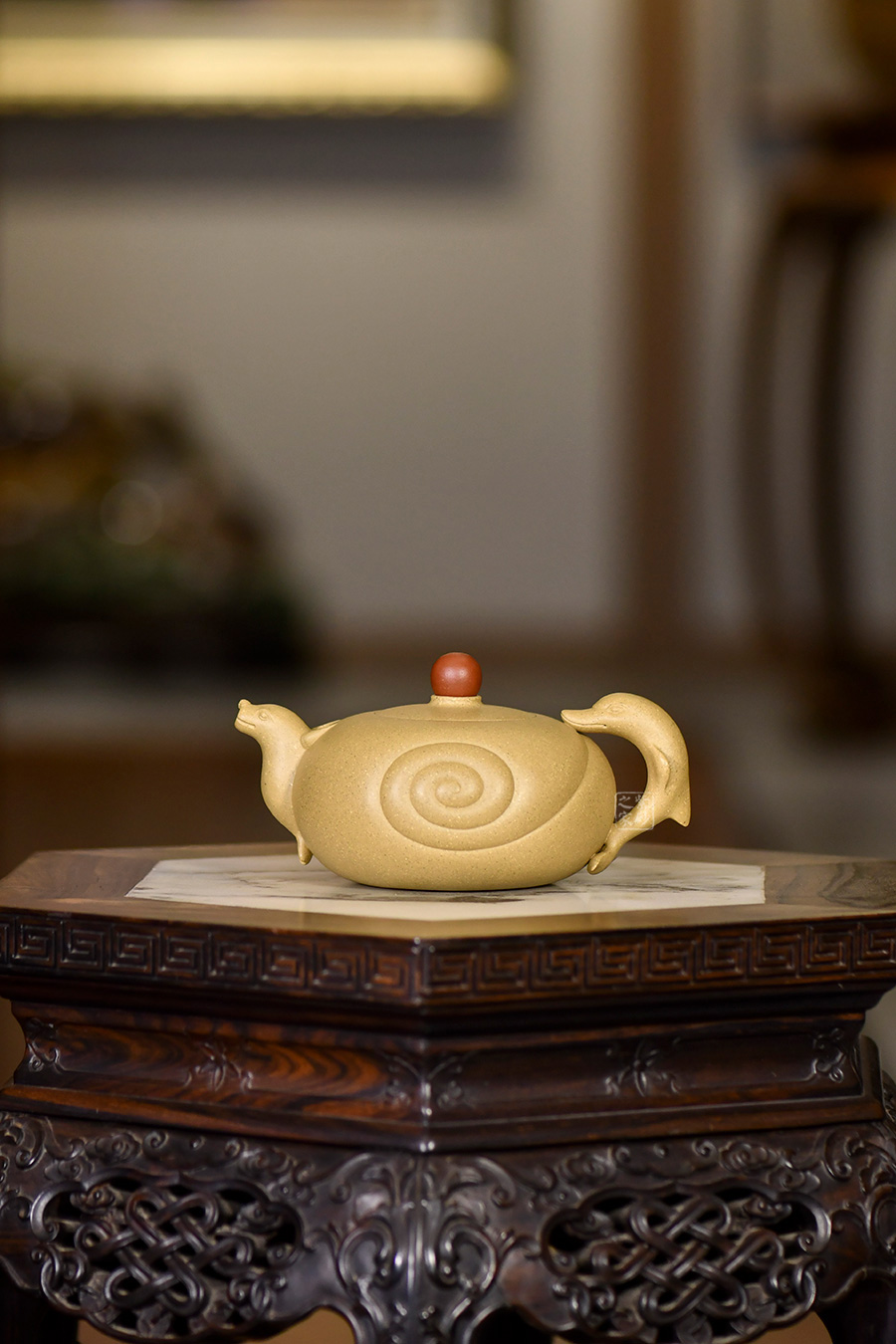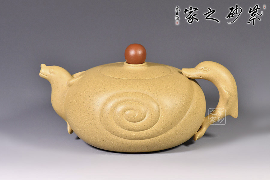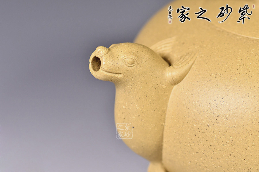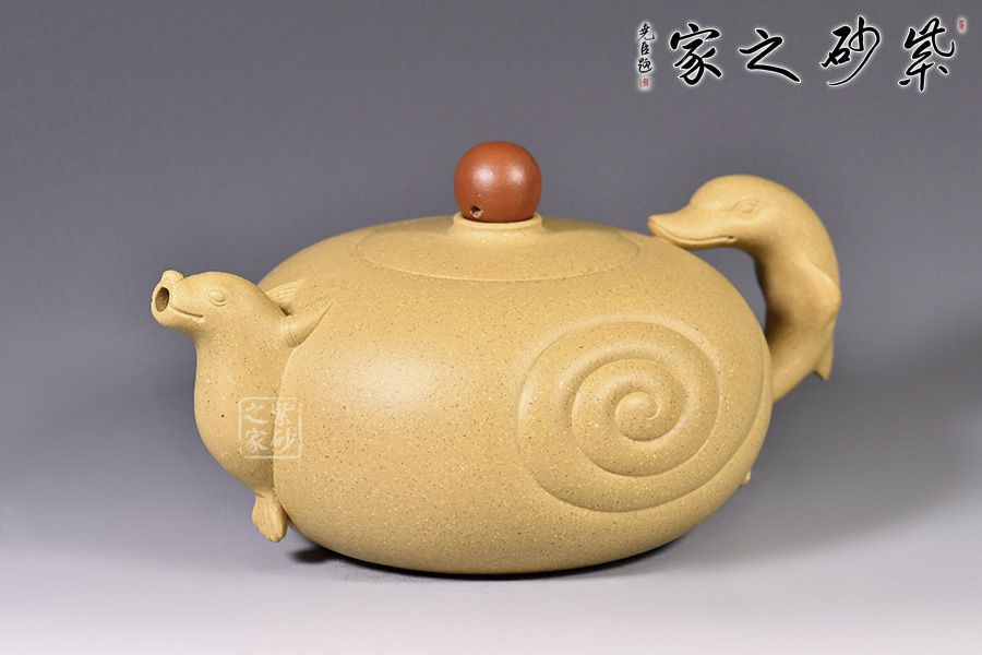 壺身采用段泥制作而成,表面質(zhì)感十分豐富,透氣性良好。此壺制作工藝十分新穎,壺身渾圓略扁,蝸牛殼紋理,十分具有趣味性。壺嘴、壺把造型獨(dú)特,分別以海豹為嘴、海豚為把,制作工藝精細(xì),造型逼真。壺蓋與壺身嚴(yán)絲合縫,球形壺鈕,圓潤可愛,簡潔明快。