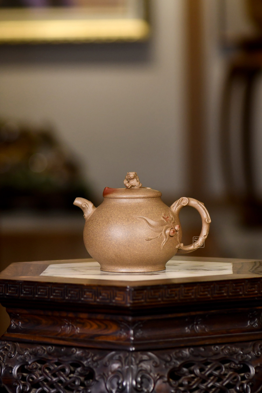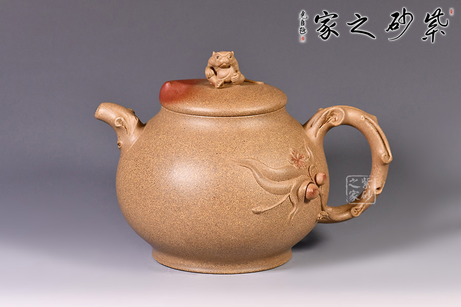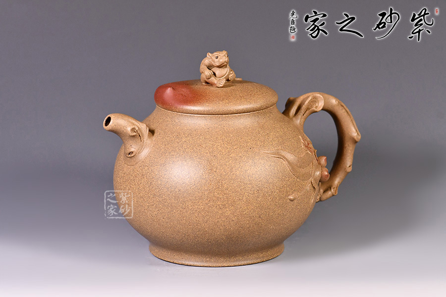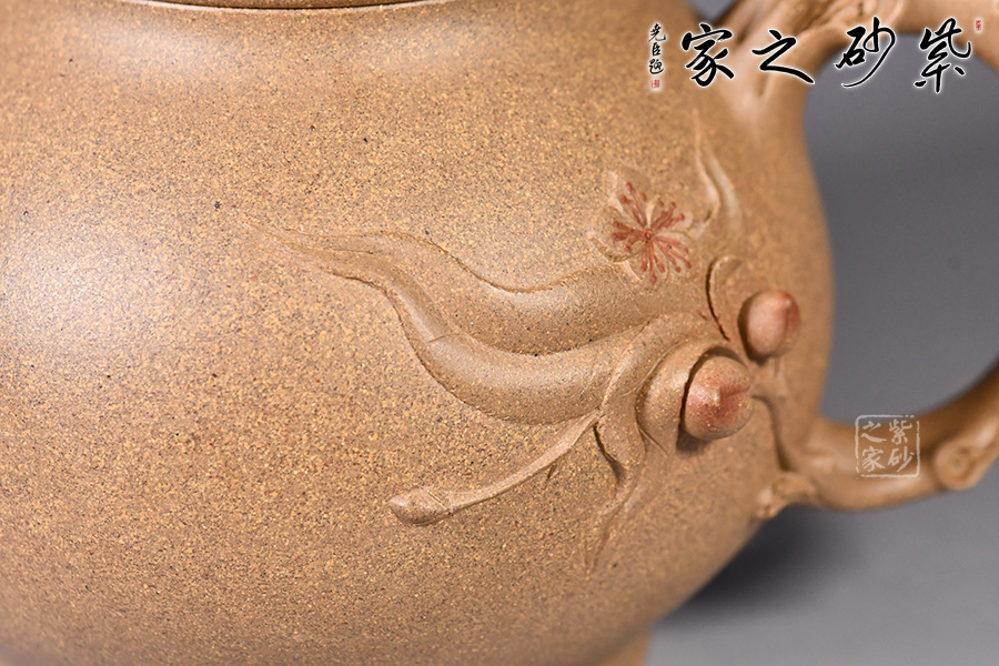 此壺構(gòu)思精巧,設(shè)計(jì)新穎,別具巧思,獨(dú)一無二。壺身圓潤,挺立。壺嘴、壺把似桃樹干,樹身紋理細(xì)致。壺把底部延伸出一支桃干延伸至壺身,桃子立體小巧可愛,貼花生動(dòng),栩栩如生,細(xì)節(jié)處理巧妙,制作工藝十分精湛。壺蓋似桃,設(shè)計(jì)巧妙,鈕為靈猴抱桃,小猴生動(dòng),桃子圓潤,足見作者之手筆精湛。