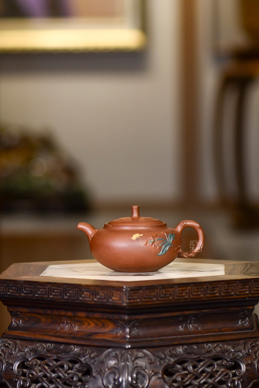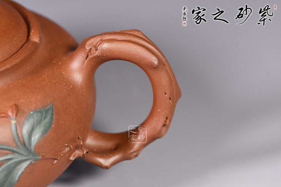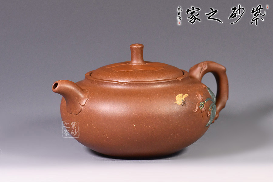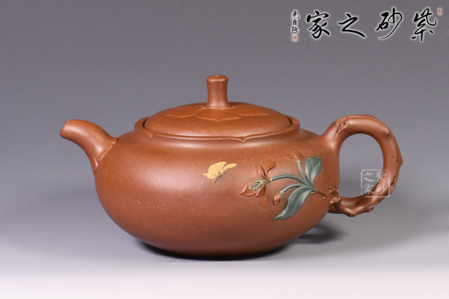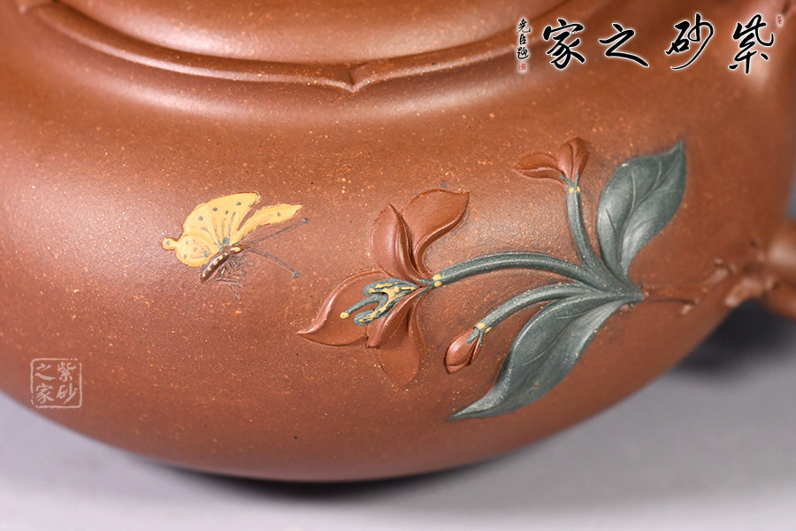 此壺采用清水泥制作而成,泥質(zhì)細膩,壺面光澤亮麗。壺身呈圓形扁狀,線條流暢,過渡自然。壺把似枝干,紋理細致,底部延伸出一支海棠花延伸至壺身,貼花生動,栩栩如生,蝴蝶翩翩起舞,聞香而來,制作工藝十分精湛。一彎嘴,出水流利。壺蓋印花,花蕊沿鈕,細節(jié)滿分。此壺造型精美,創(chuàng)意十足,是送禮收藏的不二之選。