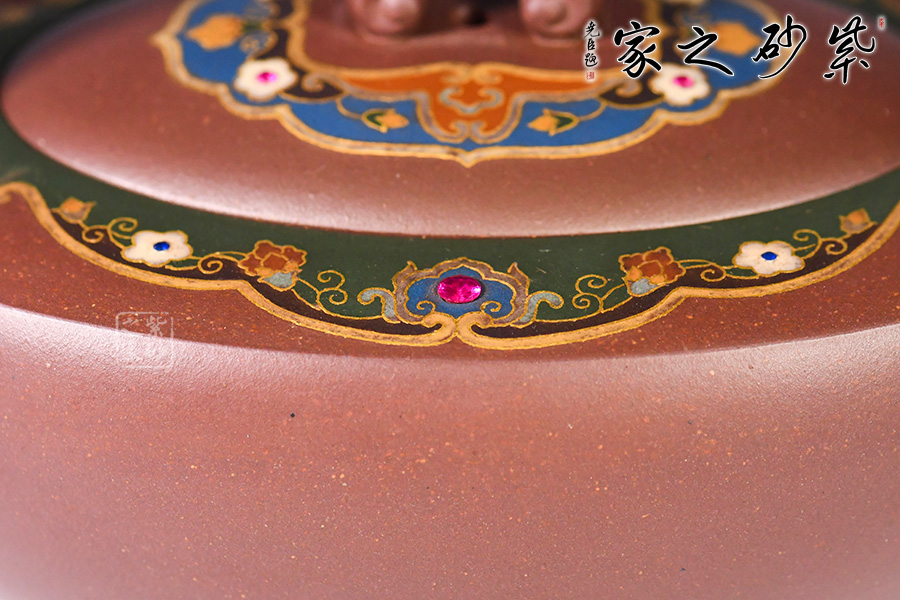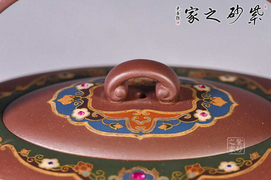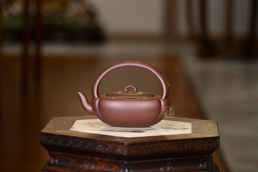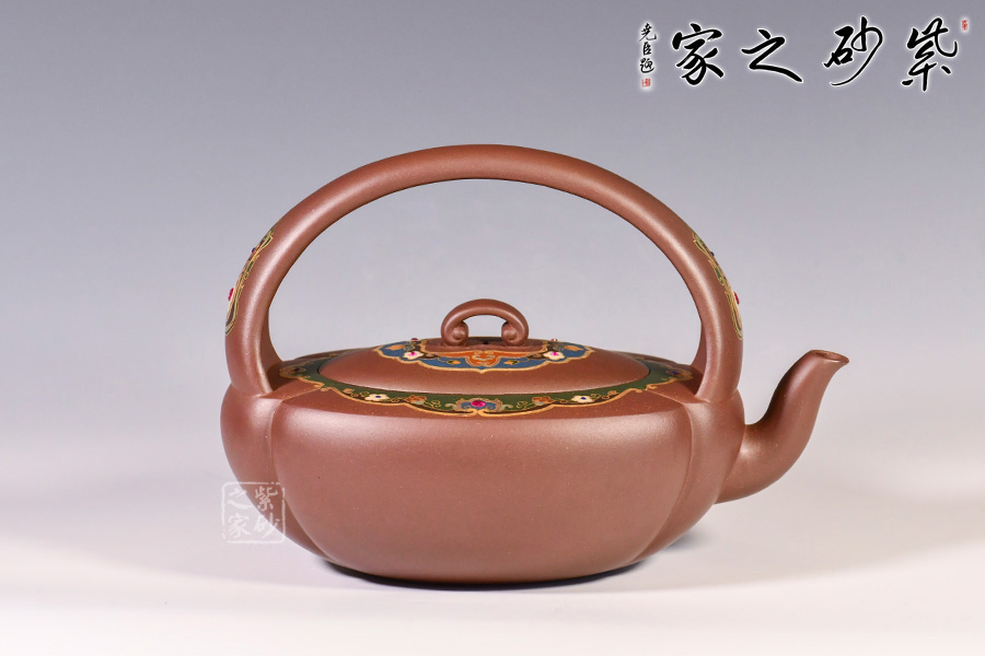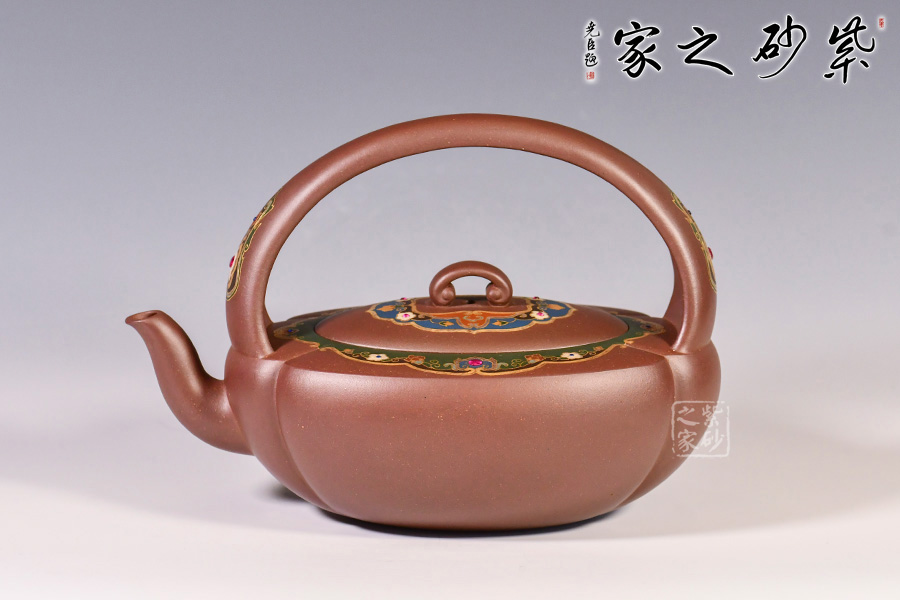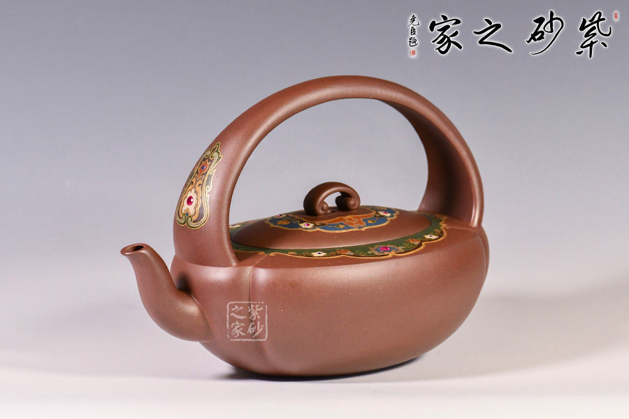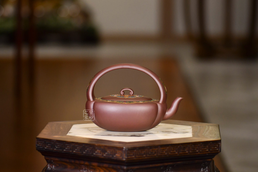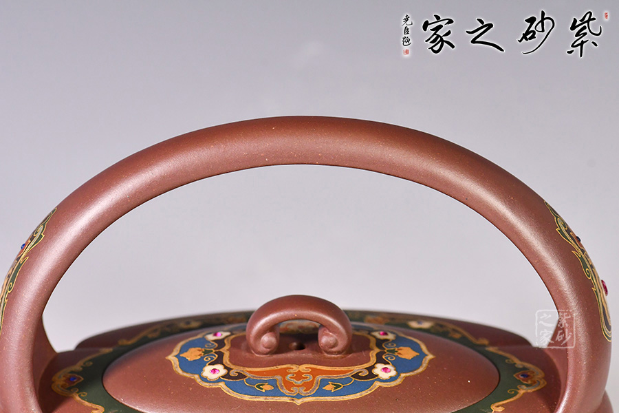 此壺采用原礦紫泥制成,泥質(zhì)純正細膩。壺身壺身似花瓣,線條流暢,擁有大氣之風(fēng)。 彩繪的繁花似錦裝飾壺蓋,增添了此壺的美觀性,此乃點睛之筆。拱橋形鈕,矗立于壺蓋,提綱挈領(lǐng)一般,確立了壺的“身姿”。提梁仿若一條曲線婉轉(zhuǎn)而成,輪廓清晰,線條流暢柔和,飄逸靈動。