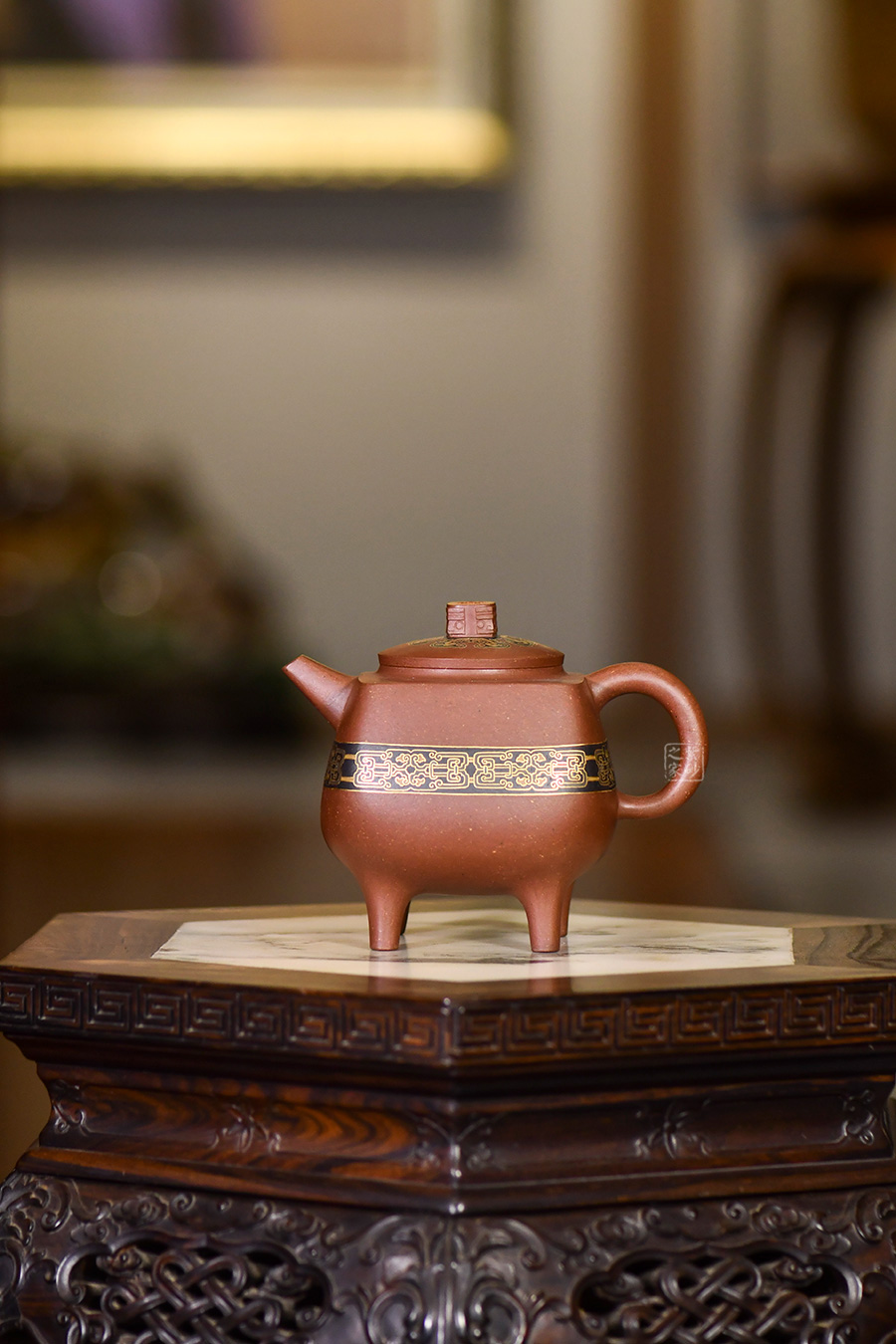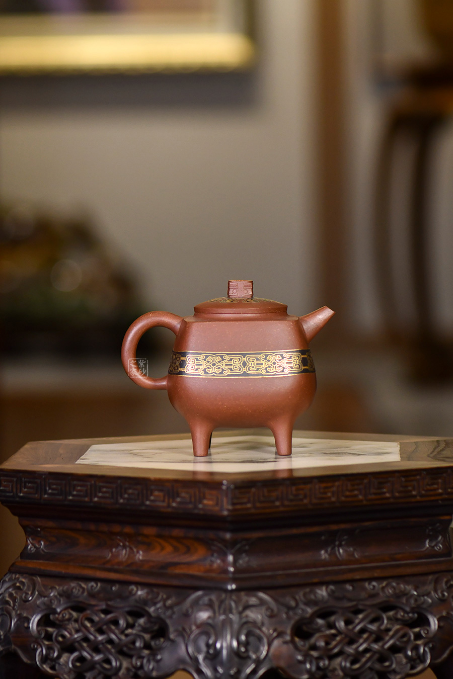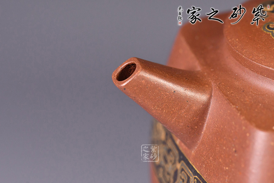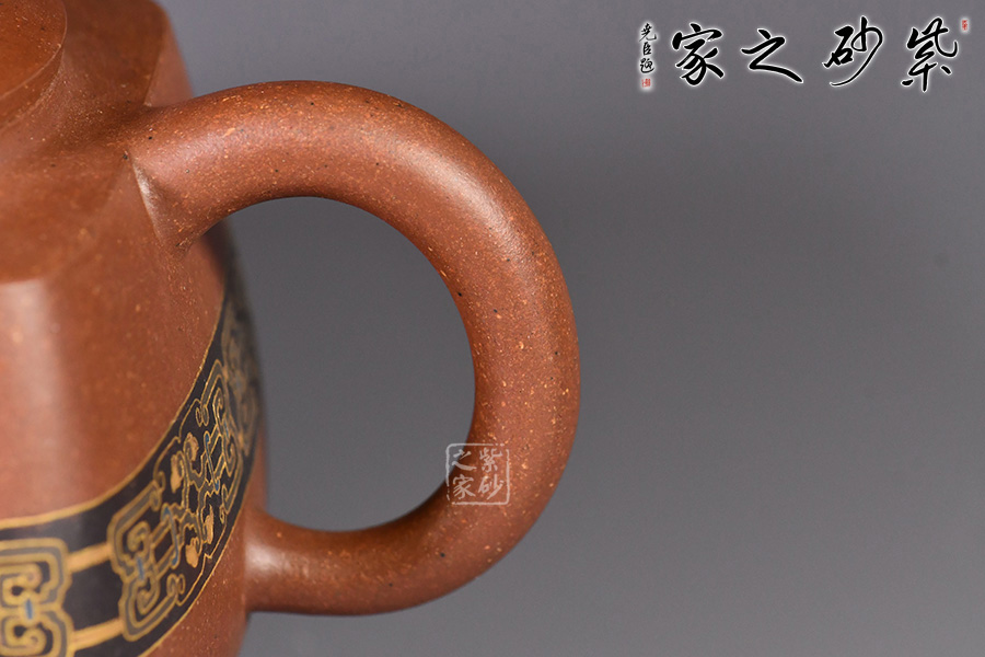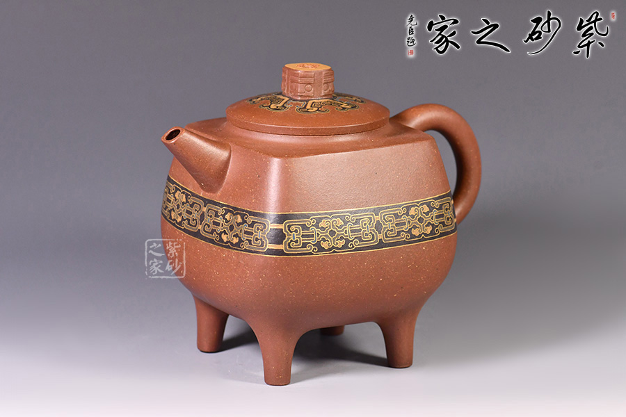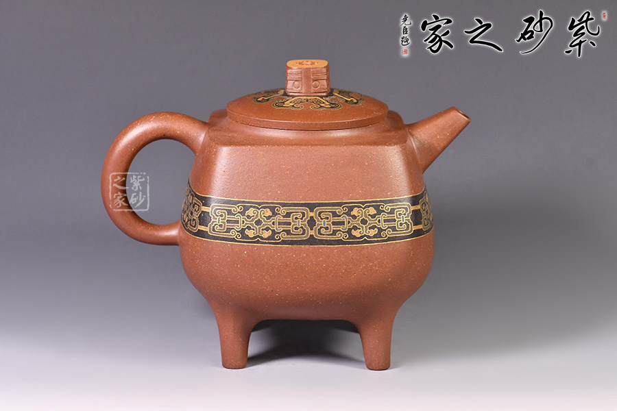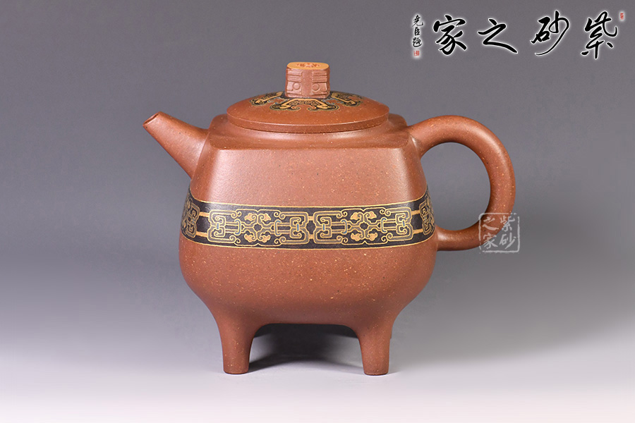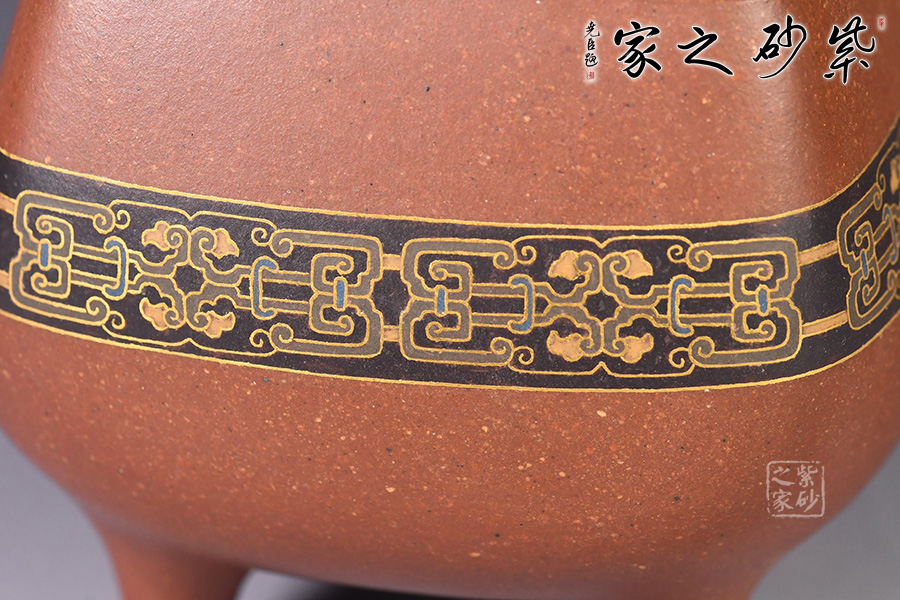 此壺造型像古代器皿“鼎”,鼎在古代被視為傳國(guó)重器、國(guó)家和權(quán)力的象征,“鼎”字也被賦予“顯赫”、“ 尊貴”、“盛大”等引申意義,壺名“崇禮”含義崇高的禮物,以鼎的造型來(lái)寓意崇高,實(shí)在是非常貼切了。壺身與壺鈕的花紋也是古代吉祥紋樣,壺身金絲鑲嵌與五色土填充,提升紫砂壺的雍容華貴之感,更讓其作品物超所值,珠光寶氣。