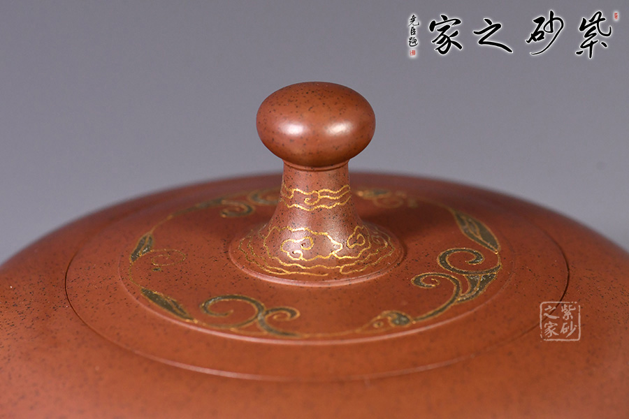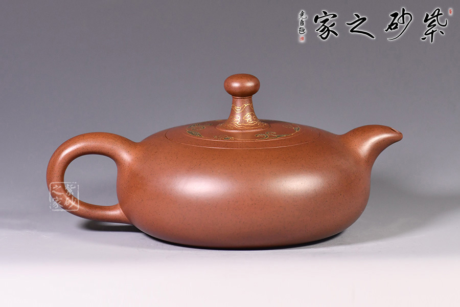 扁圓的壺身緩緩續(xù)出彎流嘴,如同連理枝,整合而溫婉,遙相對應的另一側,圓厚的壺把,沉穩(wěn)而拿捏舒適。壺蓋融于壺身,嵌蓋而置。隆起的壺鈕祥云描金裝飾,騰云駕霧與之壺蓋相互呼應,如同翩翩仙子徐步而來,貼合主題,美逸而不可方物!