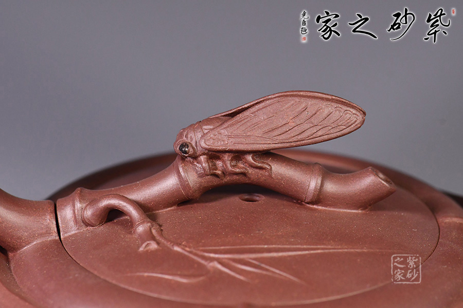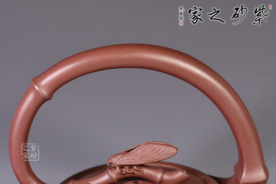 該壺創(chuàng)意十足,造型十分新穎。壺嘴是從壺的腰線中起伏延伸而成,充分顯示了靜中的活力。 竹節(jié)提梁,優(yōu)雅彎曲,從壺鈕再到壺把仿若一條曲線婉轉(zhuǎn)而成,輪廓清晰。鈕蓋獨具匠心,新穎別致,知了停于蓋上,栩栩如生。