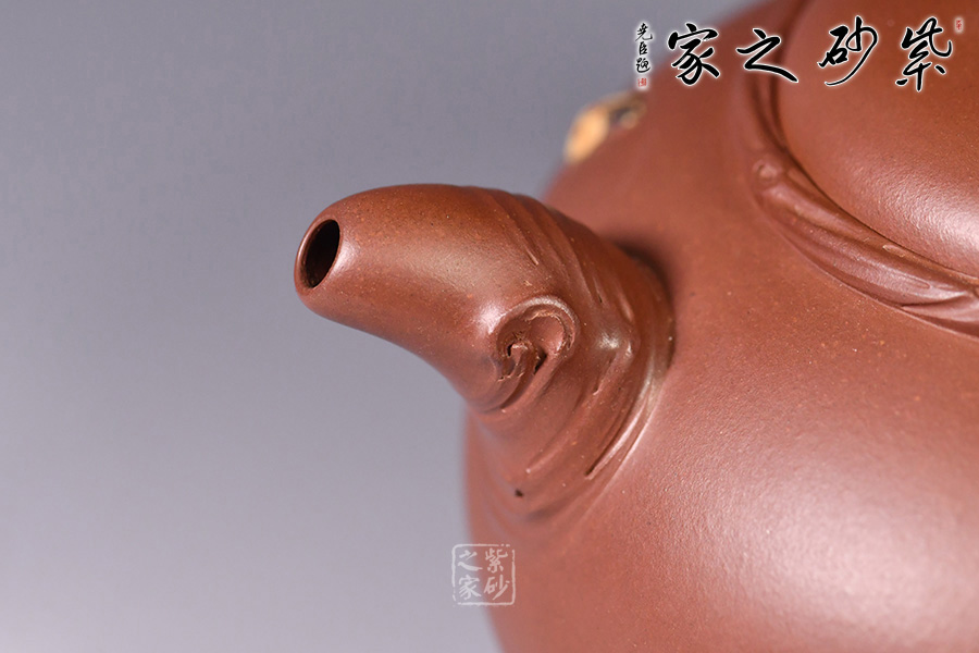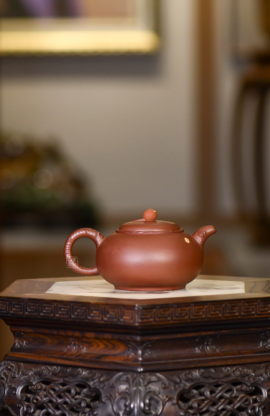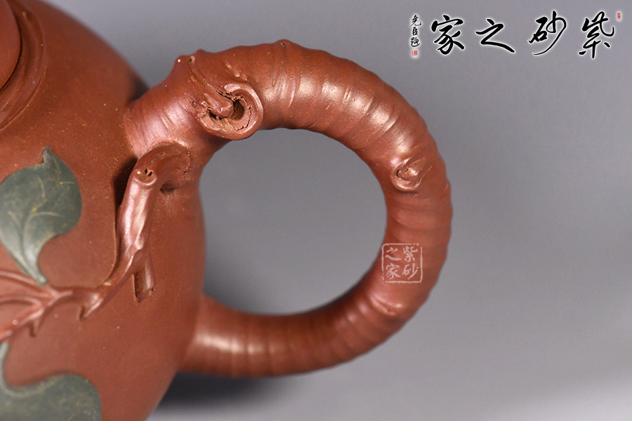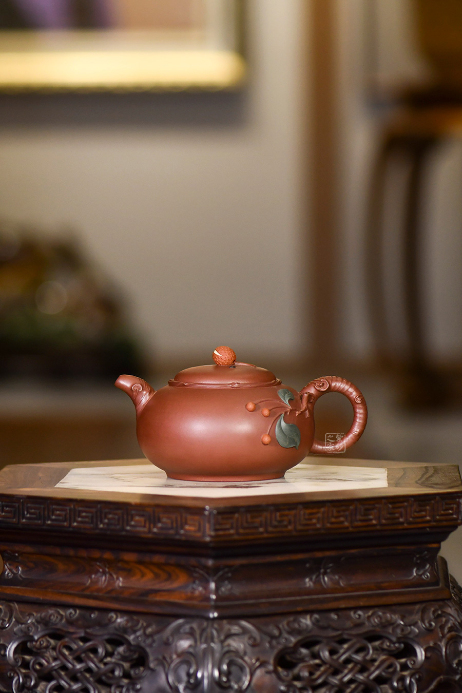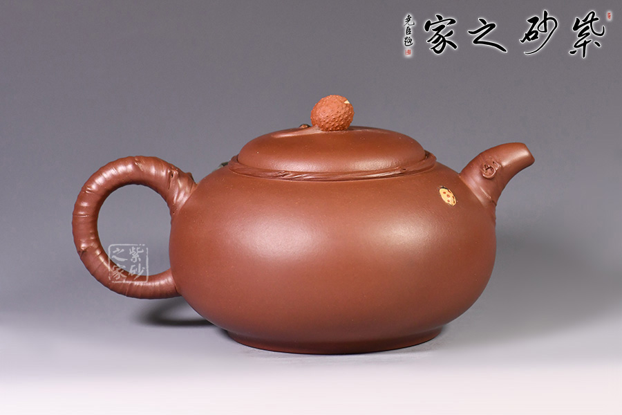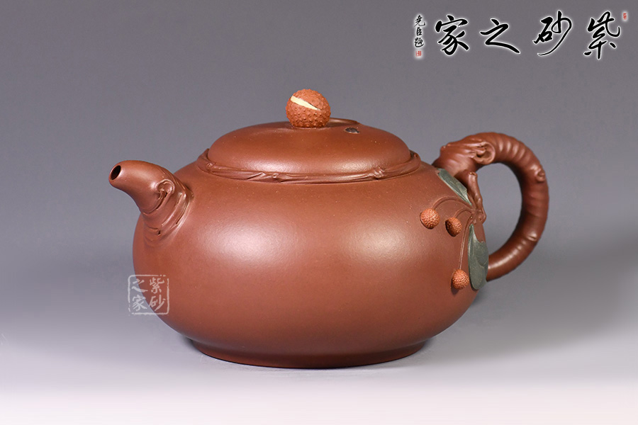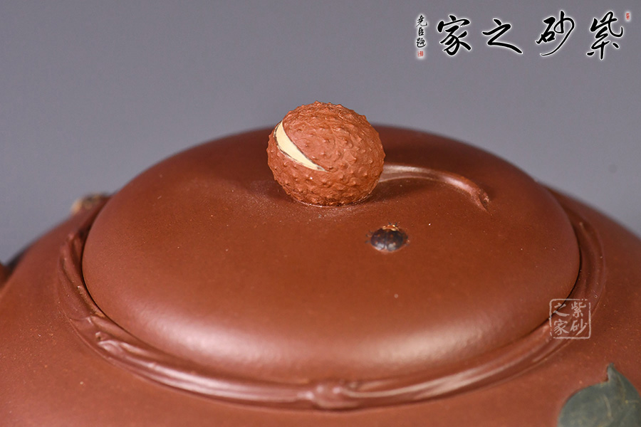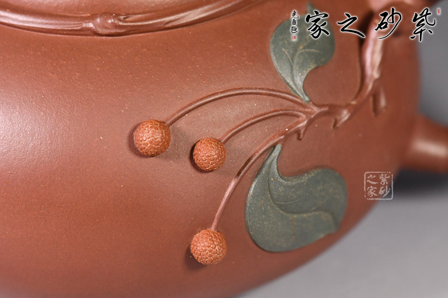 此壺是荔枝形象的花器,壺名也含有詩詞“一騎紅塵妃子笑,無人知是荔枝來”,壺鈕荔枝殼裂開的造型也像妃子在笑的神態(tài),露出潔白的果肉。壺口、壺把、壺嘴都是荔枝樹枝的紋路,栩栩如生,令人喜愛。