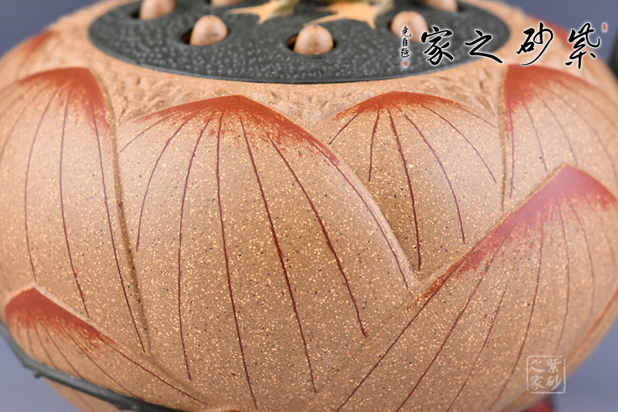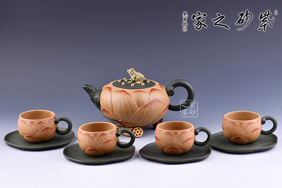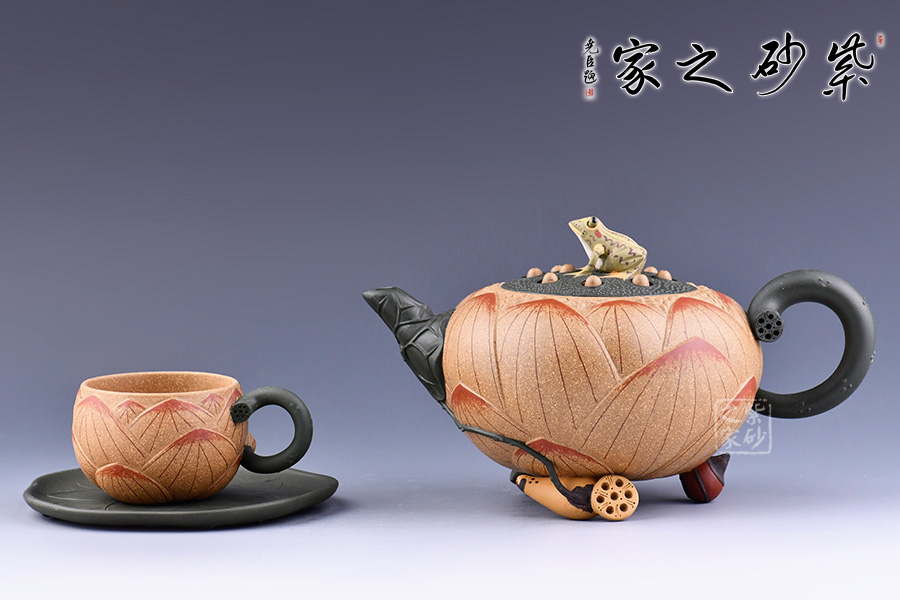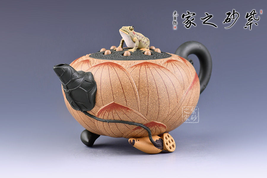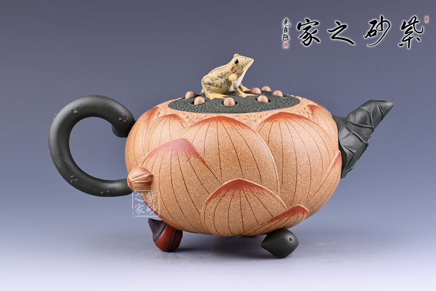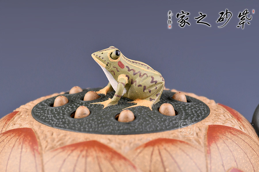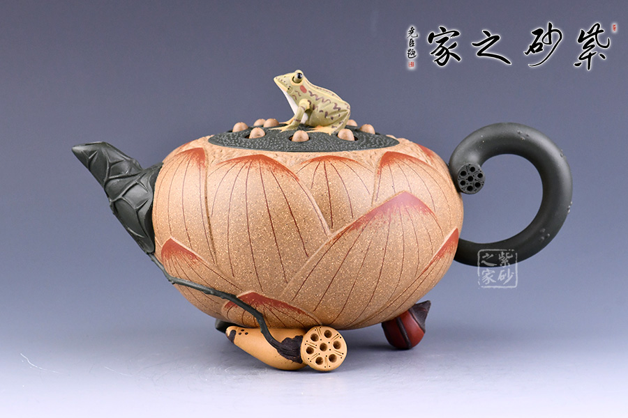 此青蛙荷花套壺,以一把綻放的荷花作壺身,卷裹的荷葉為壺嘴,以四周長著毛刺的荷花枝梗挽成壺把,荷花蓮蓬做壺蓋,壺鈕是一只栩栩如生,活靈活現(xiàn)的